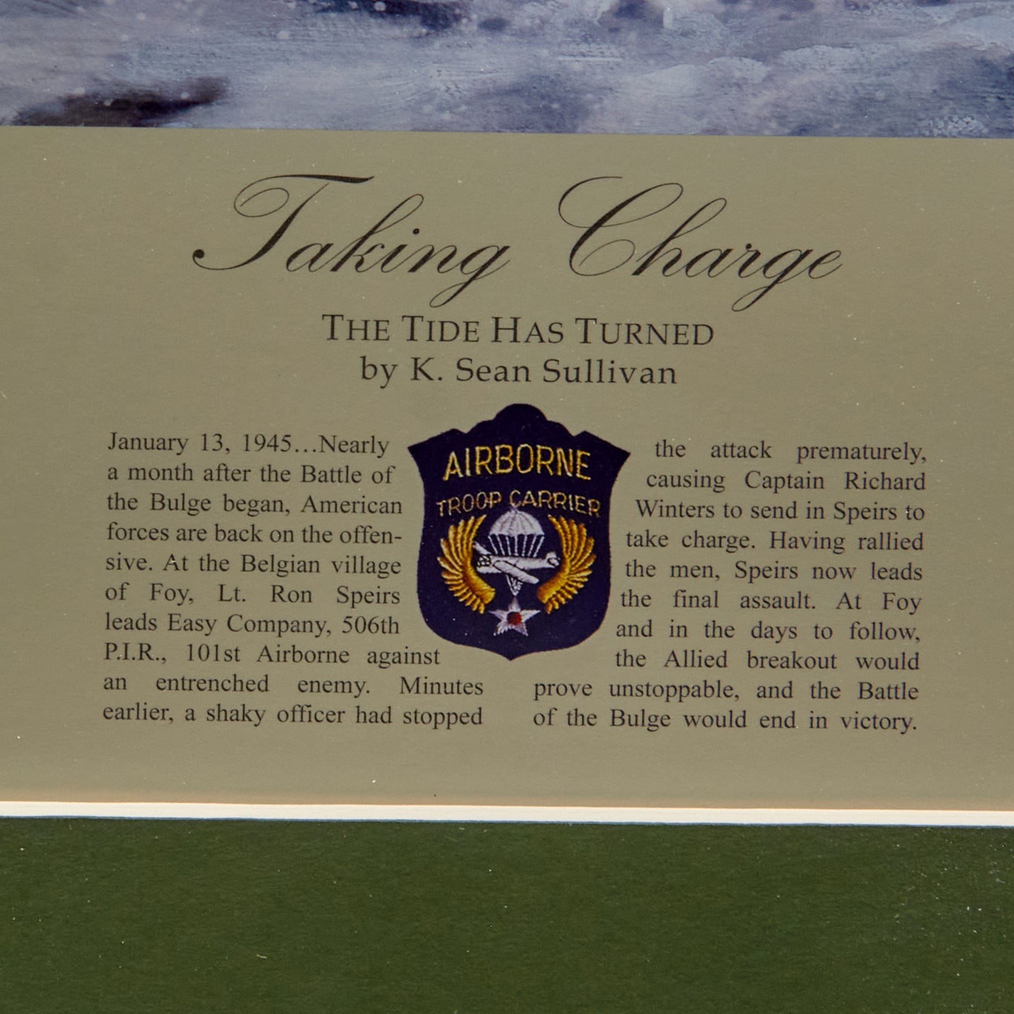 Original Item. Only One Available. This is a signed print of “Taking Charge: The Tide Has Turned” by K. Sean Sullivan, signed at the bottom by the artist and five crew members of the Enola Gay, including Pilot Paul W. Tibbets and Navigator Theodore J. Van Kirk. The frame is well-put together and the print is very clear. There are two additional signatures with this piece as well. This is a limited run print, number 442 out of 1000. The frame comes with the original page showing the biographies of the men who signed it, and the original protector that the print was shipped in when it was originally purchased.