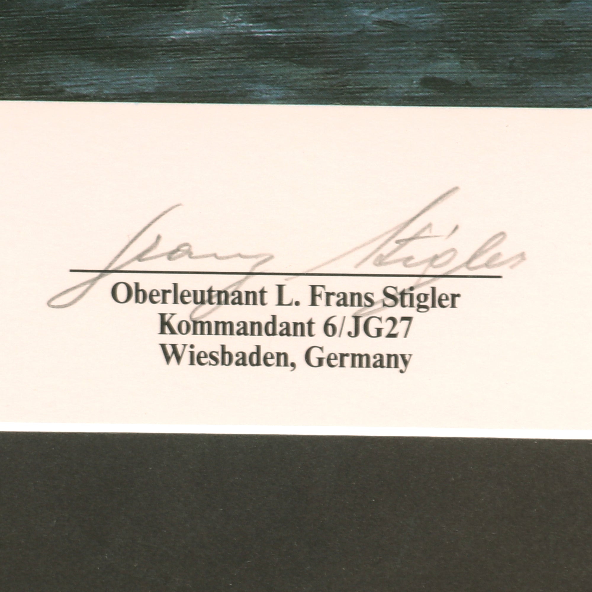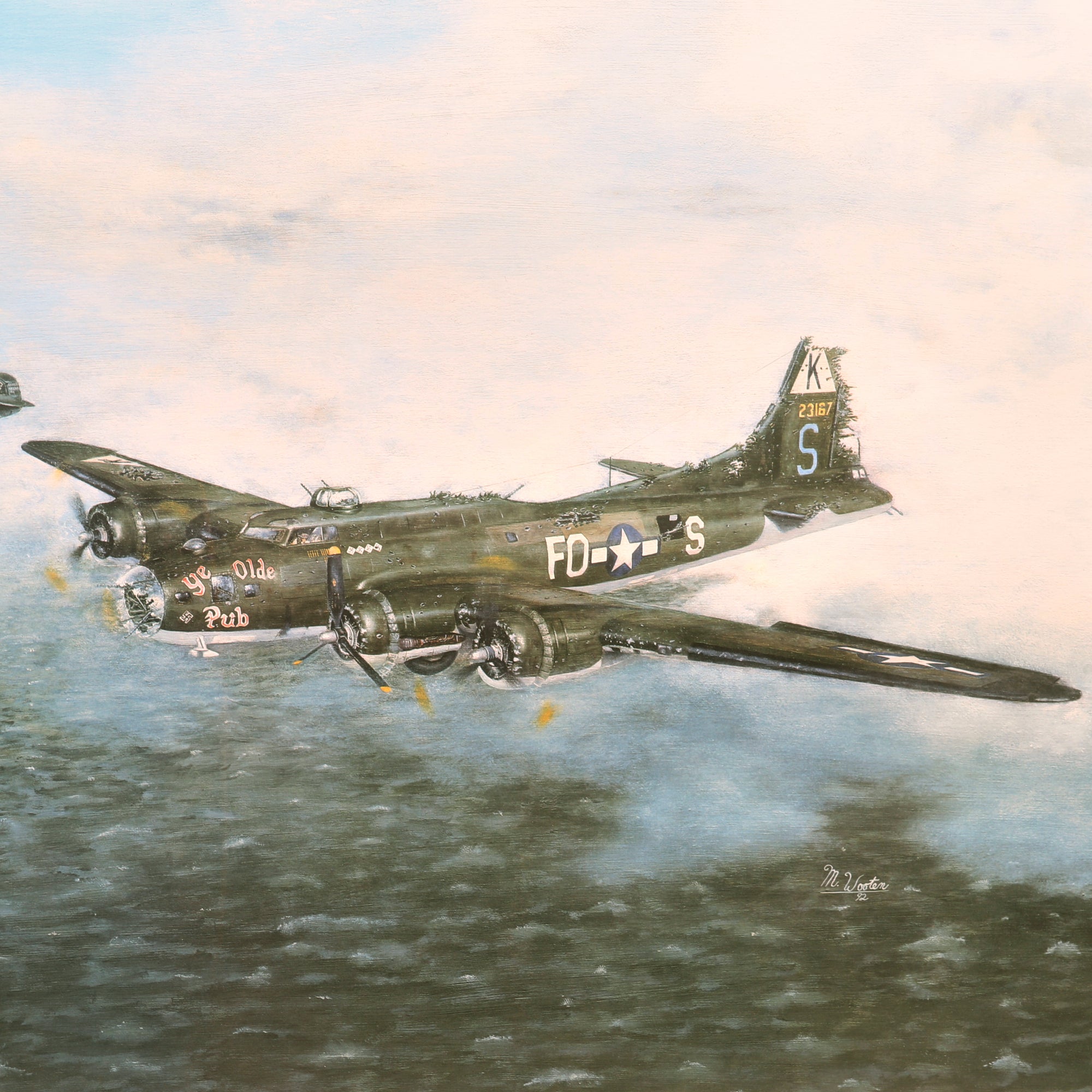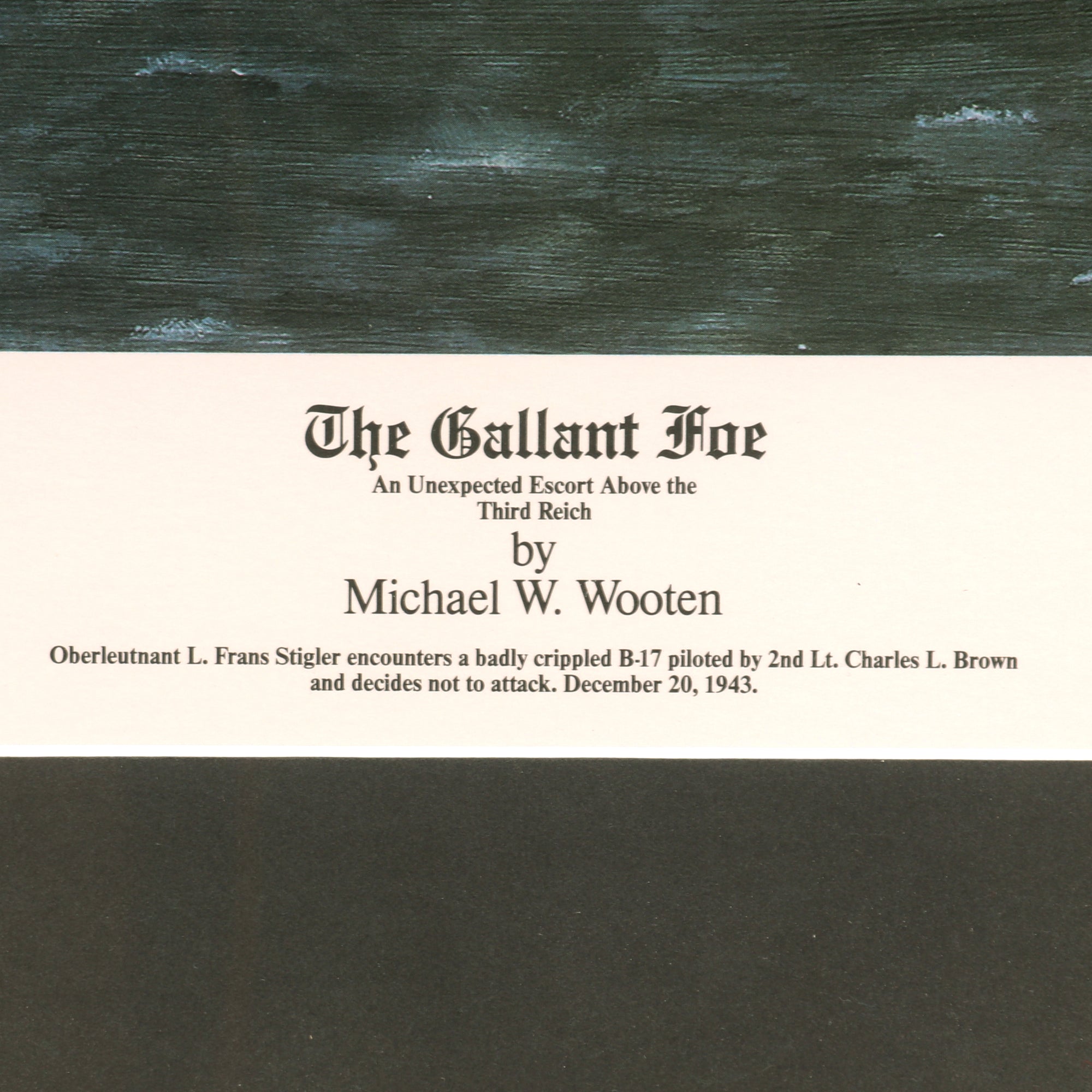 Original Item. Only One Available. This is a lovely signed print of “The Gallant Foe” by Michael W. Wooten. Numbered 198 out of 1000, this is a moving depiction of an incredible act of compassion shown by an enemy pilot. Oberleutnant L. Frans Stigler, commandant of 6/JG 27, encounters a badly cripple B-17 flown by 2nd Lt. Charles L. Brown of the 8th Air Force's 379th Bomb Group and, seeing badly wounded men aboard, escorts the bomber to the channel and then flies away.
