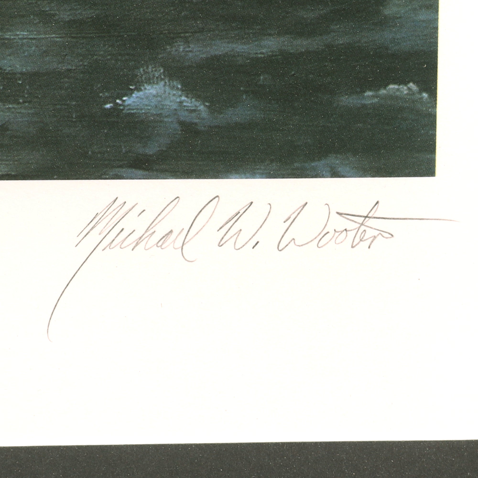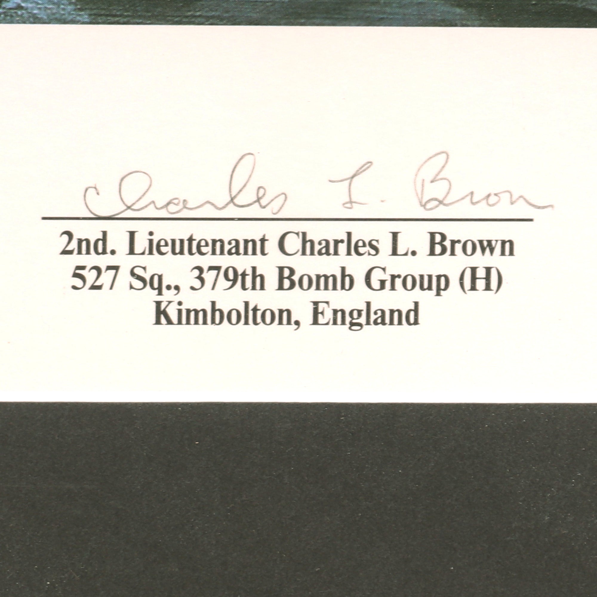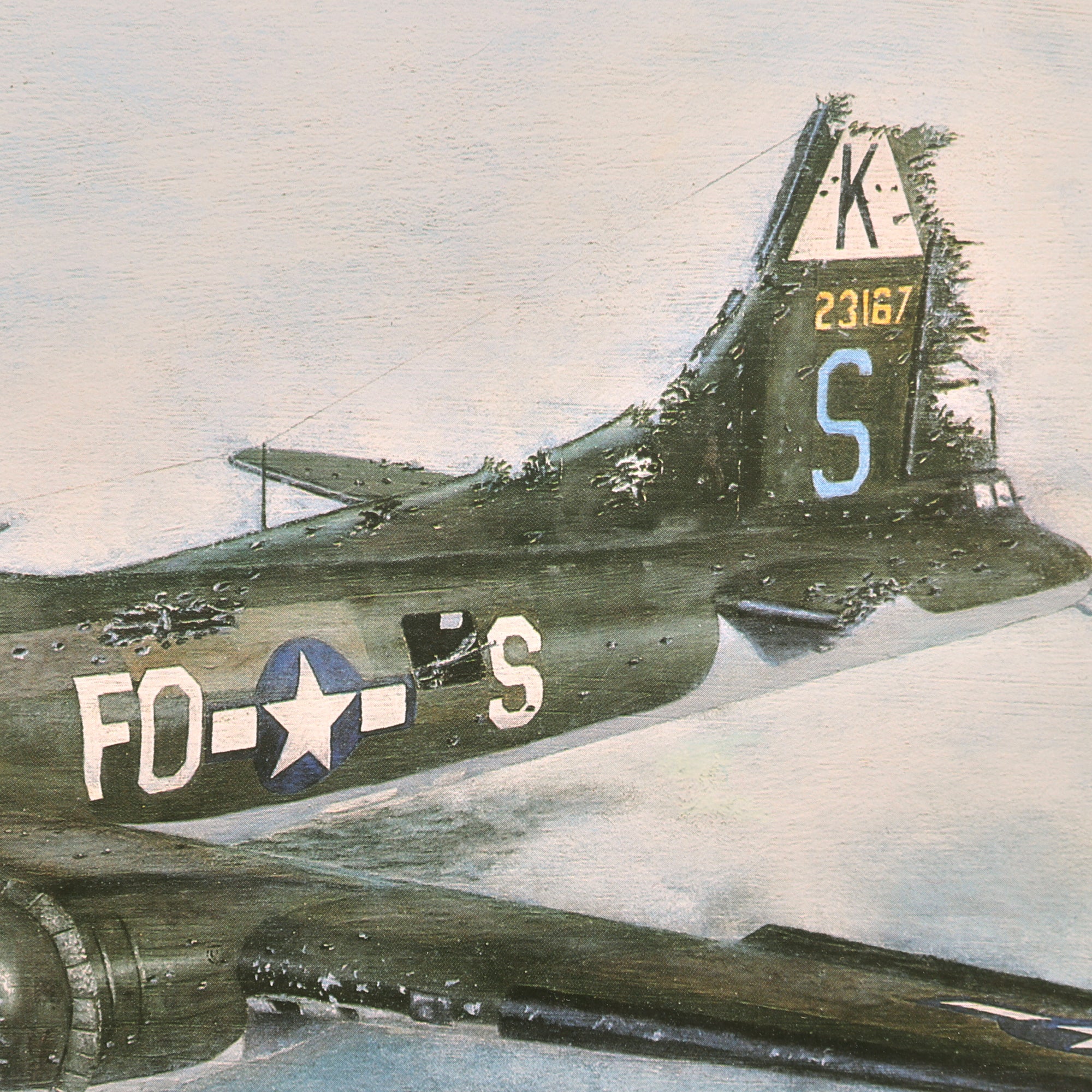 Original Item. Only One Available. This is a lovely signed print of “The Gallant Foe” by Michael W. Wooten. Numbered 198 out of 1000, this is a moving depiction of an incredible act of compassion shown by an enemy pilot. Oberleutnant L. Frans Stigler, commandant of 6/JG 27, encounters a badly cripple B-17 flown by 2nd Lt. Charles L. Brown of the 8th Air Force's 379th Bomb Group and, seeing badly wounded men aboard, escorts the bomber to the channel and then flies away.
