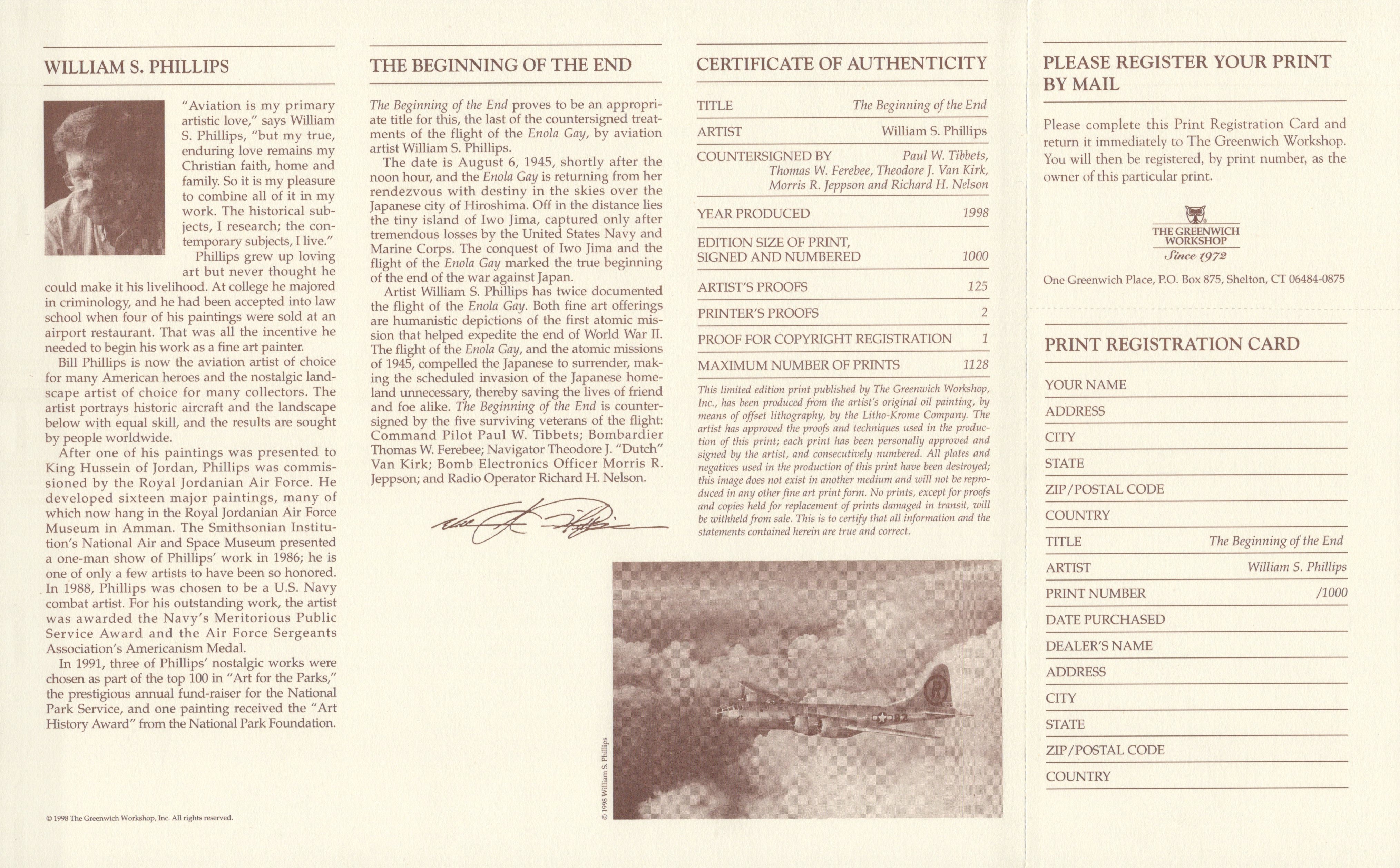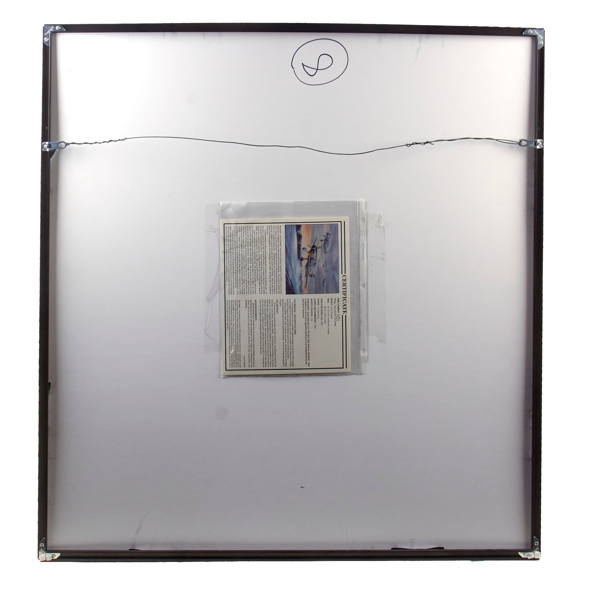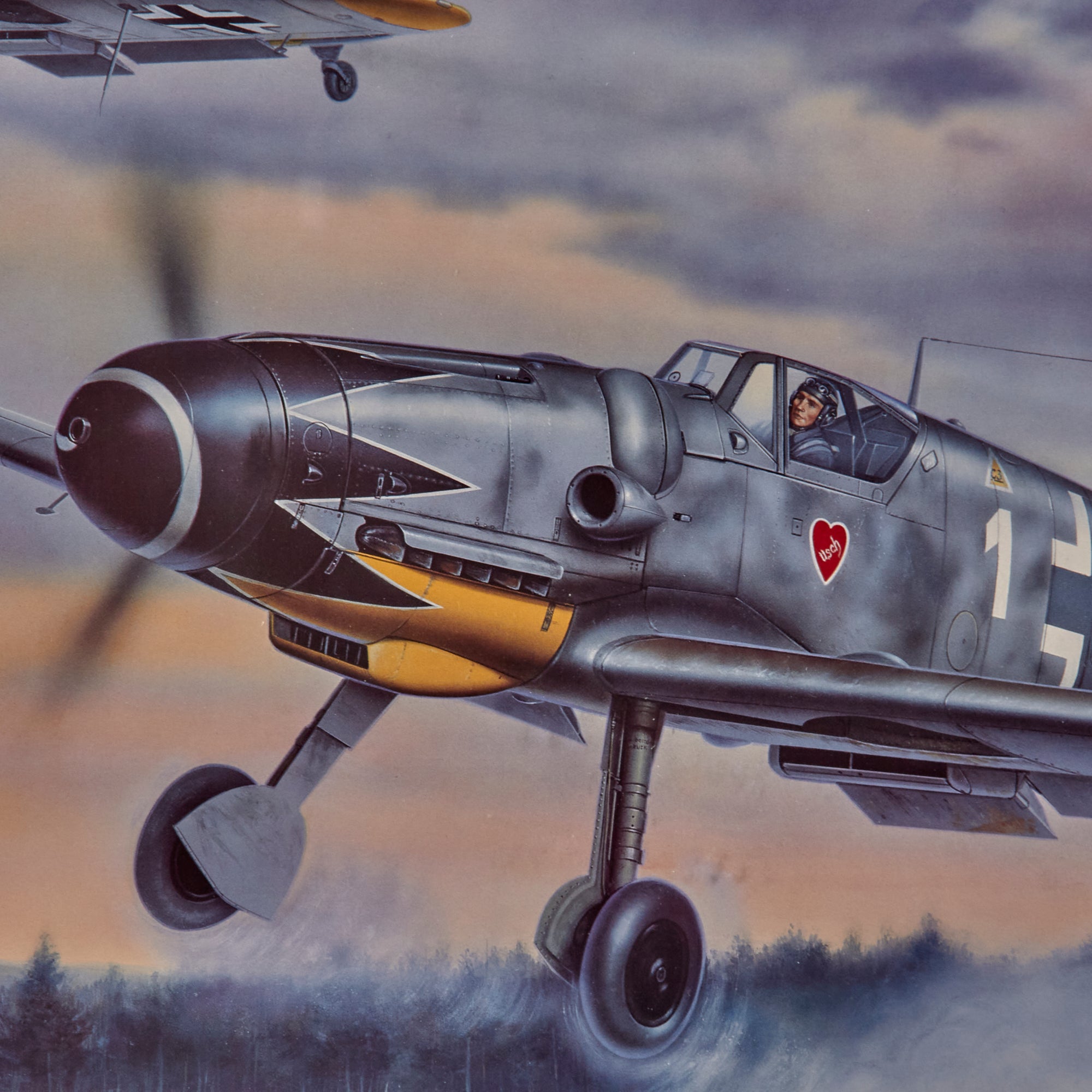 The print is signed by the artist and Luftwaffe pilot Oberst Erich Hartmann - one of the most successful fighter ace in the history of aerial warfare. The frame measures 31 ¼ x 34 ¼” and is in great shape. It comes with a certificate of authenticity on the back. The bottom of the frame has three additional signatures under photos of the signers, all three being Knight’s Cross Recipients. They are: