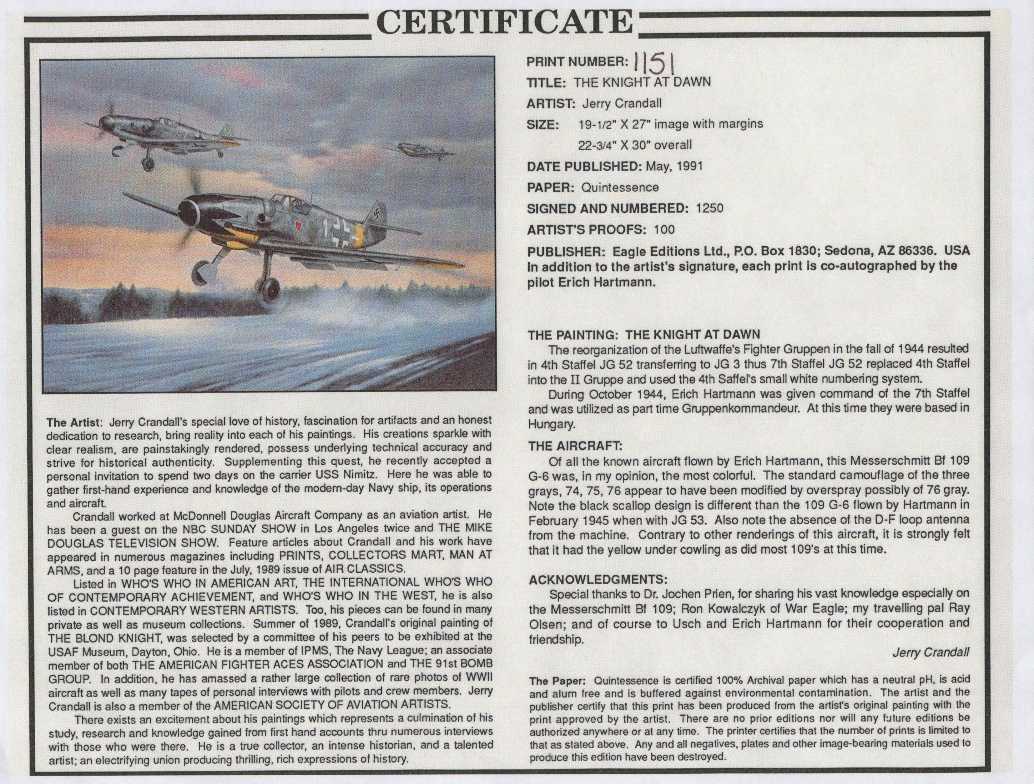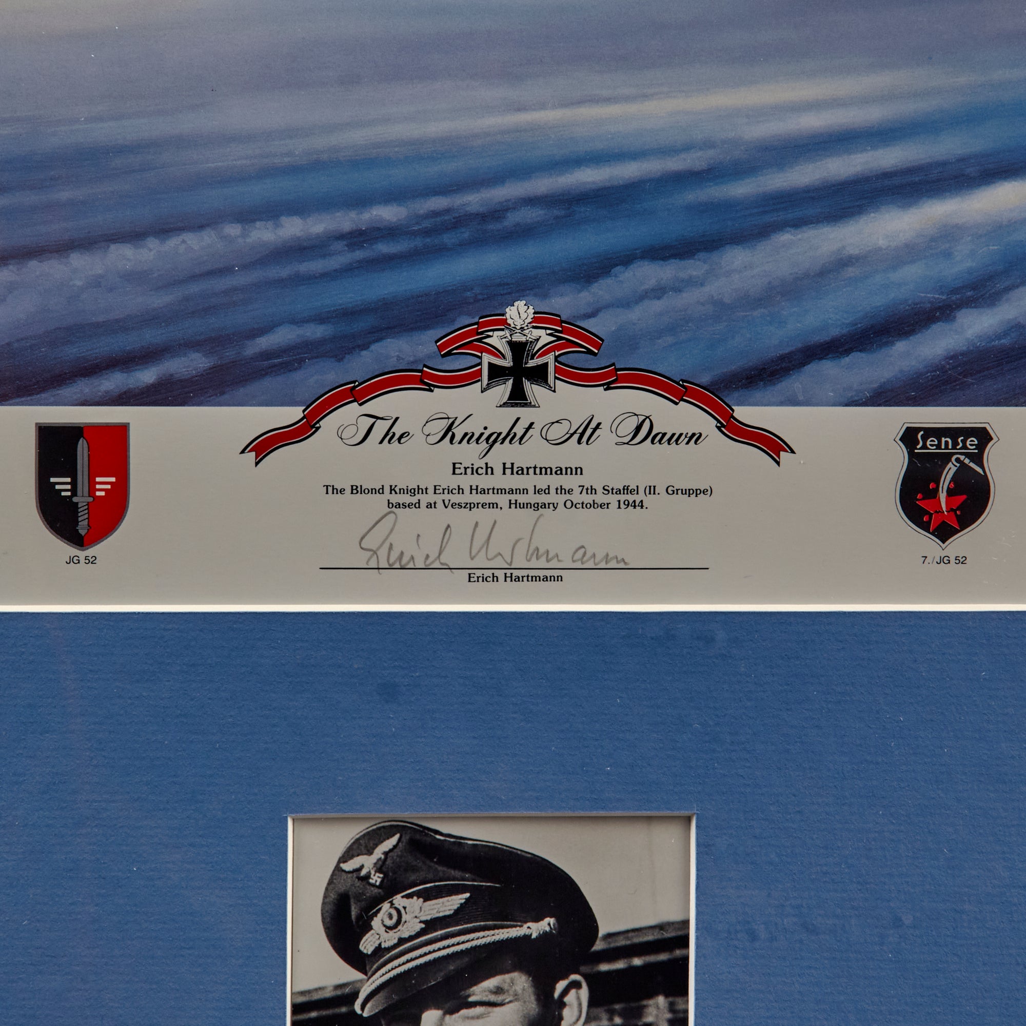 Original Item. Only One Available. This is a signed print of “The Knight at Dawn” by Jerry Crandall, signed at the bottom by Erich Hartmann, the world's top-scoring fighter pilot, who achieved 352 aerial victories during World War II, a feat that is never likely to be surpassed. Flying the legendary Messerschmitt Me109, Hartmann was invincible in the air, achieving his phenomenal success during no fewer than 1400 combat missions. The frame is gorgeously put together and the print is very clear. This is a limited run print, 1151/1250. The frame also includes at the bottom three additional signatures of Knight’s Cross Recipients.