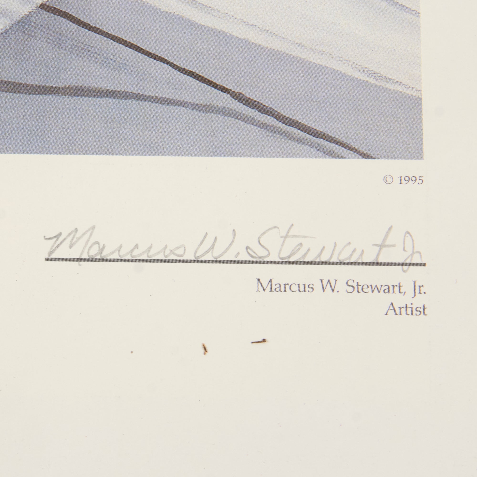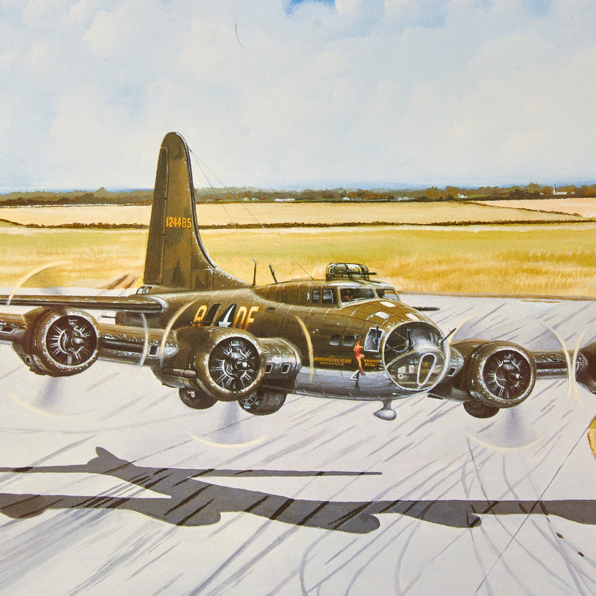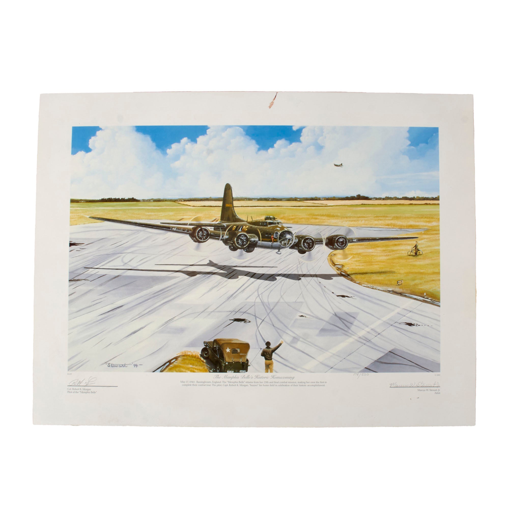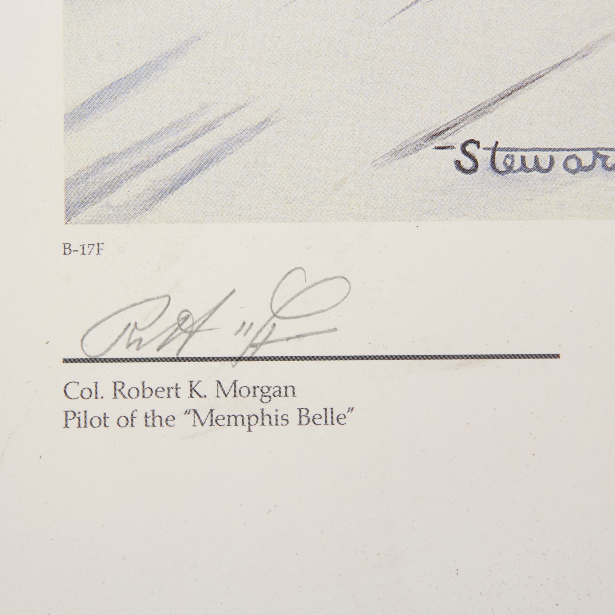 Original Item. Only One Available. This is a signed print of “The Memphis Belle’s Historic Homecoming” by Marcus W. Stewart, signed at the bottom by Colonel Robert Morgan, Pilot of Memphis Belle. This is a limited run print, number 178 out of 500.