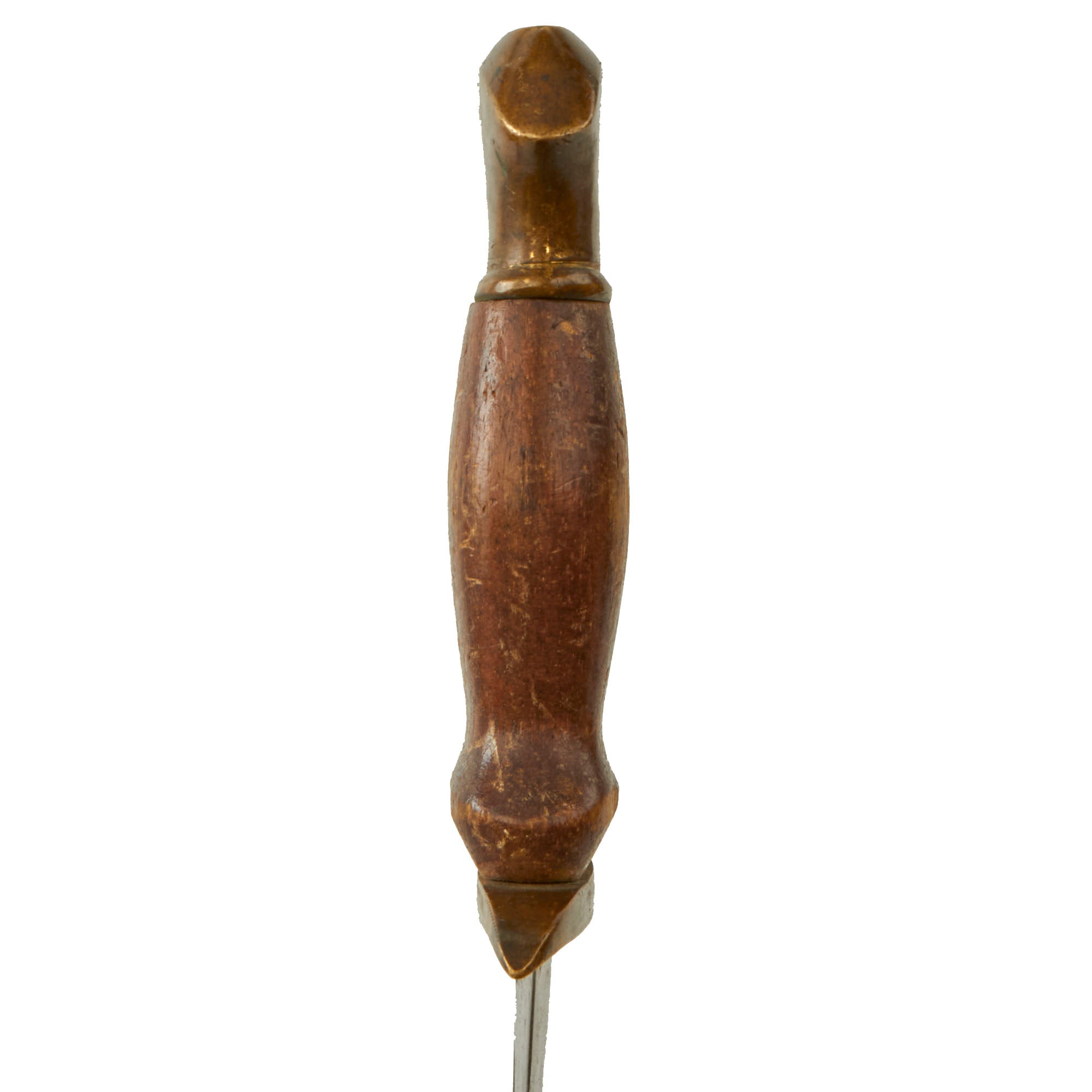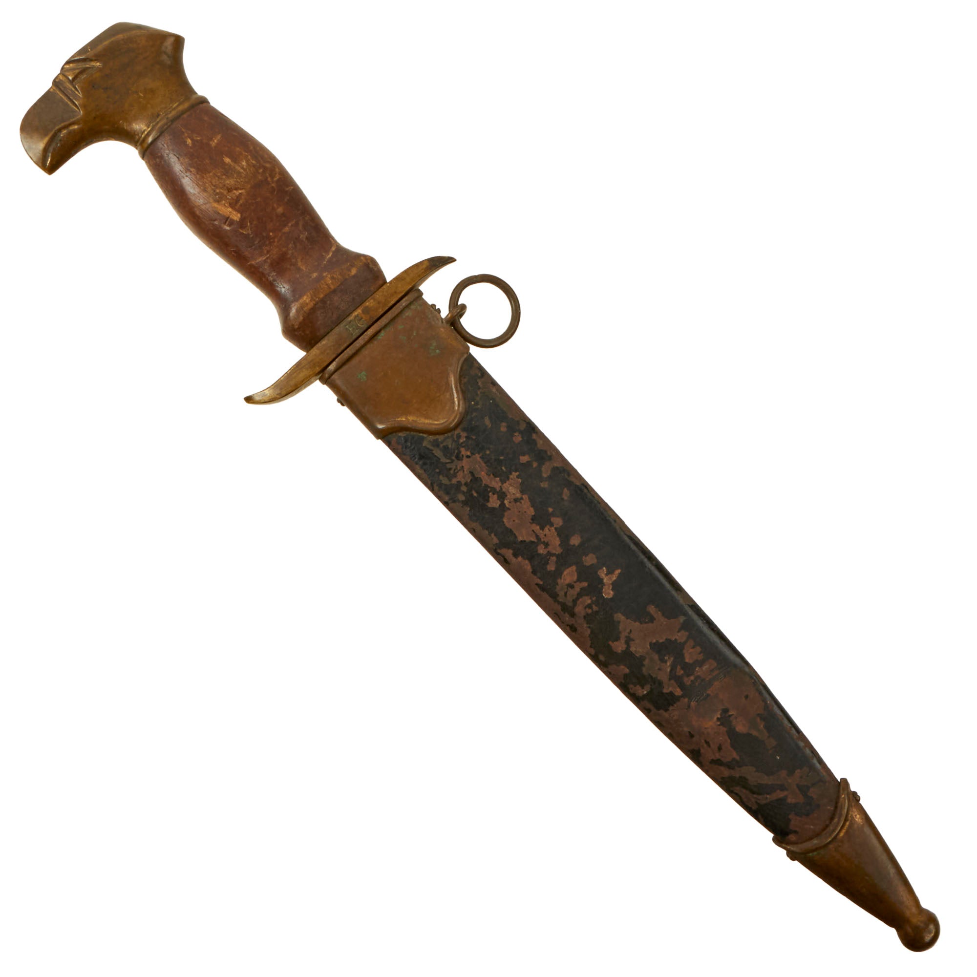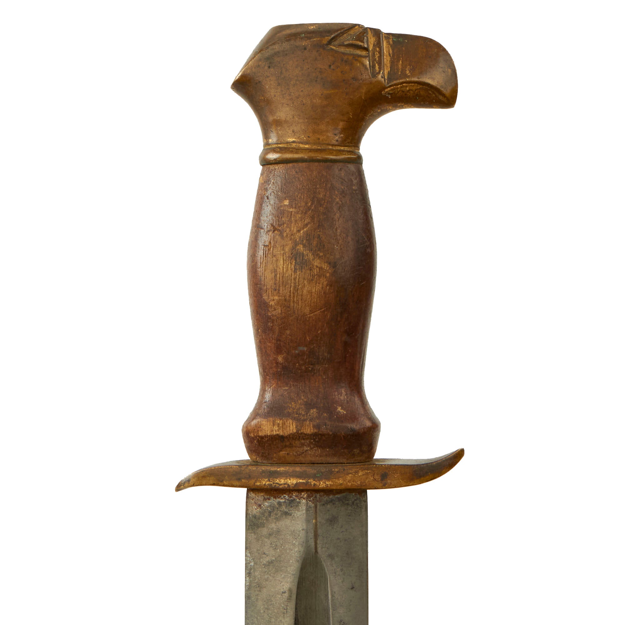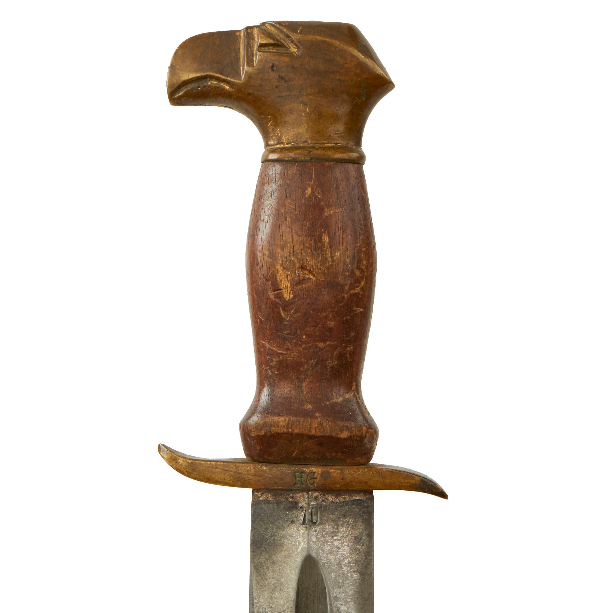 Original Item. Only One Available. This is a great example of an extremely scarce WWII Slovakian Hlinka Guard Dagger. The Hlinka Guard has often been called the “Slovak SS” due to having been trained by the German SS to provide internal military police duties in Slovakia. This was a very small group, roughly 3500 men, making this a scarce example.This example is in overall fair condition, with some sharpening on the blade and heavy wear across the hilt and scabbard. There is also some oxidation at the ricasso. The dagger features a carbon steel blade with a wide central fuller running the majority of the length of each side of the blade. The number “70” is stamped onto the obverse ricasso.The blade sits securely within a multi-piece hilt with a gilded bronze crossguard, the obverse of which is stamped with initials “HG” (“Hlinkova garda/Hlinka Guard). The handle is composed of a single piece of lacquered dark brown wood. It is completed with a gilded bronze pommel which takes the form of a minimalist eagle’s head with a hooked beak which, in combination with the curved handle and hooked crossguard, provides a secure and comfortable grip. There is some heavy wear to the entire hilt with some finish loss to the grip.The dagger is accompanied by its original scabbard, constructed of a black painted magnetic metal shaft. Bronze fixtures are secured to both the tip and throat, with a loop emanating from the latter for the accommodation of a hanger. There is very heavy loss to the black paint on the body of the scabbard.This is an unbelievably scarce dagger, ready for further research and display.Specifications:Blade Length: 8 ⅝”Overall length: 13 ⅝”Crossguard: 3”Scabbard Length: 9 ⅝”