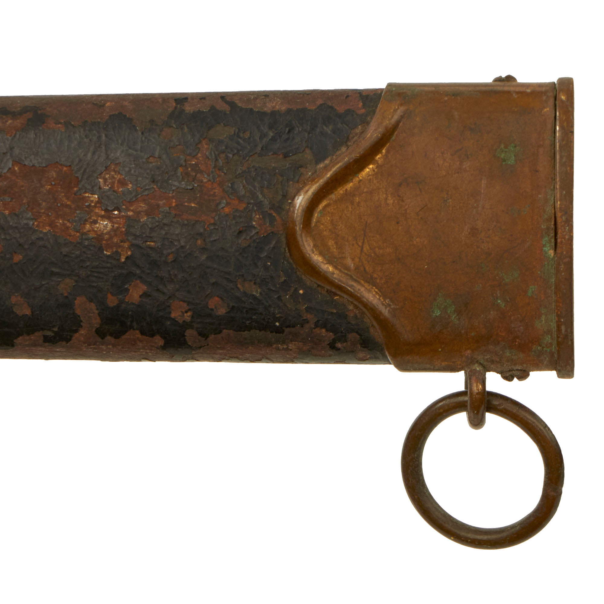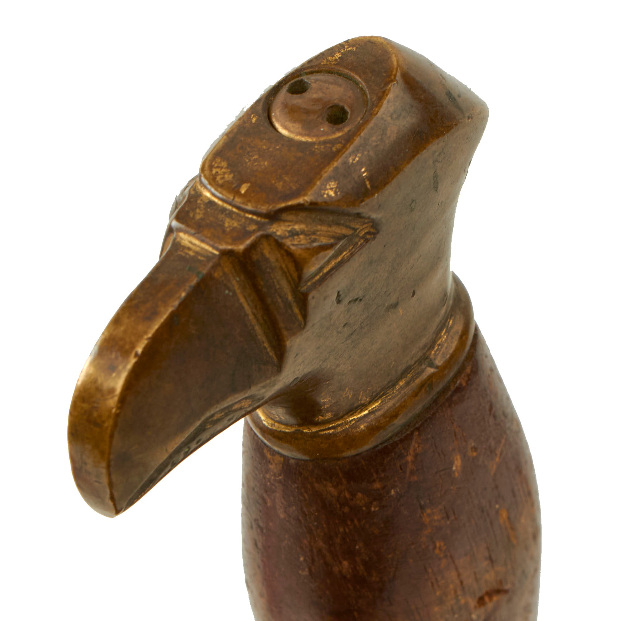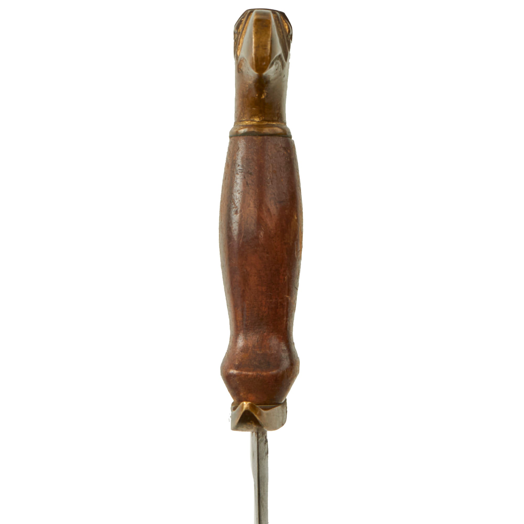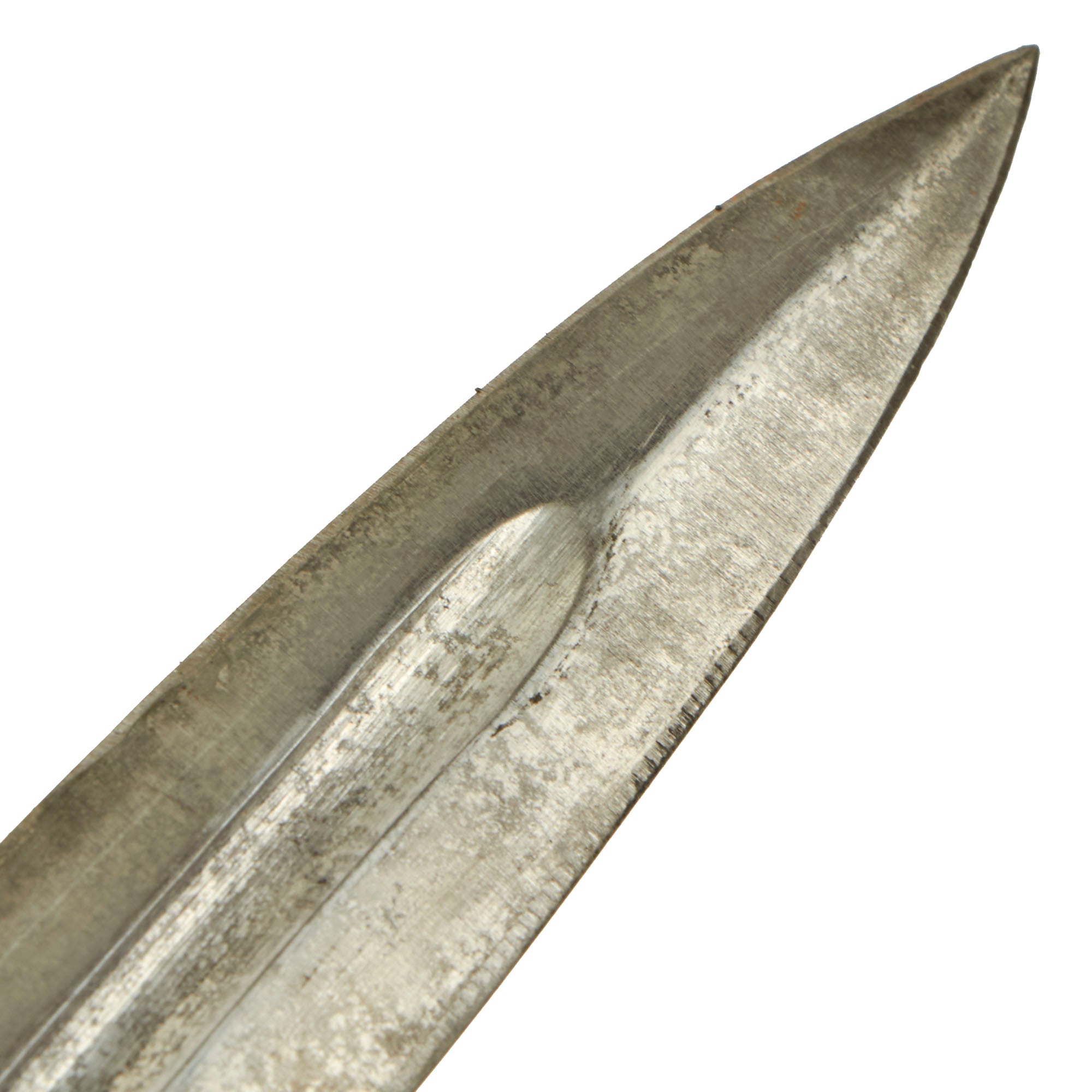 Original Item. Only One Available. This is a great example of an extremely scarce WWII Slovakian Hlinka Guard Dagger. The Hlinka Guard has often been called the “Slovak SS” due to having been trained by the German SS to provide internal military police duties in Slovakia. This was a very small group, roughly 3500 men, making this a scarce example.This example is in overall fair condition, with some sharpening on the blade and heavy wear across the hilt and scabbard. There is also some oxidation at the ricasso. The dagger features a carbon steel blade with a wide central fuller running the majority of the length of each side of the blade. The number “70” is stamped onto the obverse ricasso.The blade sits securely within a multi-piece hilt with a gilded bronze crossguard, the obverse of which is stamped with initials “HG” (“Hlinkova garda/Hlinka Guard). The handle is composed of a single piece of lacquered dark brown wood. It is completed with a gilded bronze pommel which takes the form of a minimalist eagle’s head with a hooked beak which, in combination with the curved handle and hooked crossguard, provides a secure and comfortable grip. There is some heavy wear to the entire hilt with some finish loss to the grip.The dagger is accompanied by its original scabbard, constructed of a black painted magnetic metal shaft. Bronze fixtures are secured to both the tip and throat, with a loop emanating from the latter for the accommodation of a hanger. There is very heavy loss to the black paint on the body of the scabbard.This is an unbelievably scarce dagger, ready for further research and display.Specifications:Blade Length: 8 ⅝”Overall length: 13 ⅝”Crossguard: 3”Scabbard Length: 9 ⅝”