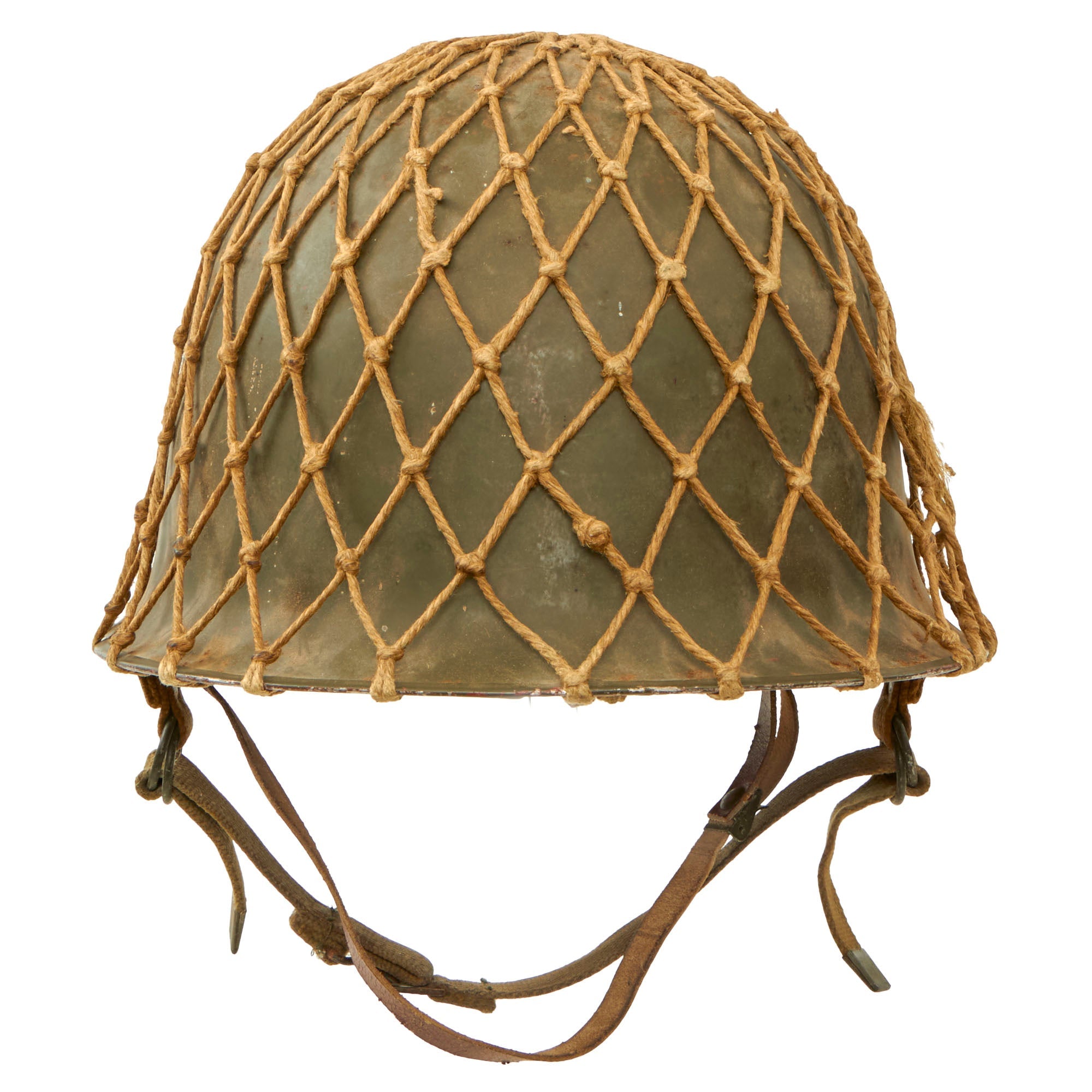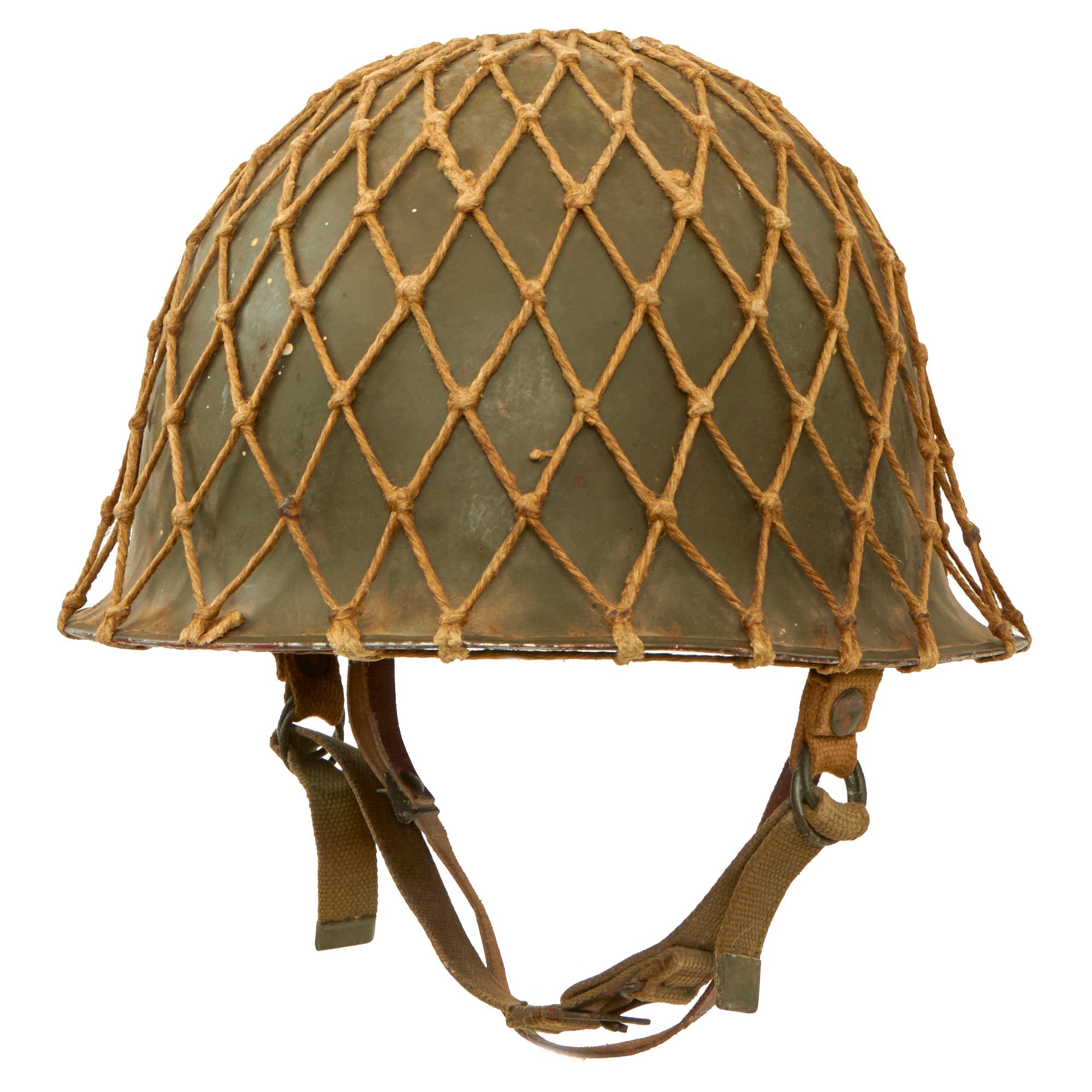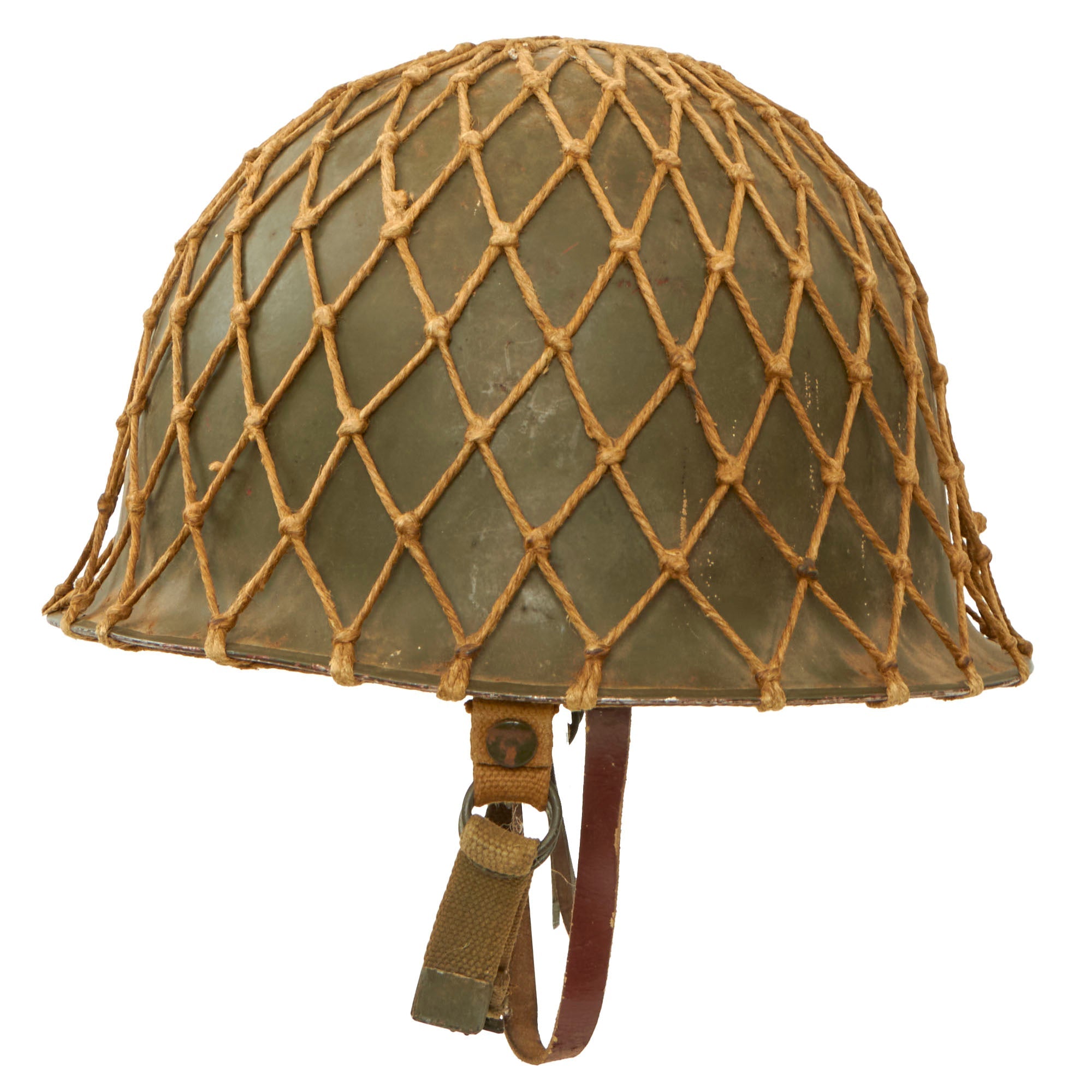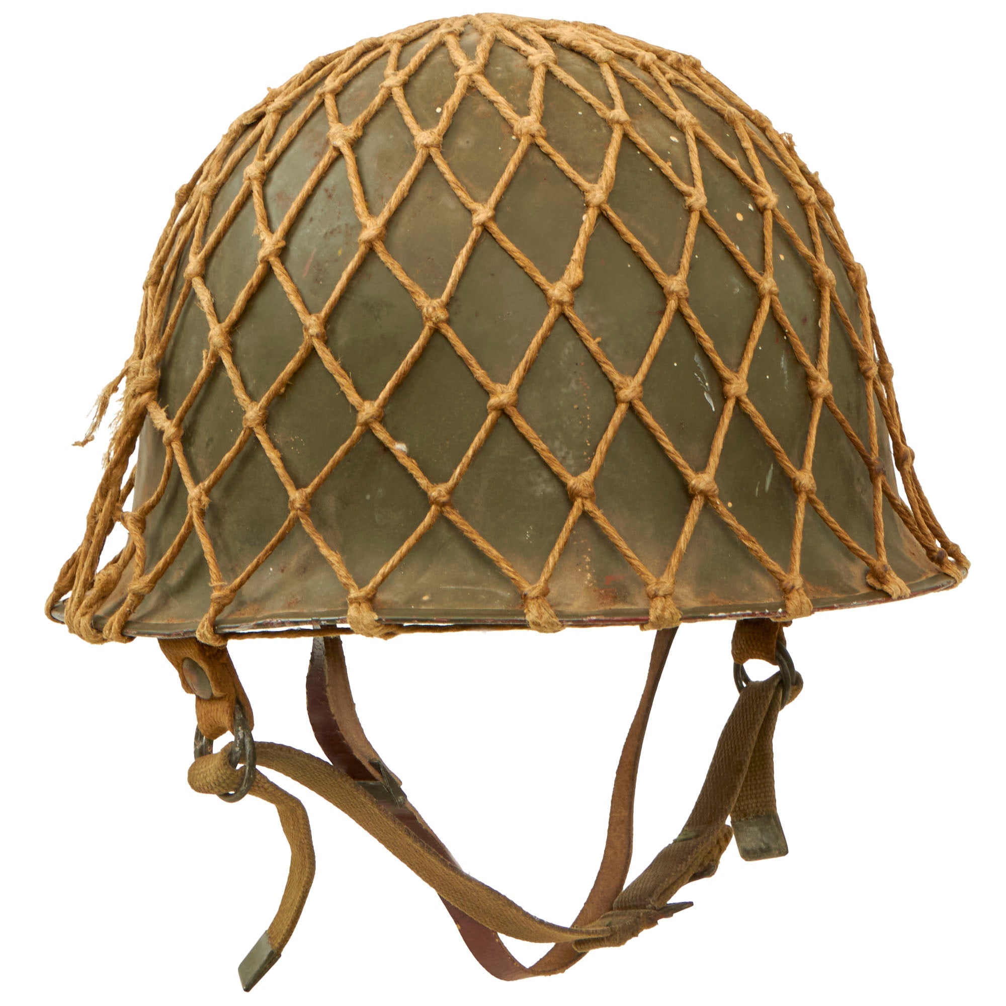 This is an M1963 helmet utilized by the SADF. The helmet has an original period-applied net that unfortunately makes it impossible to remove the liner. The liner is in good shape overall without many flaws. The paint of the helmet is also in good shape. The chinstrap is fully retained.