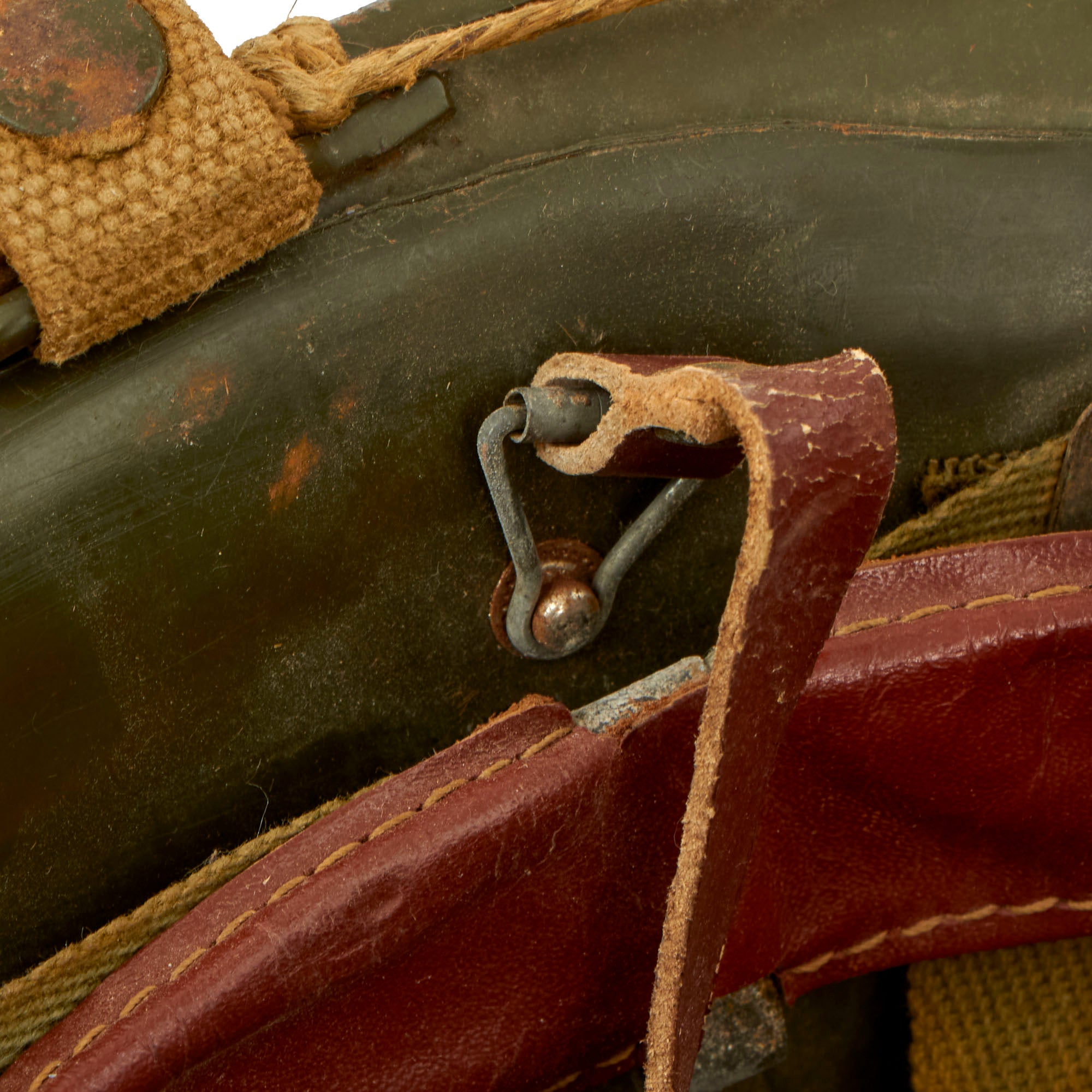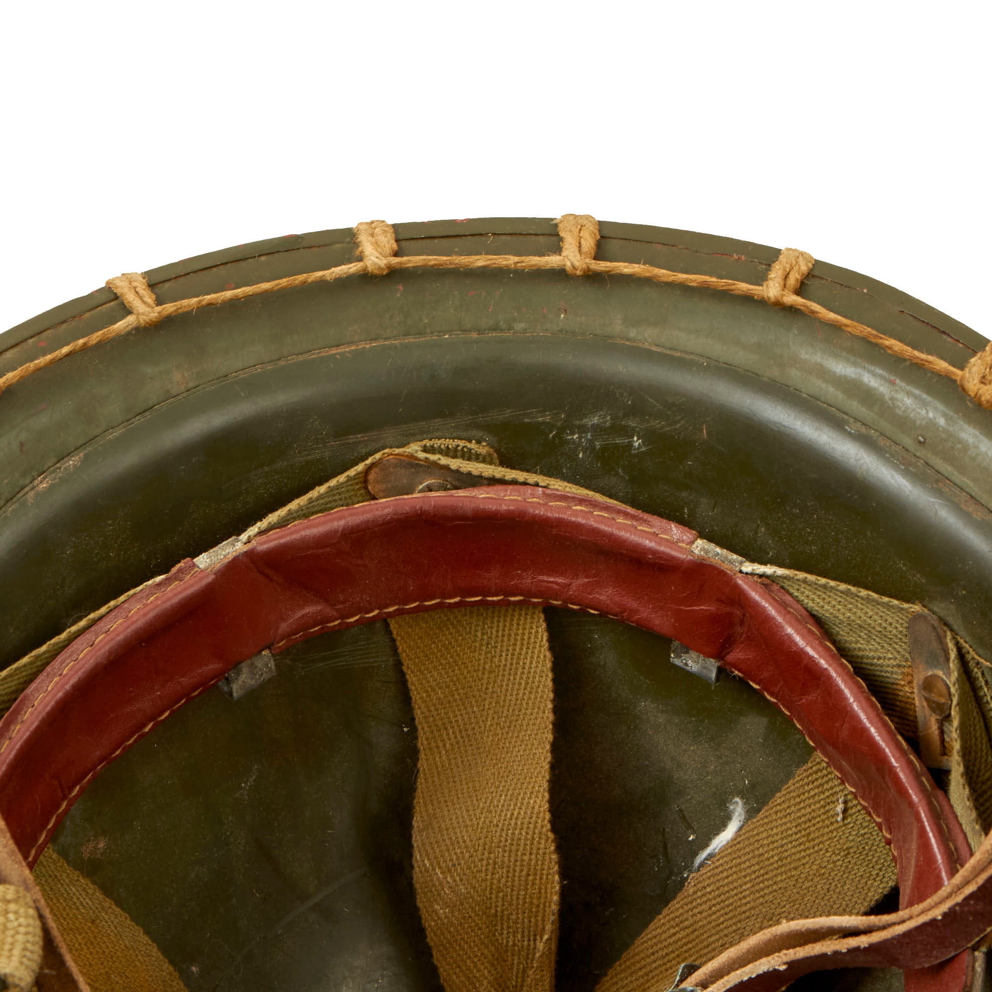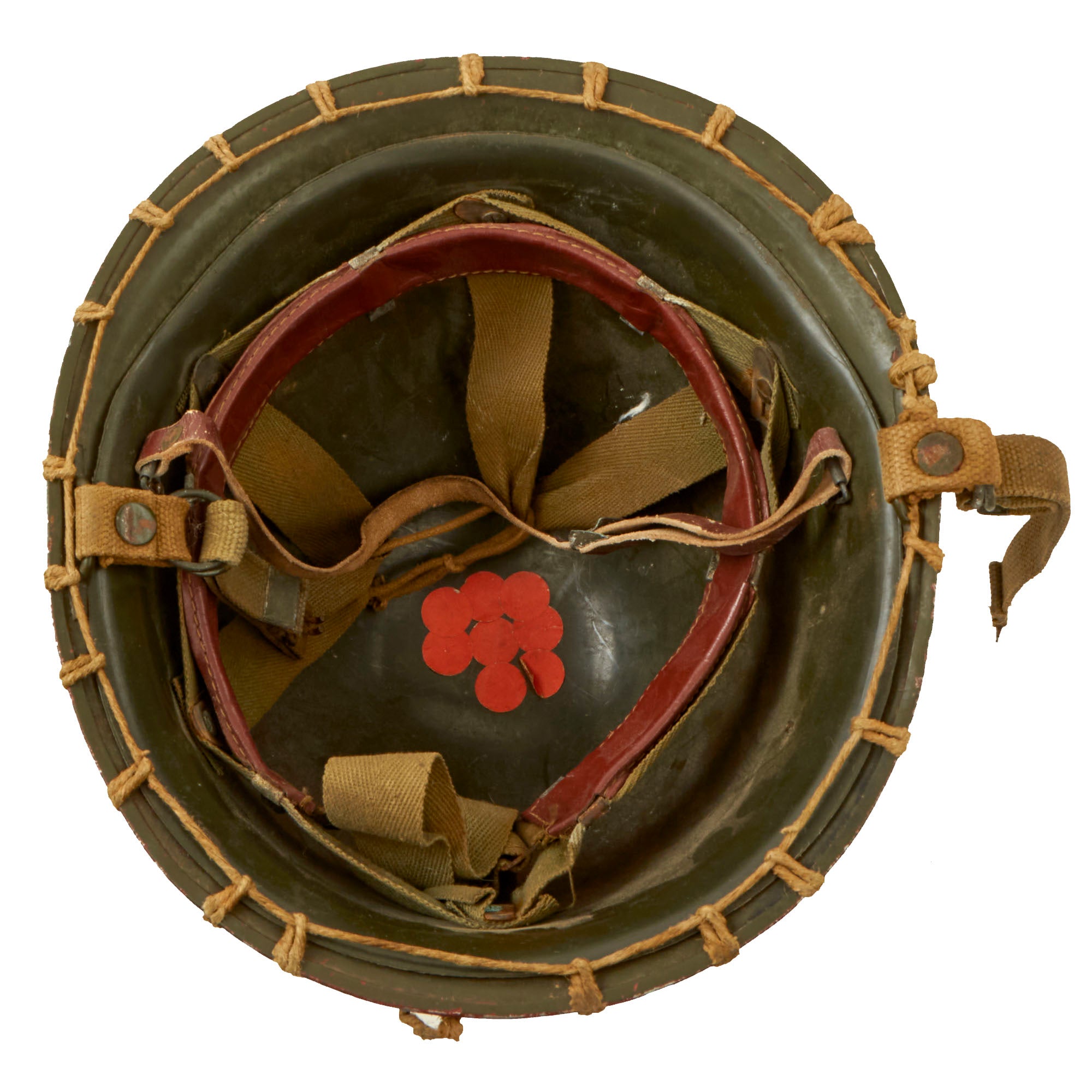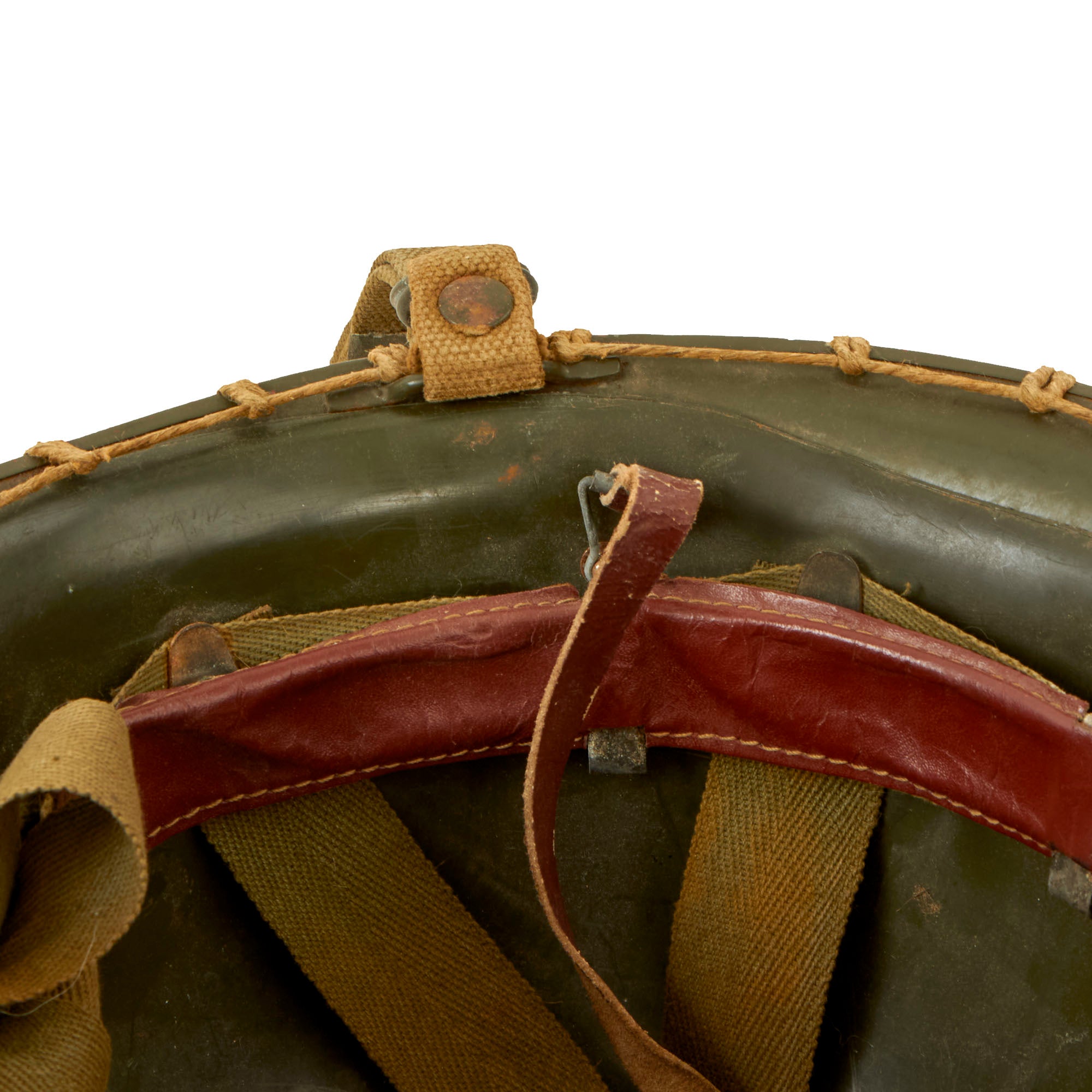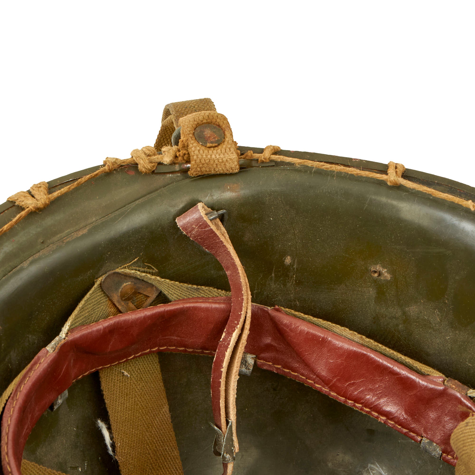 This is an M1963 helmet utilized by the SADF. The helmet has an original period-applied net that unfortunately makes it impossible to remove the liner. The liner is in good shape overall without many flaws. The paint of the helmet is also in good shape. The chinstrap is fully retained.