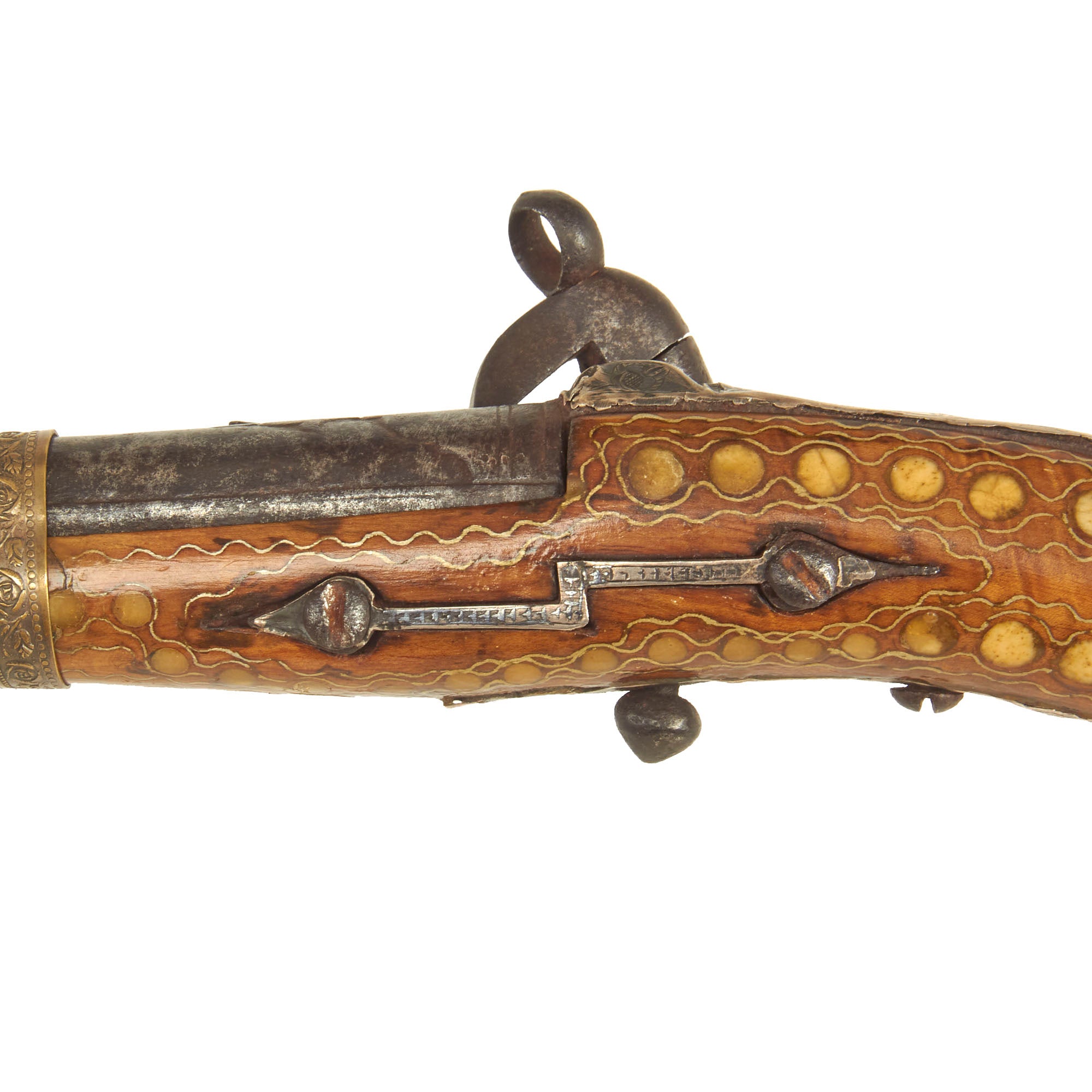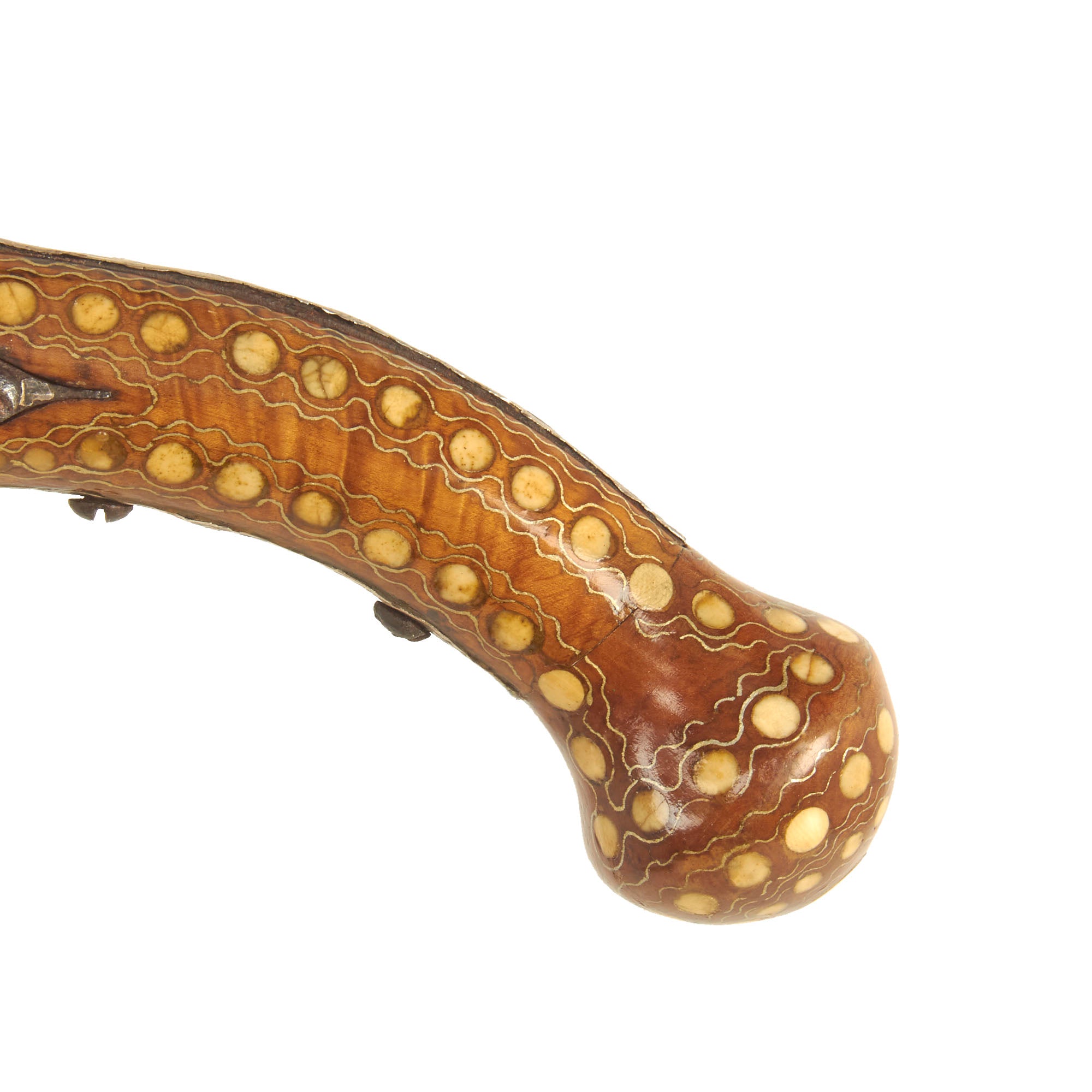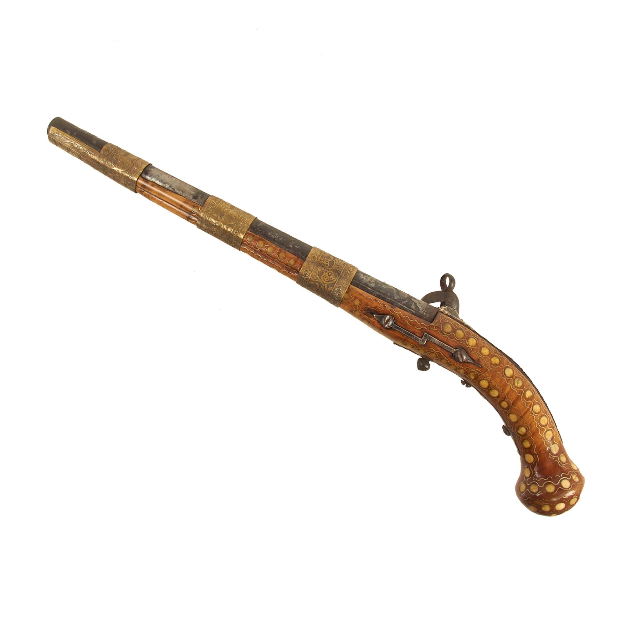 Original Item: Only One Available. This is a very nice Southern Russian Miquelet Lock Pistol, originating from the Caucusus region (often called Caucasia) between the Black and Caspian Seas. Measuring 19 1/4" in overall length with a 12 3/4" barrel this pistol could date from the late 1700s, however these were still being made almost 100 years later in much the same form. The stock is covered in bone circular plugs overall with the "ALL SEEING EYE" inlaid on the ball pommel, which is a separate piece of wood. It is also inlaid overall with silver wire and was never cut for ramrod, as is standard.