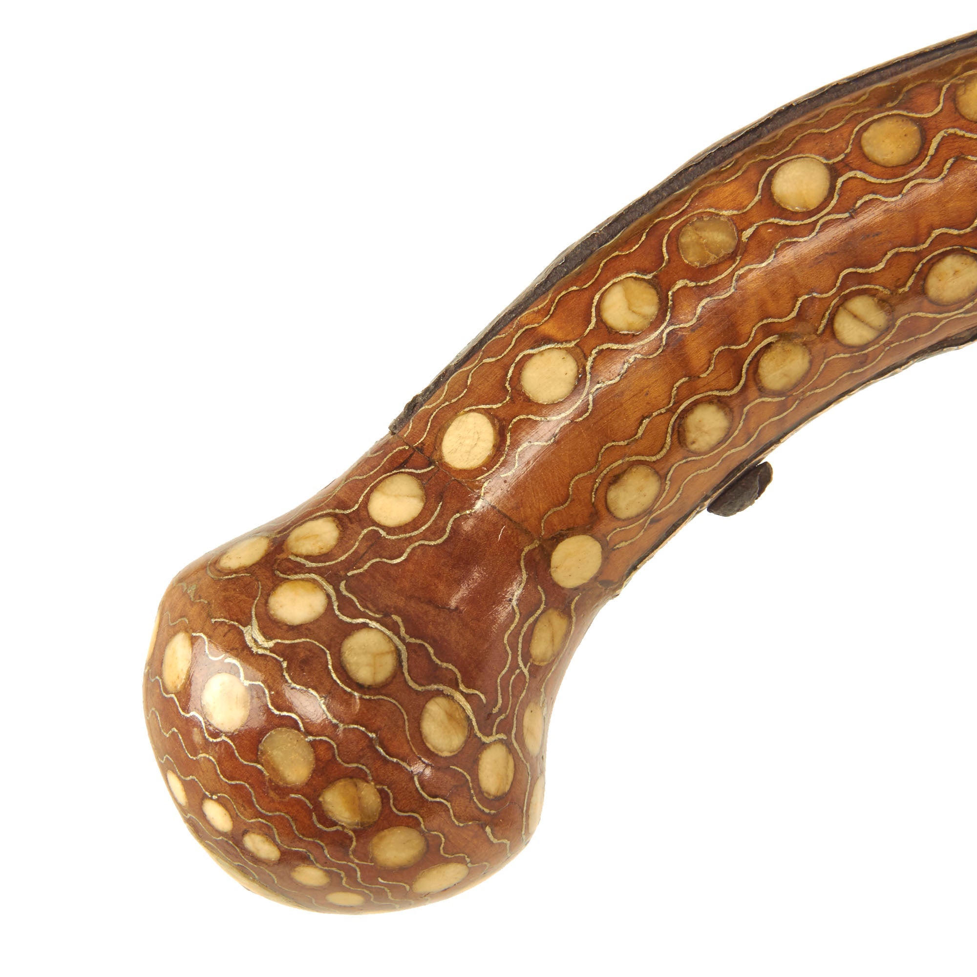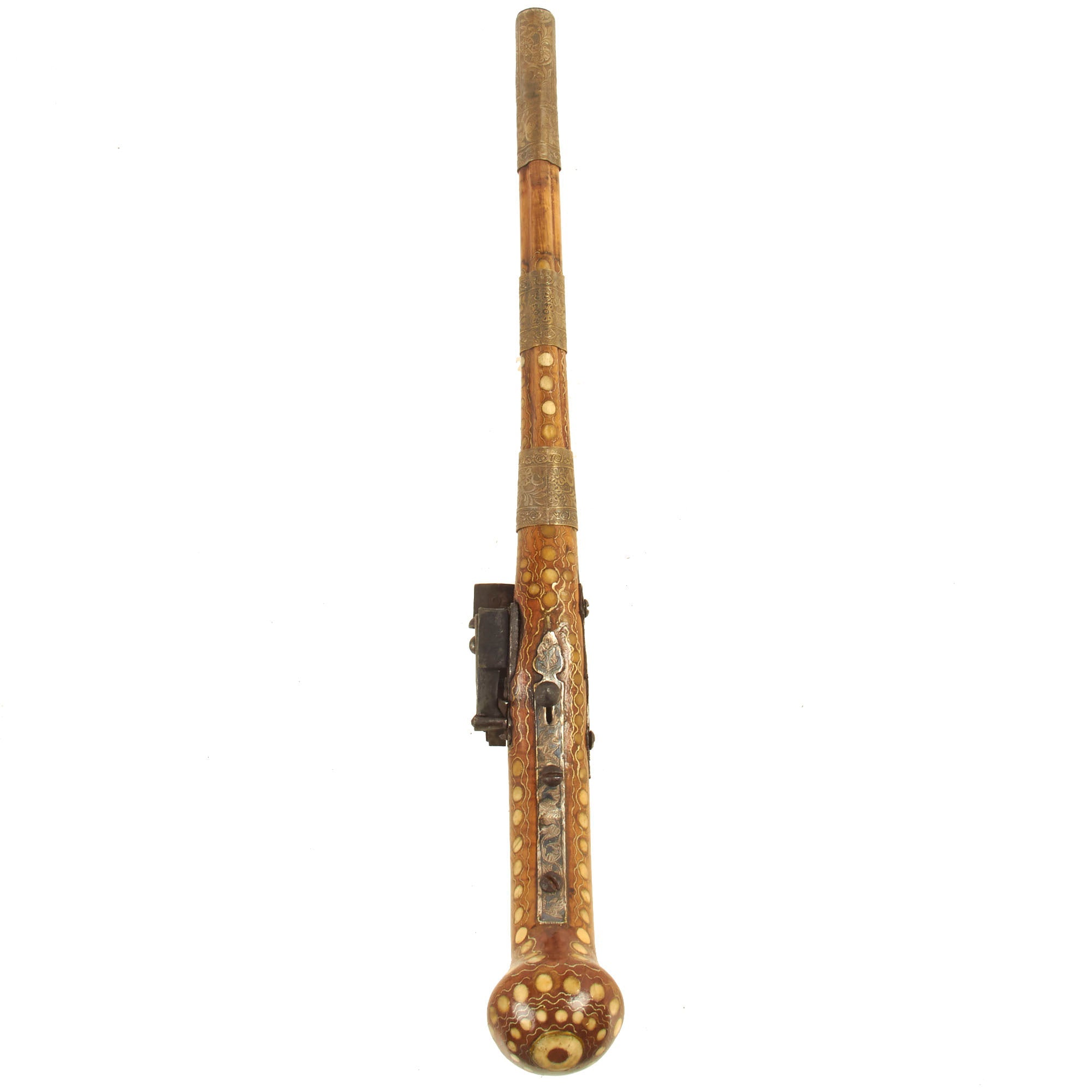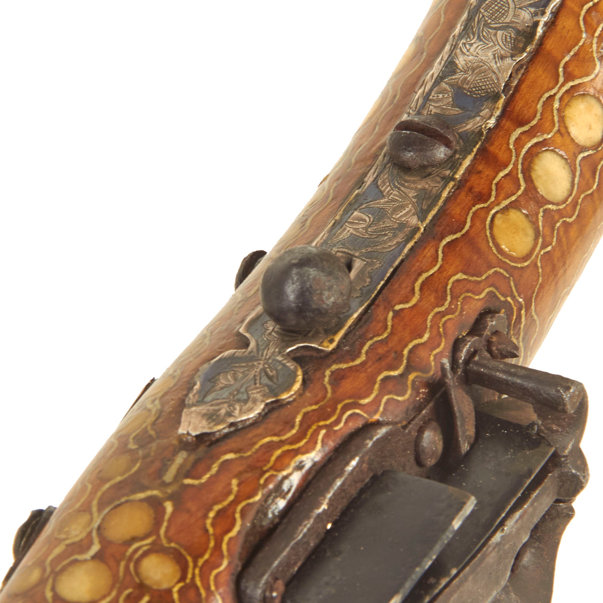 Original Item: Only One Available. This is a very nice Southern Russian Miquelet Lock Pistol, originating from the Caucusus region (often called Caucasia) between the Black and Caspian Seas. Measuring 19 1/4" in overall length with a 12 3/4" barrel this pistol could date from the late 1700s, however these were still being made almost 100 years later in much the same form. The stock is covered in bone circular plugs overall with the "ALL SEEING EYE" inlaid on the ball pommel, which is a separate piece of wood. It is also inlaid overall with silver wire and was never cut for ramrod, as is standard.