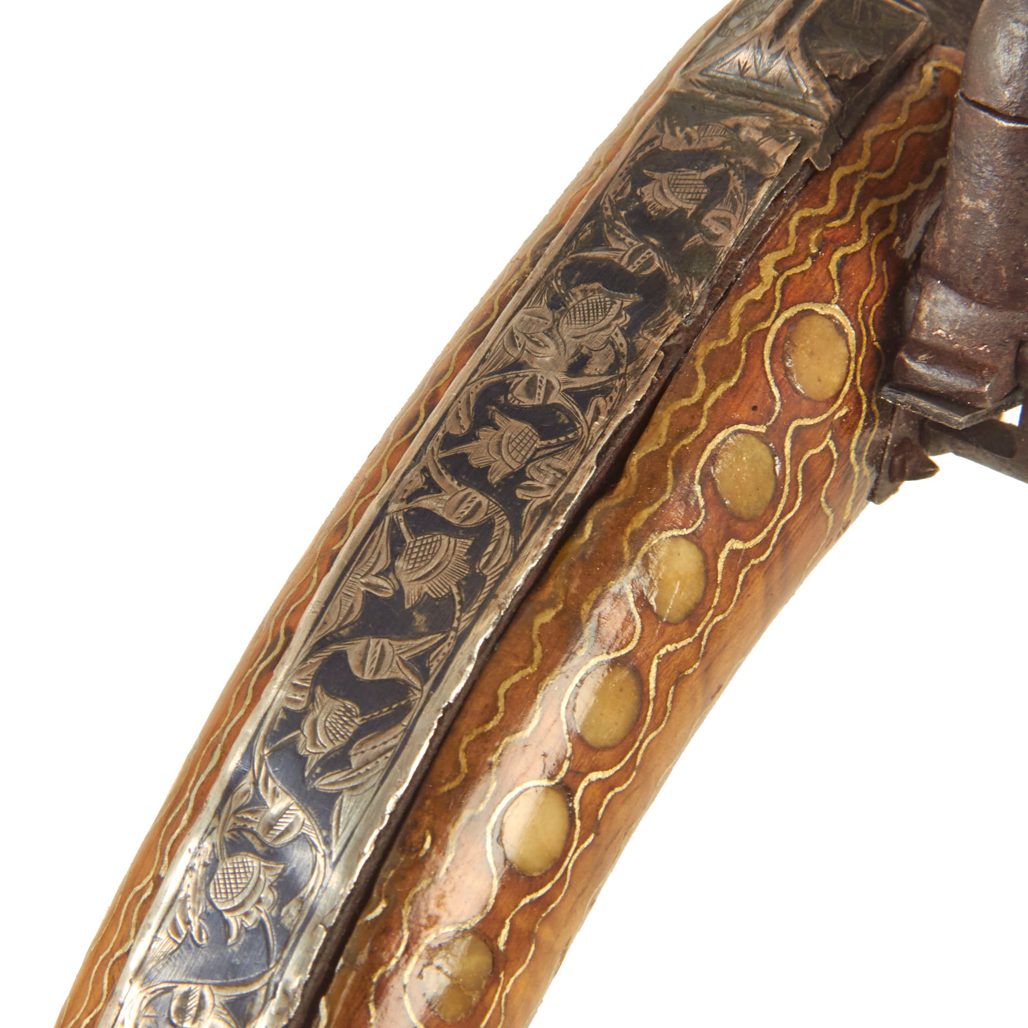 The barrel shows that it was once heavily decorated, and is secured by three heavy silver embossed barrel bands that almost appear to be gold washed due to their patina. The grip back strap and trigger guard are also highly decorative, showing lovely Niello highlighting on the silver metal. The simple angled side plate shows similar decoration, and is really great looking.