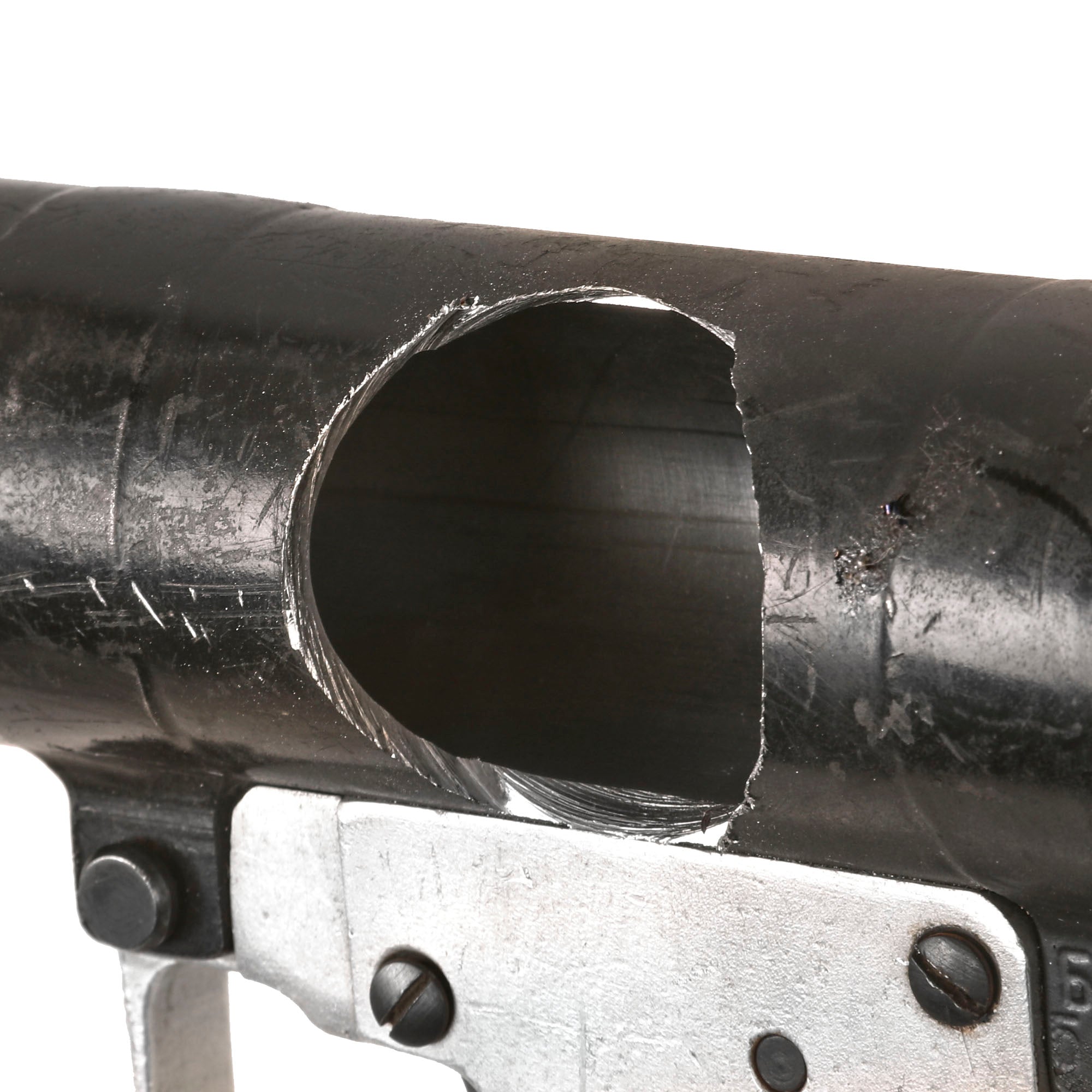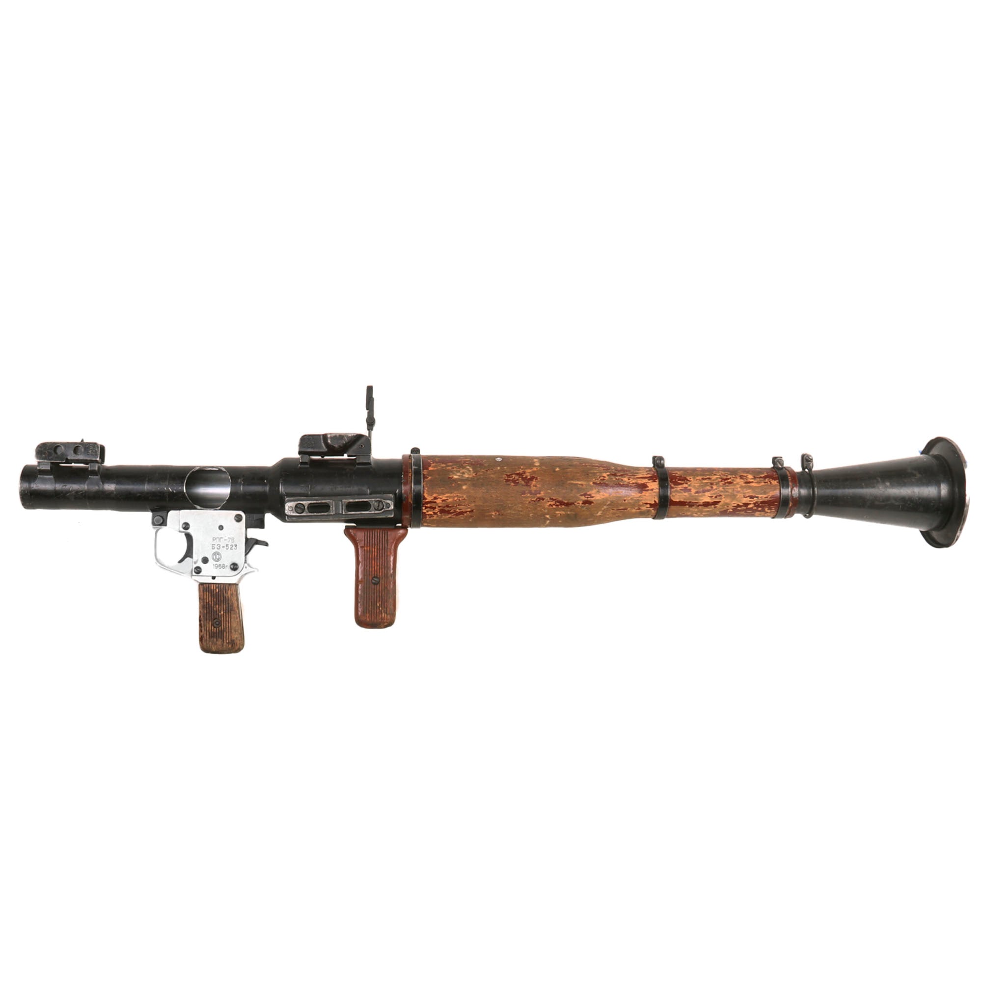 Original Item: Only One Available. This is a totally inert non-firing BATF compliant deactivated non-functional Soviet RPG-7V which is marked in Cyrillic with a Bulgarian arsenal marking on the trigger assembly. The launcher has been deactivated to BATF specifications by drilling out the ignition mechanism with a 1/2" drill bit and welding a 1/2" steel bar across the bore in its place. It also has had a bore-width hole drilled through the left side above the trigger mechanism. A rocket can insert into the front of the tube but the tube is obstructed beyond that point to prevent anything from traveling through.