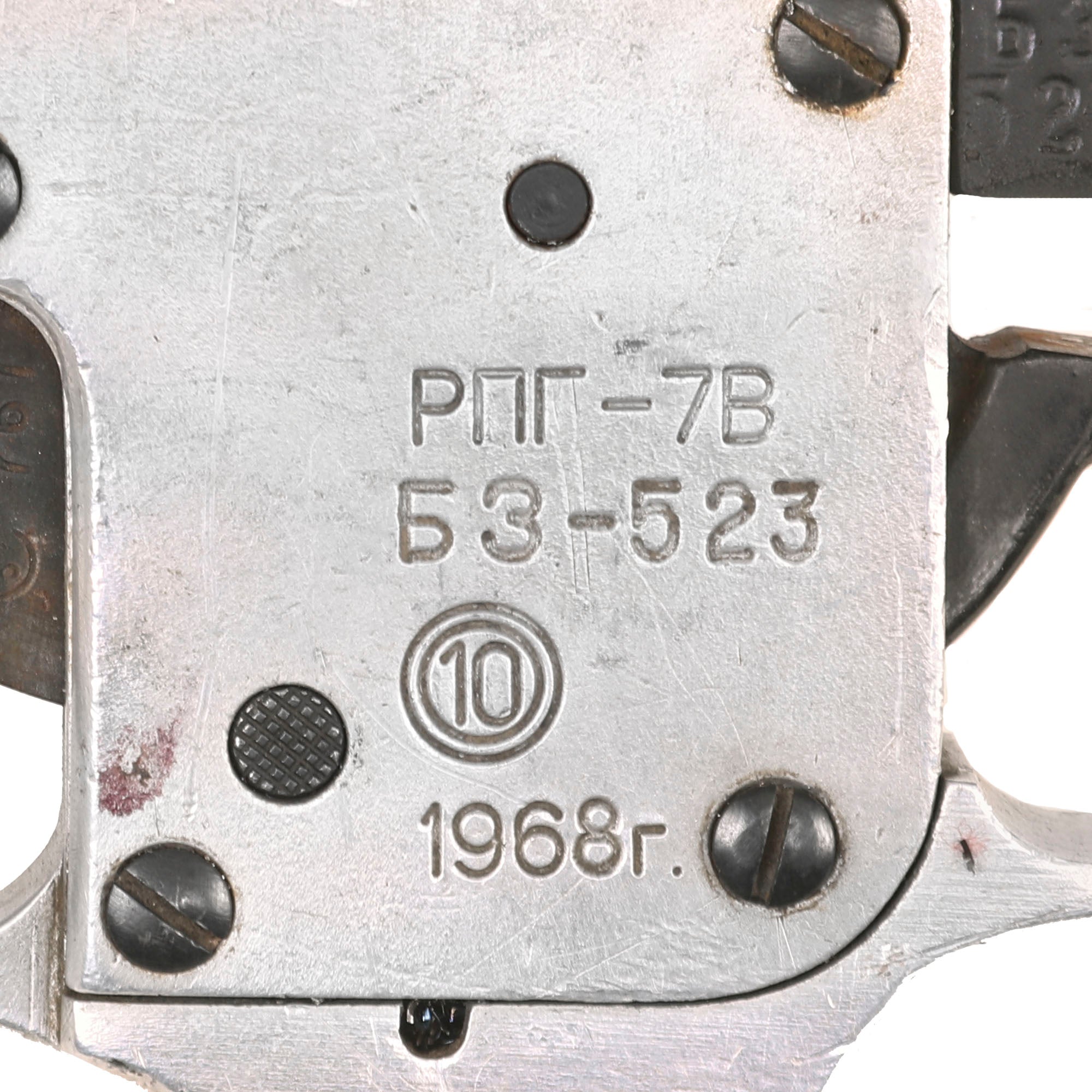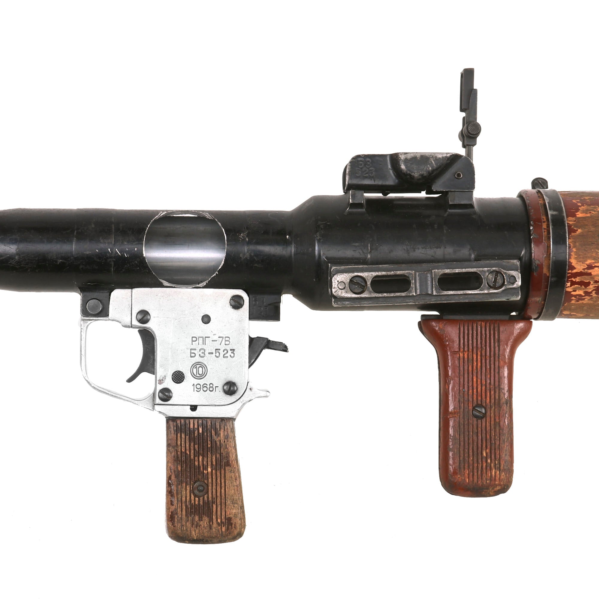 "РПГ-7В" is Cyrillic for RPG-7V, and this is one of the earlier versions fielded, with ribbed painted wood grips, which show wear from service. The "10" in circles indicates that it was processed or produced at the Bulgarian Arsenal. We assume that the middle line is the serial number. The trigger group is still able to cock and dry fire, and the safety works as well. The second grip is still intact as well, and the launcher still has the simple flip up sights, which are both intact and functional.