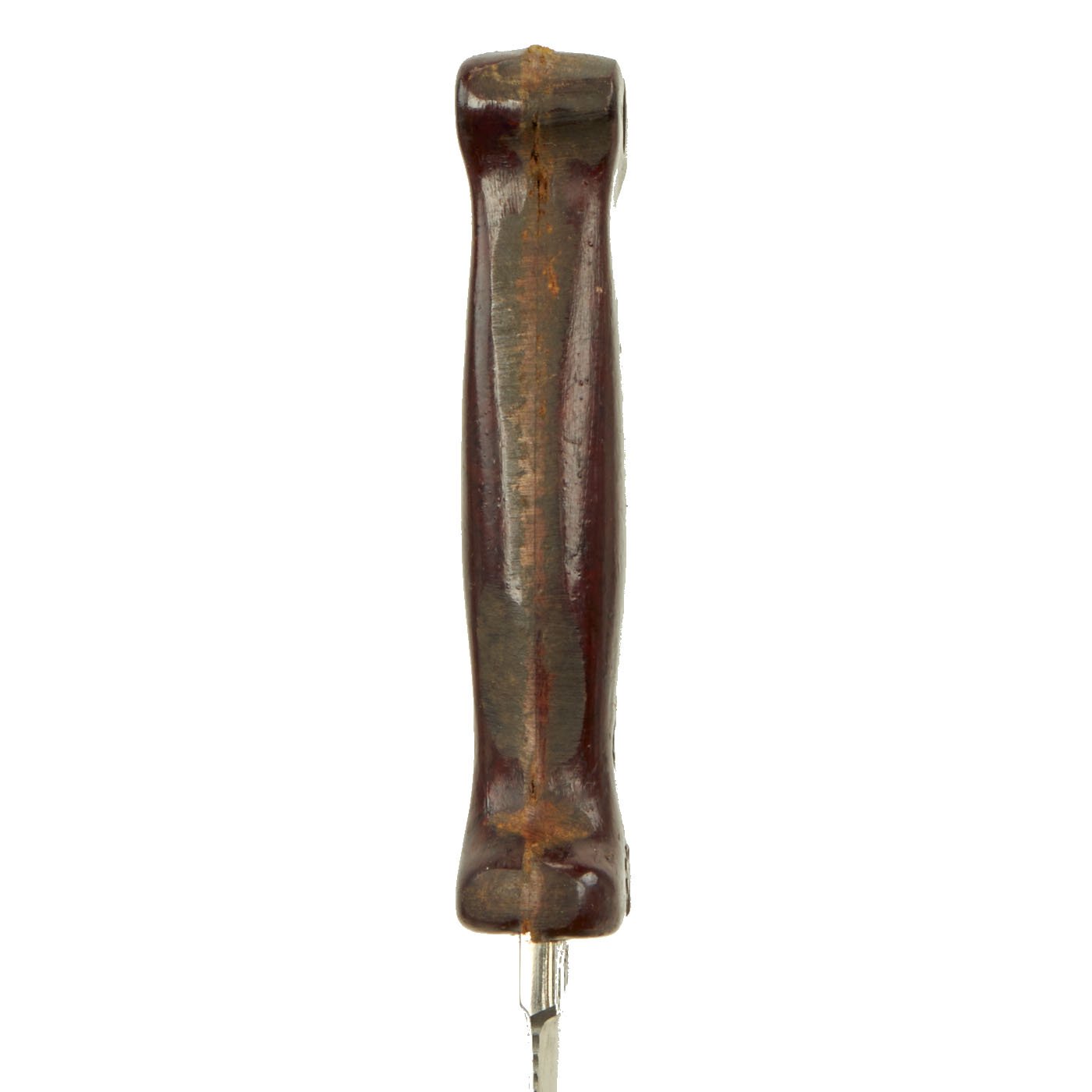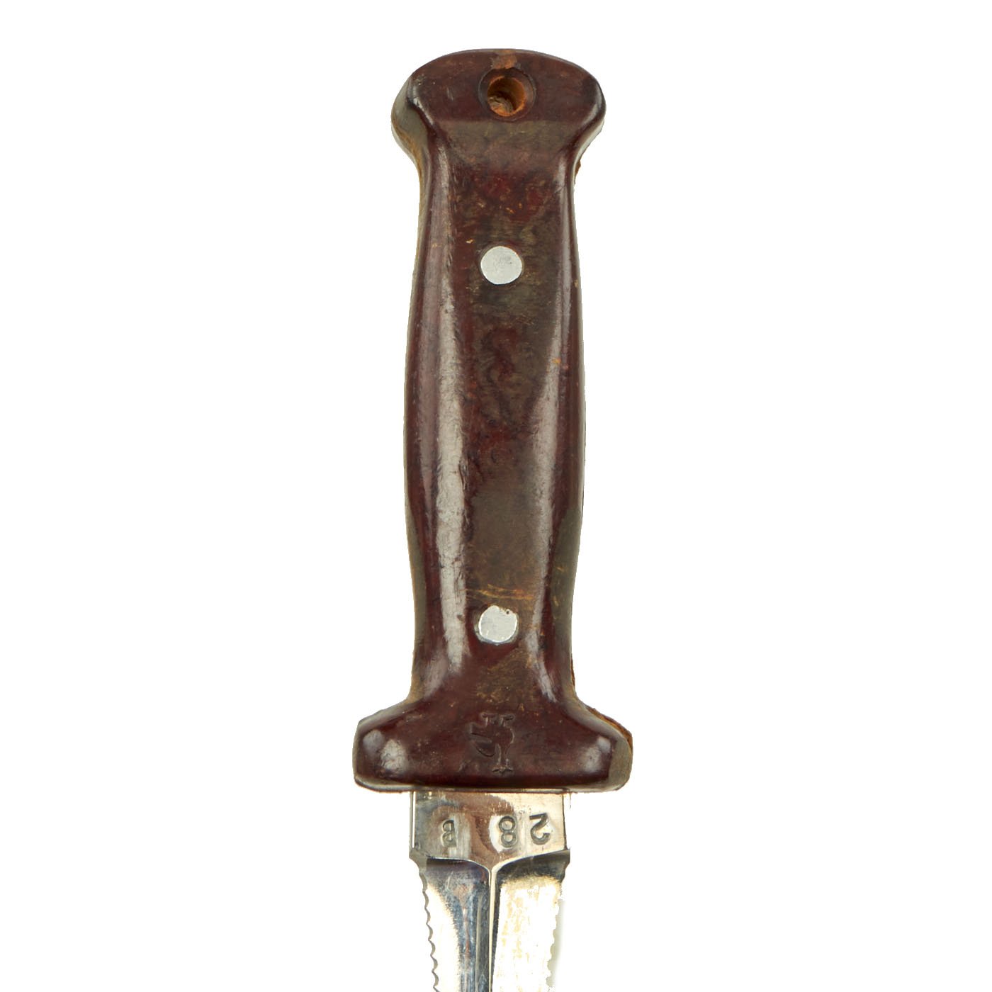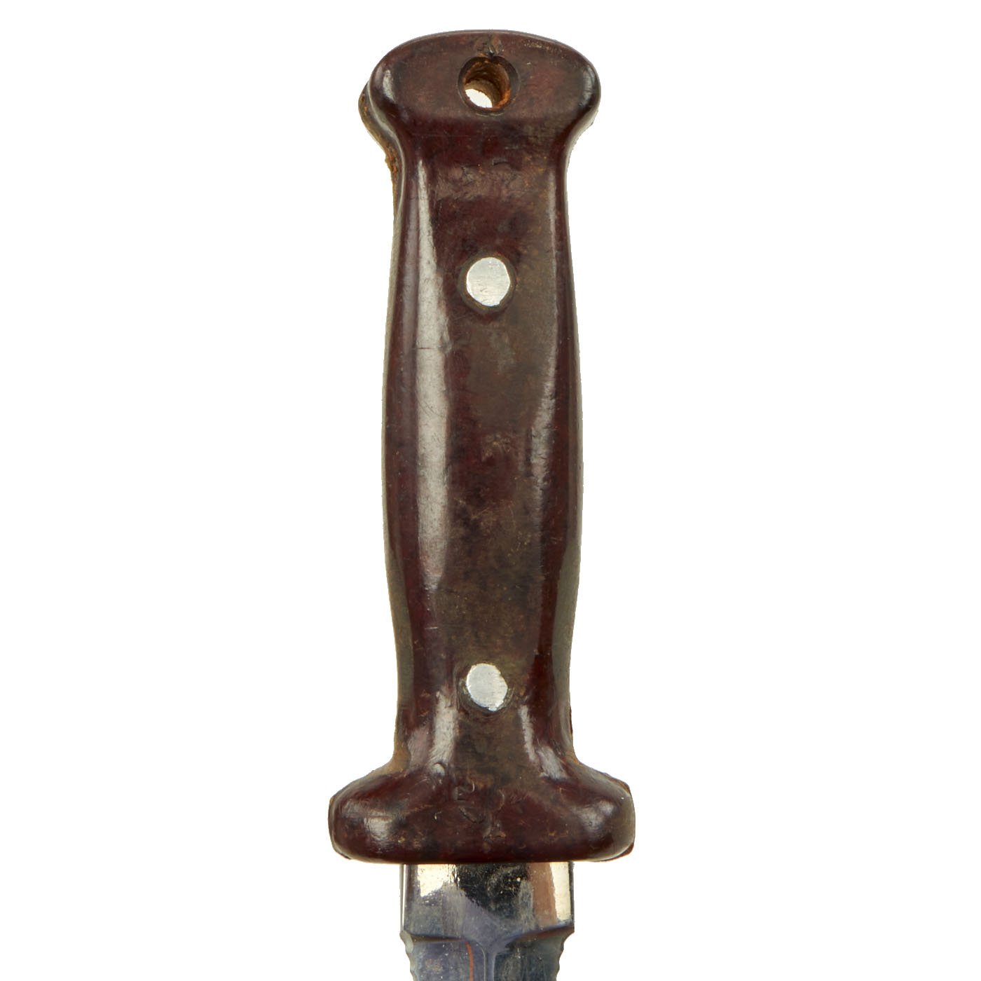 Original Item: Only One Available. Original Soviet military issue Patarooper’s Drop Knife as issued to parachutists and pilots during the Cold War. This particular knife dates from the Soviet Afghan War era. These knives were used by Russian paratroopers who were hung up or tangled in their parachutes' shroud lines. The knife has a unique shaped serrated blade, a brown bakelite grip and a ribbed plastic sheath. Included is the original plastic sheath. Appears unissued, but shows signs of storage wear.
