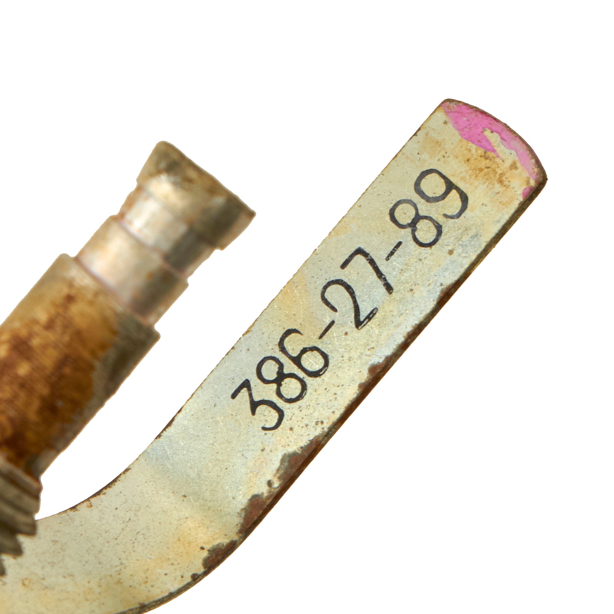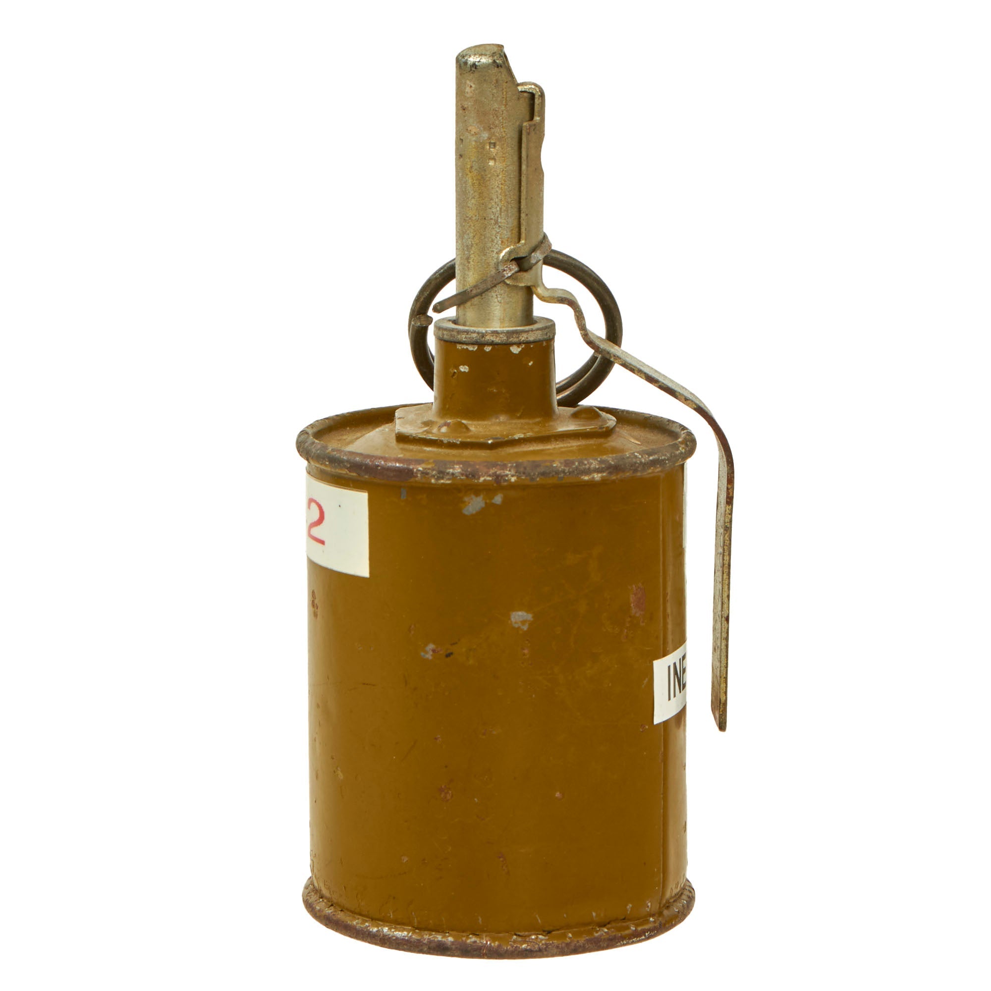 This example is in fair condition and has tags on the side denoting the model and INERT. The bottom of the grenade has been cut off like a can, and is still inside, just loose. There are some markings on the spoon, 19-88 11 Y3PRM-2.