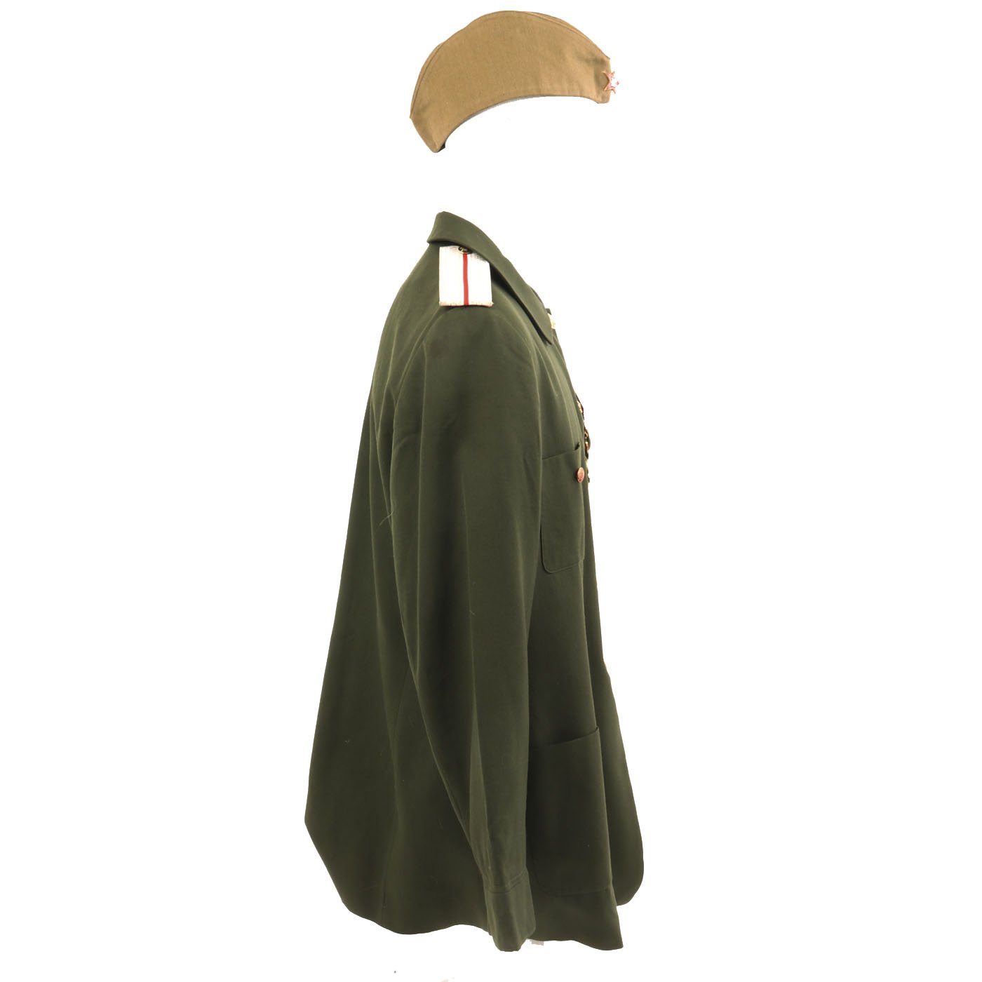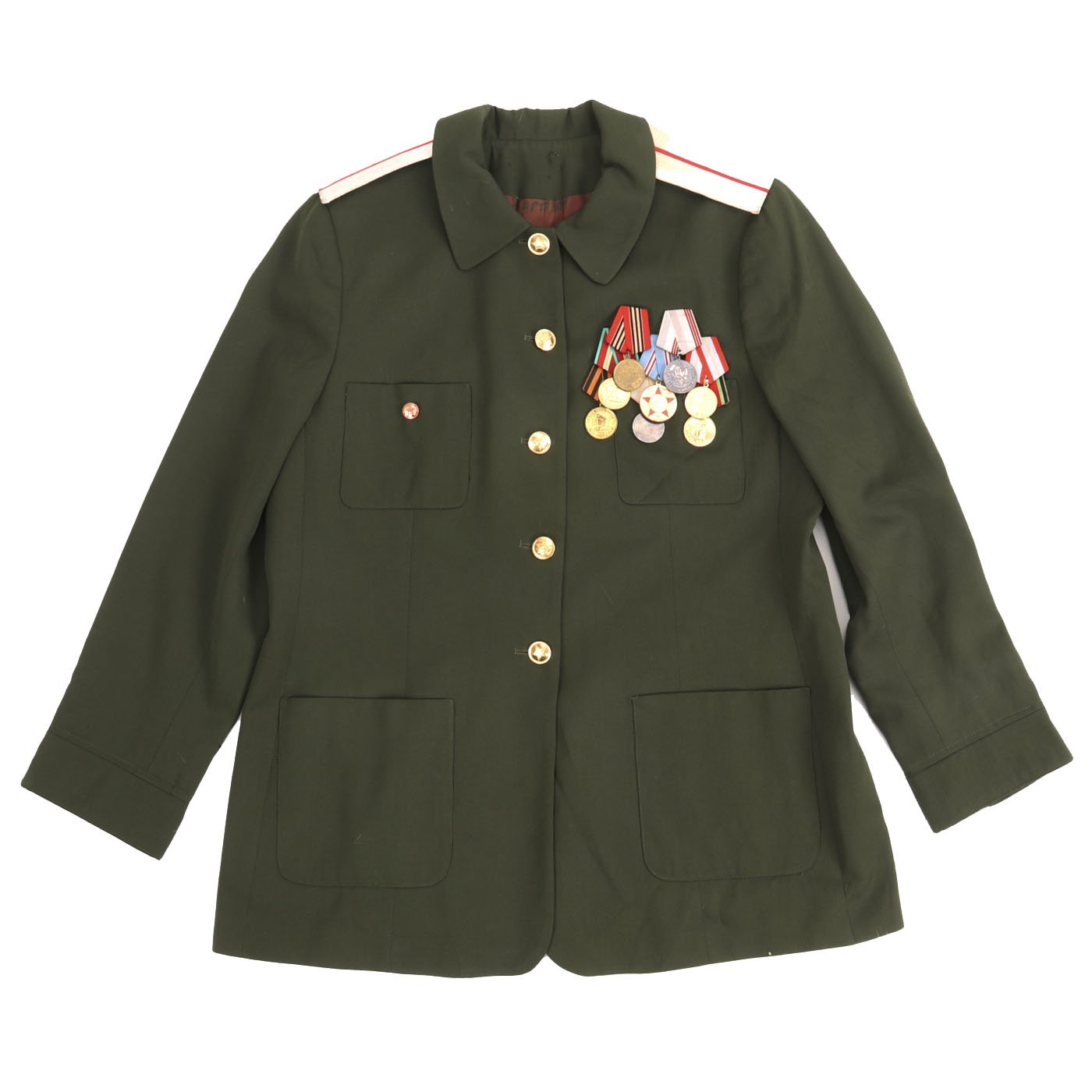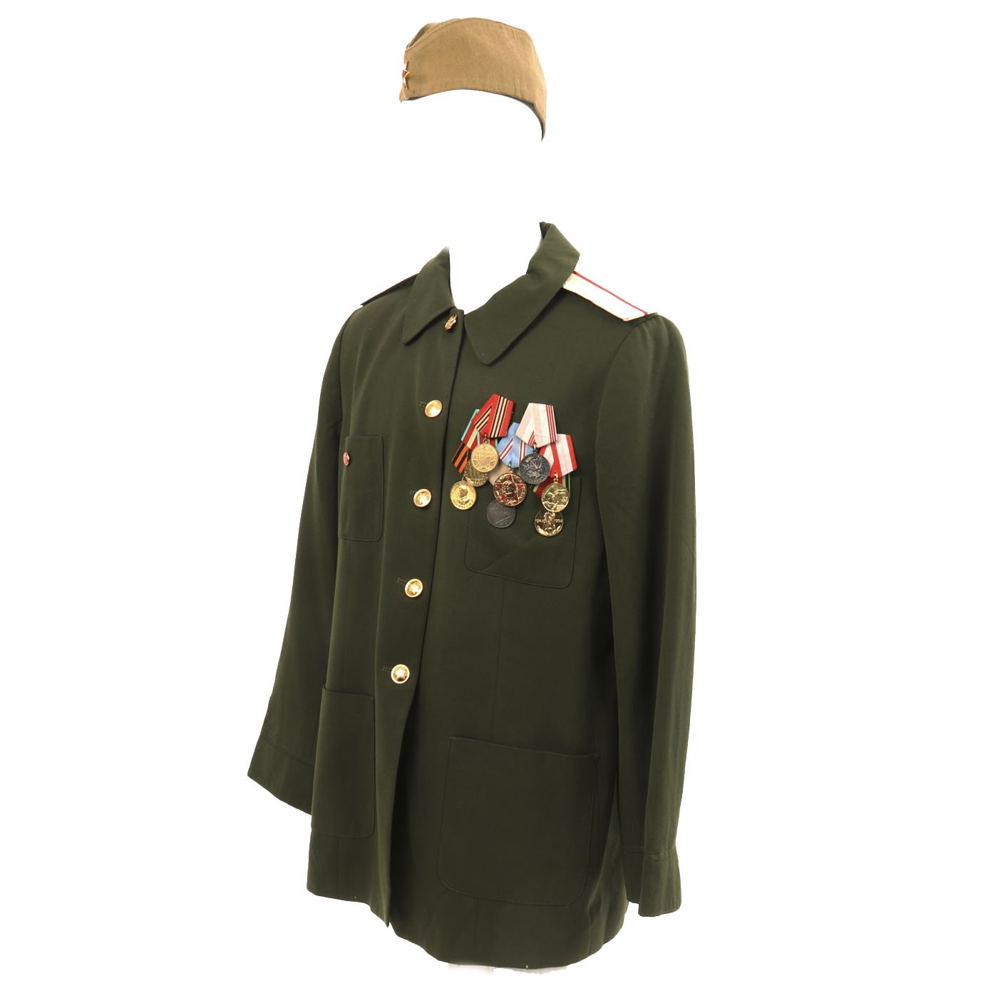 Original Item: Only One Available. Green jacket with brown rayon interior, silver infantry officer shoulder boards (ensign, lieutenant, senior lieutenant, captain). Multiple medals and size 59 side cap with enamel Soviet Insignia Pin to front. Offered in overall excellent condition.