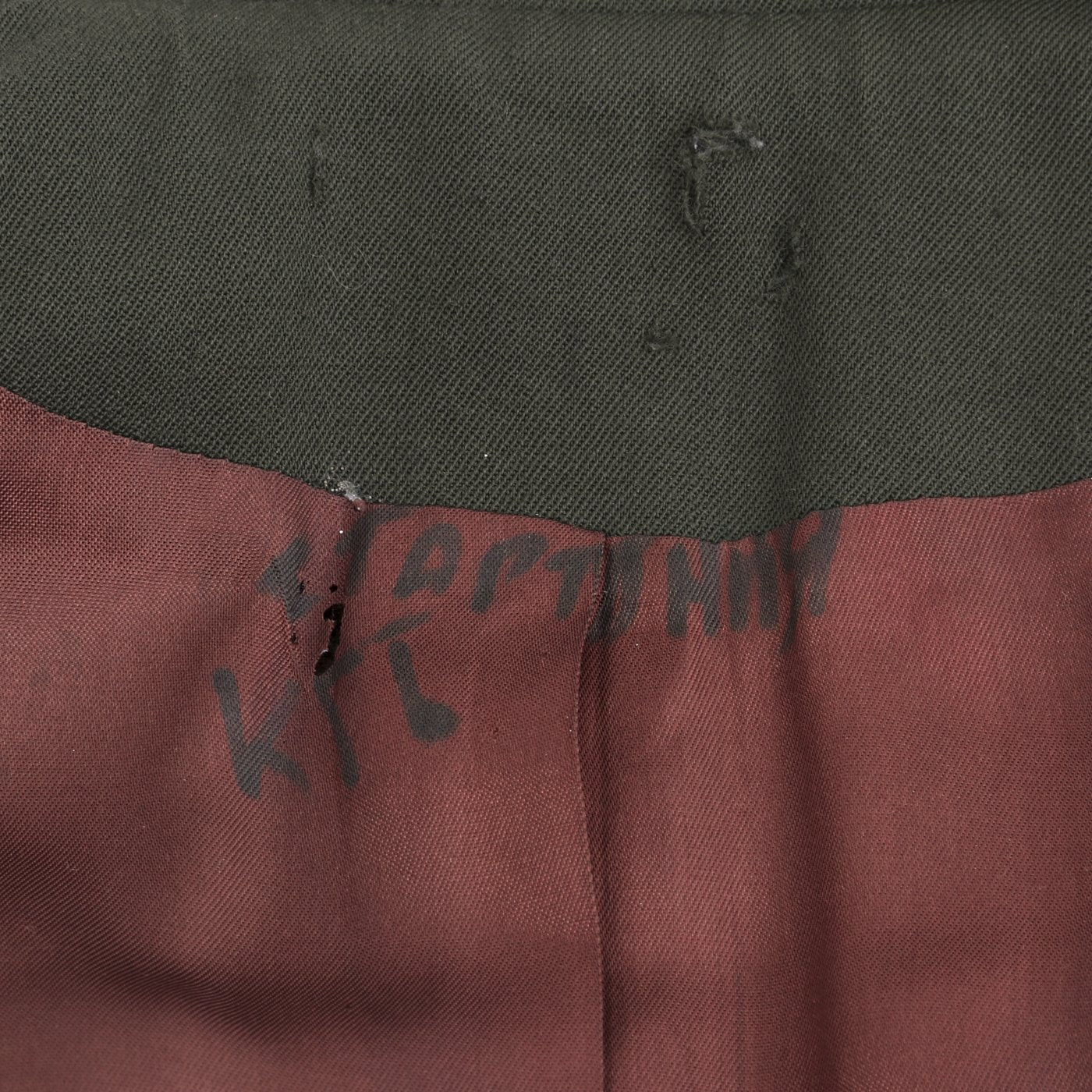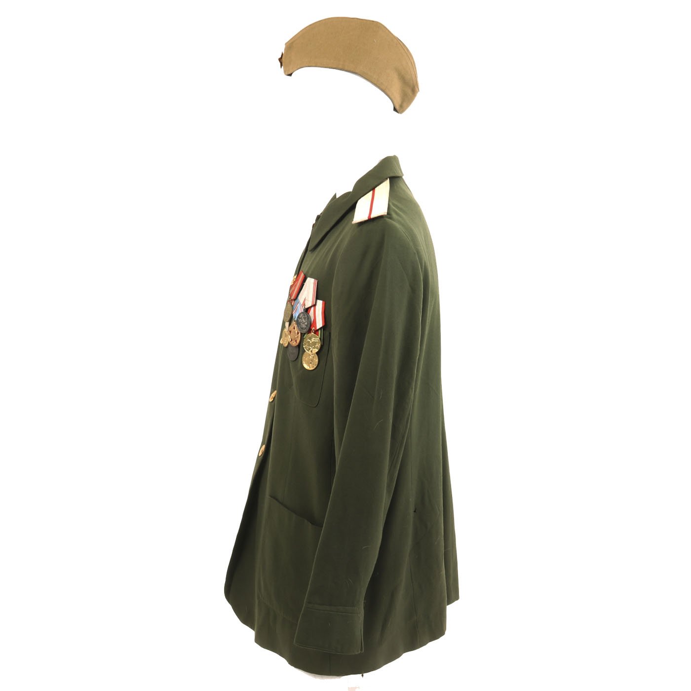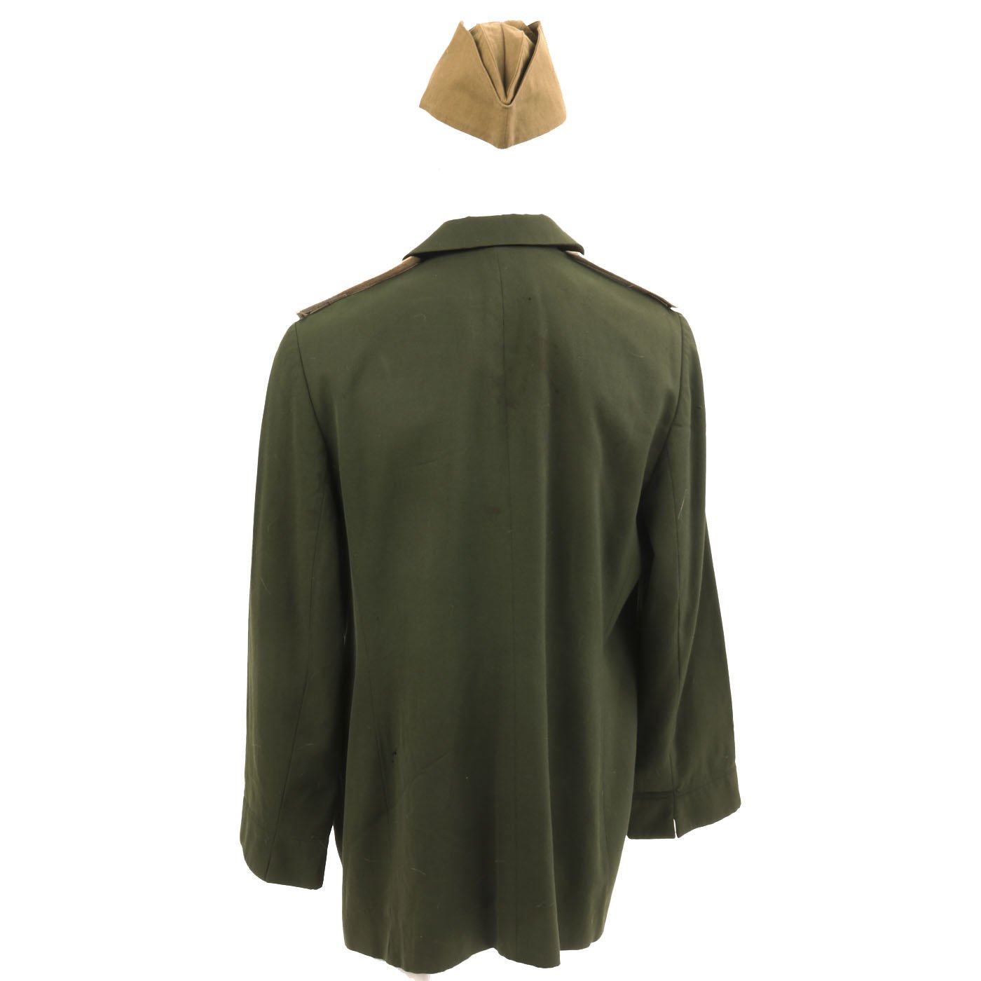 Original Item: Only One Available. Green jacket with brown rayon interior, silver infantry officer shoulder boards (ensign, lieutenant, senior lieutenant, captain). Multiple medals and size 59 side cap with enamel Soviet Insignia Pin to front. Offered in overall excellent condition.