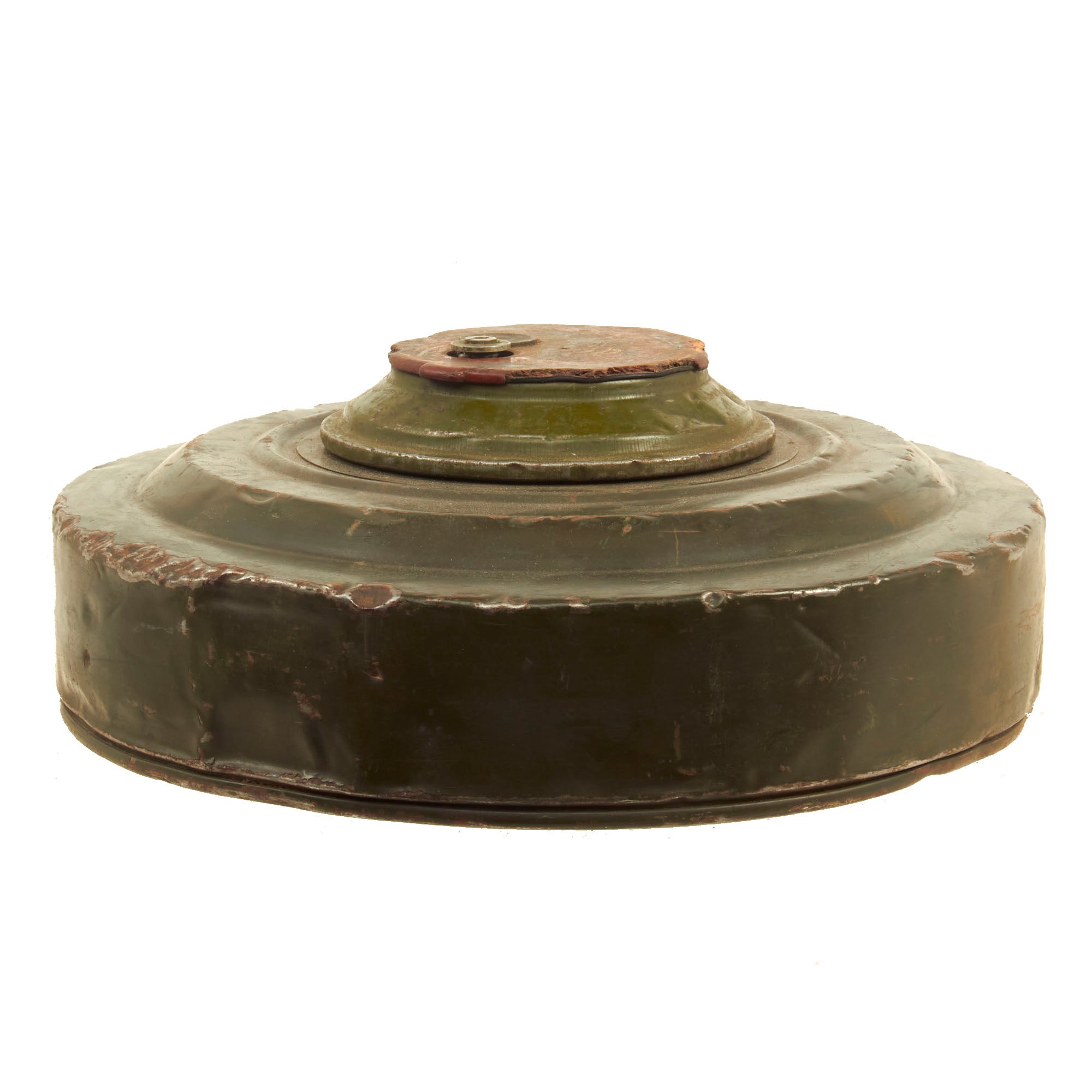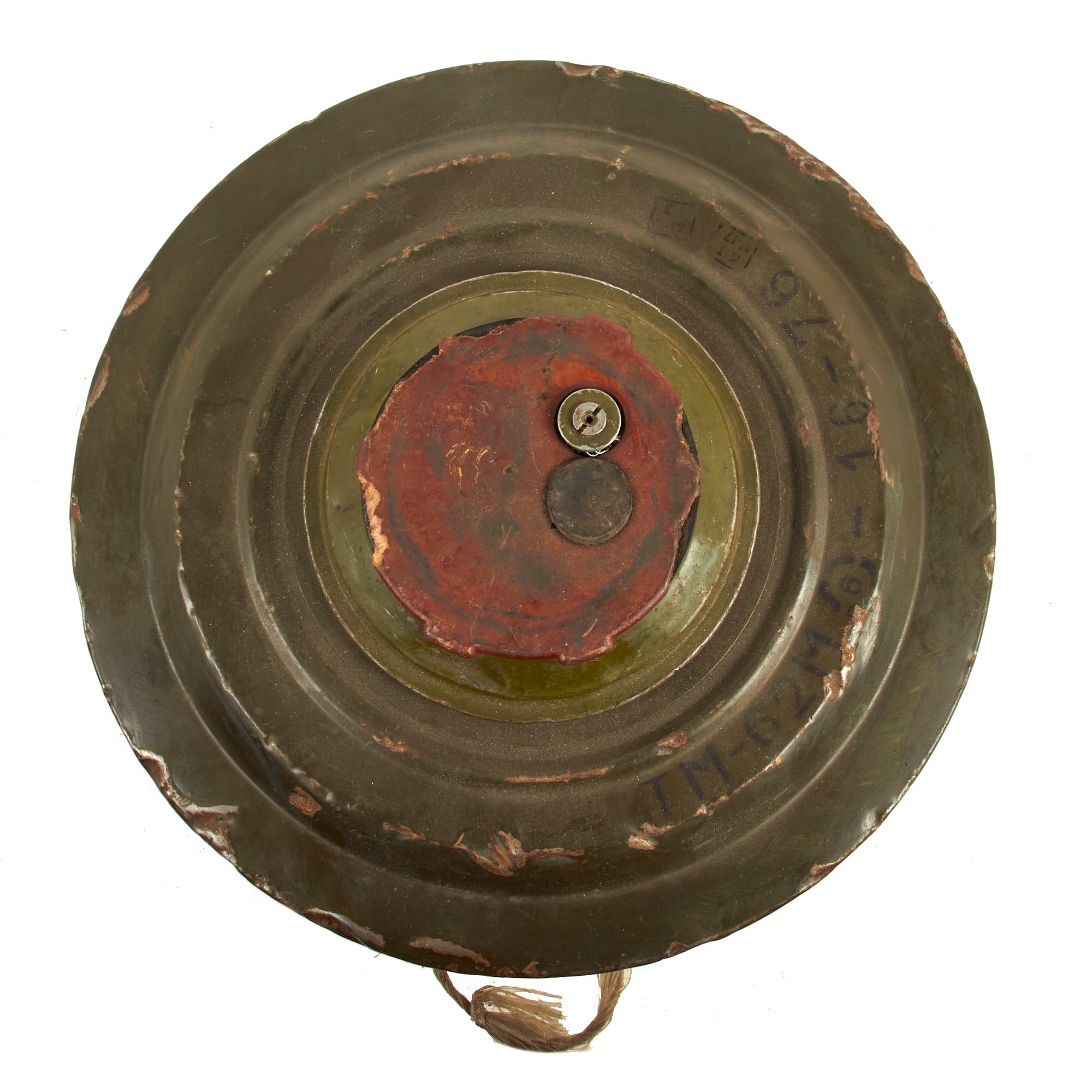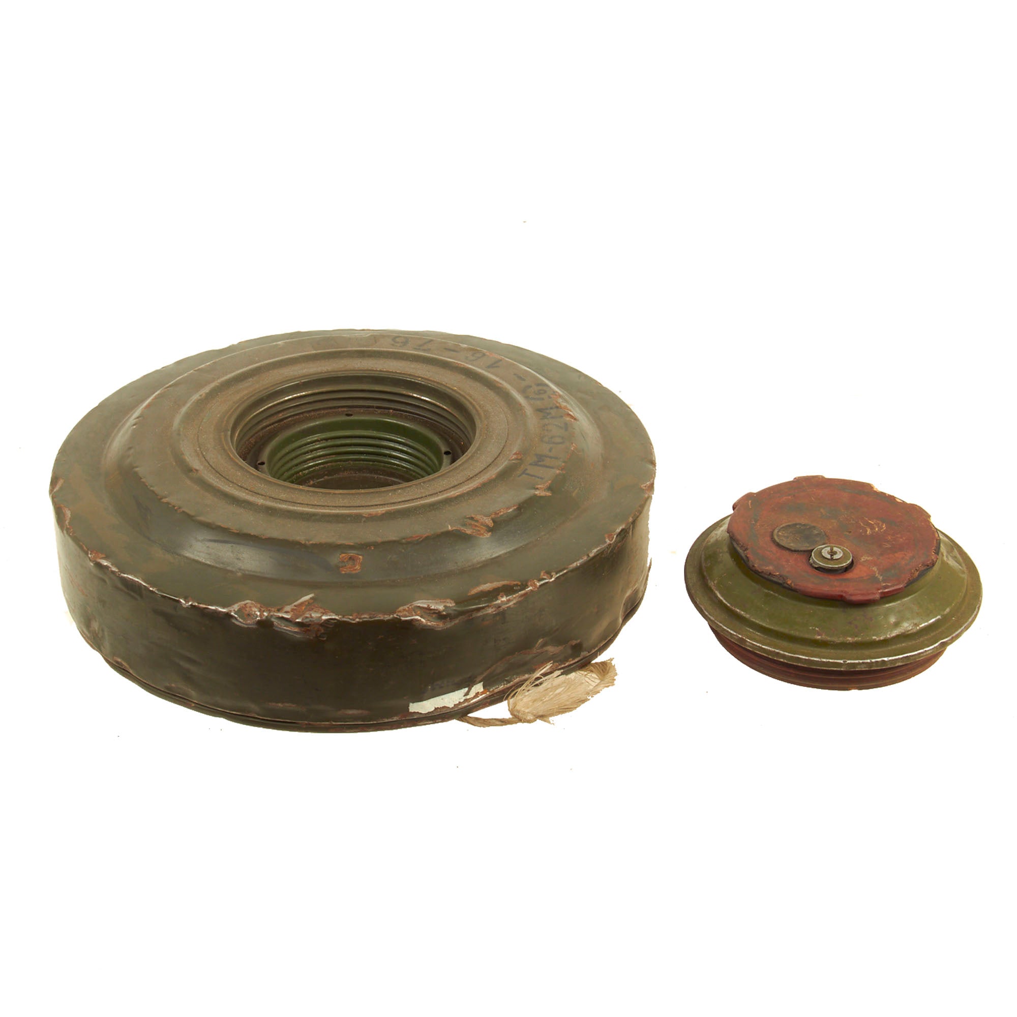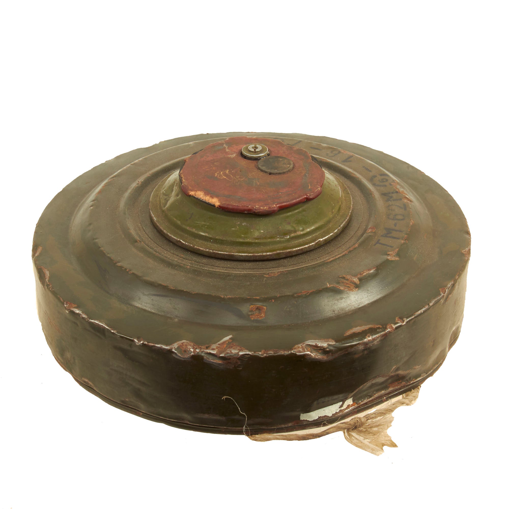 The TM-62 is a Soviet anti-tank blast mine made in many variants. It has a central fuze and typically a 7.5 kilograms (17 lb) explosive charge, but the variants vary greatly in detail. The mine can be laid manually or automatically from a mine laying machine including the PMR-1, PMR-2 wheeled towed mine layers, the GMZ-3 tracked mine laying vehicle and the VMR-2 helicopter mine laying system. The TM-62 can be fitted with the same fuzes as the TM-72, which include MVN-72 and MVN-80 fuzes which are vibration and magnetism sensitive. In a static test, the TM-62M proved capable of penetrating the hull of a Centurion tank, killing the simulated crew of animals inside. Measures approximately 12 1/4" in diameter and 5" tall.