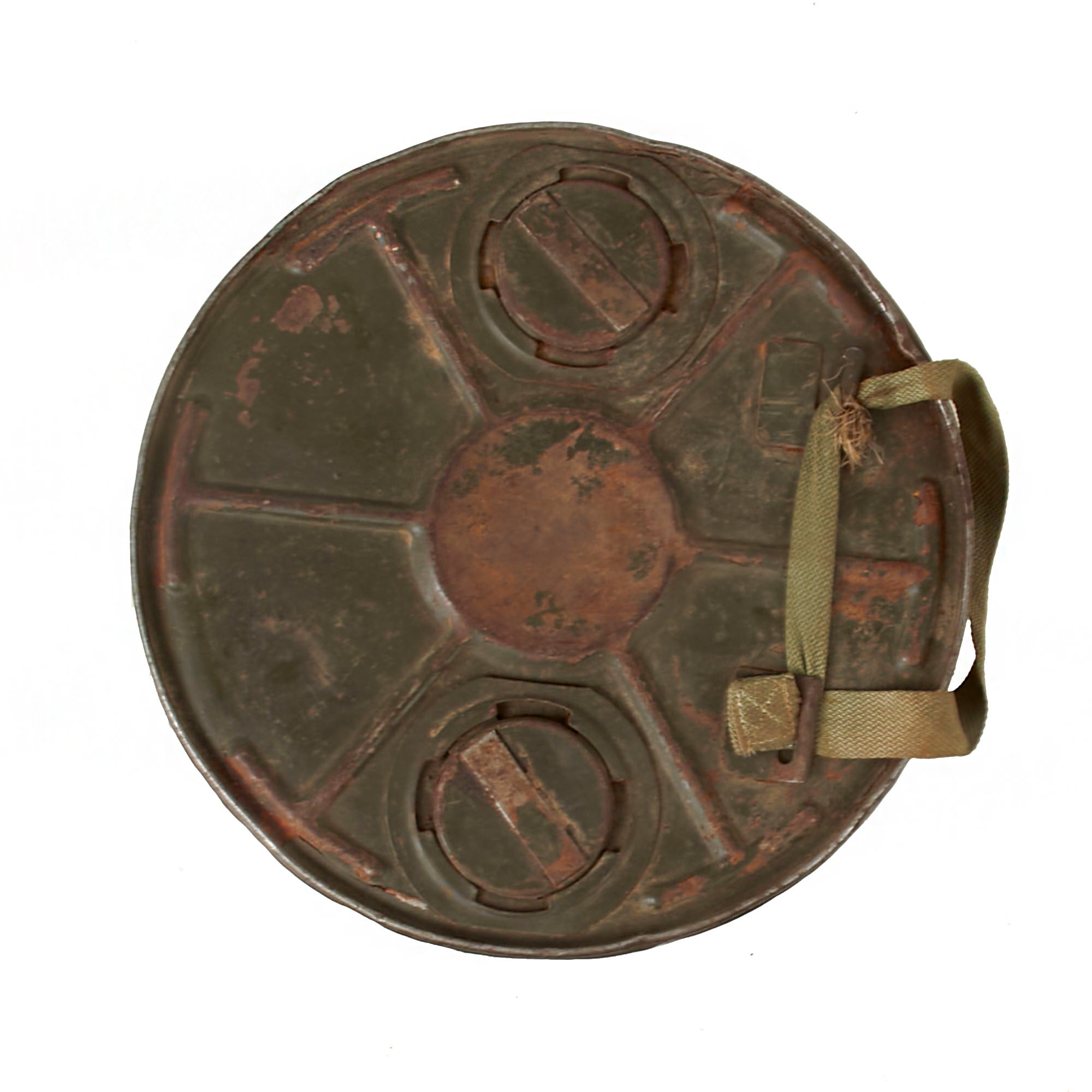 This example is in fair but heavily worn condition with heavy denting in the body, and the red piece at the top has lost many of its edges. The top can still be unscrewed for inspection. This example retains a canvas handle on the bottom. The mine appears to be dated 1973 from the markings.