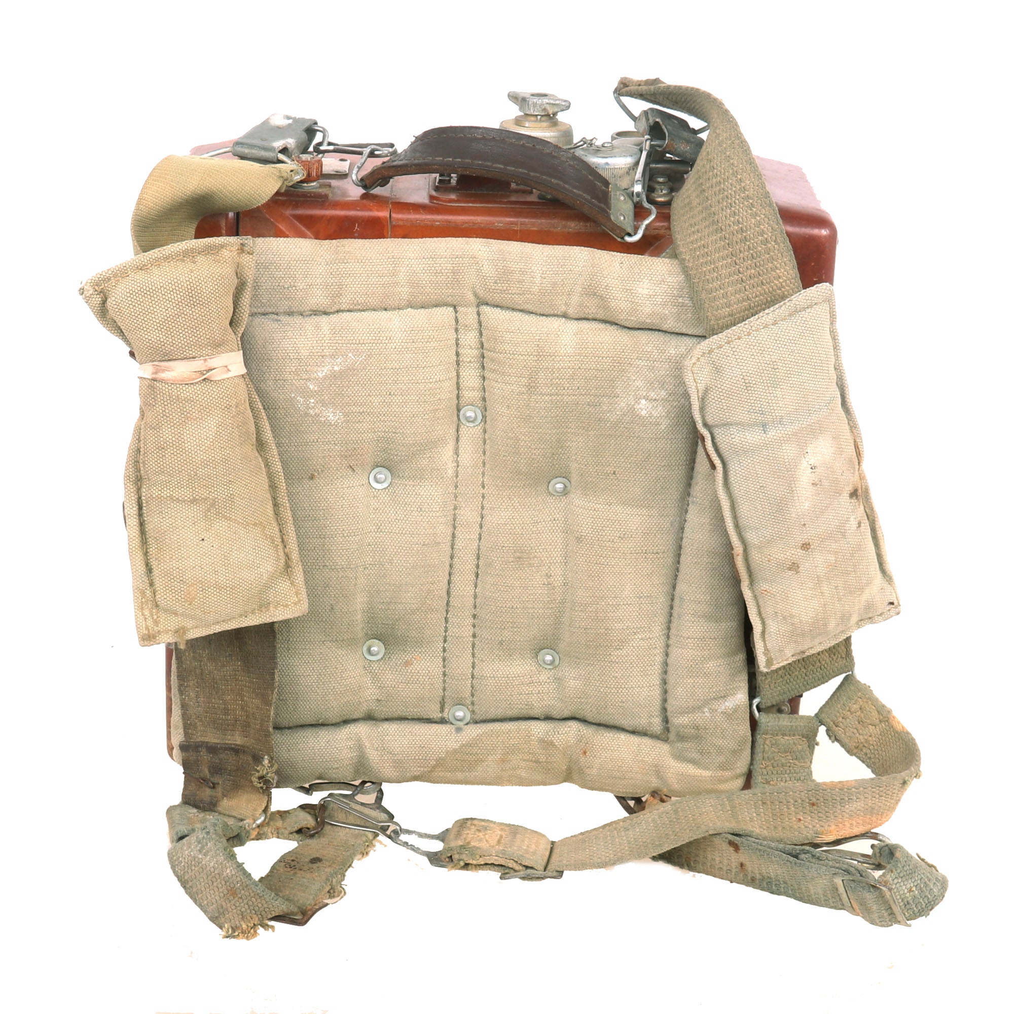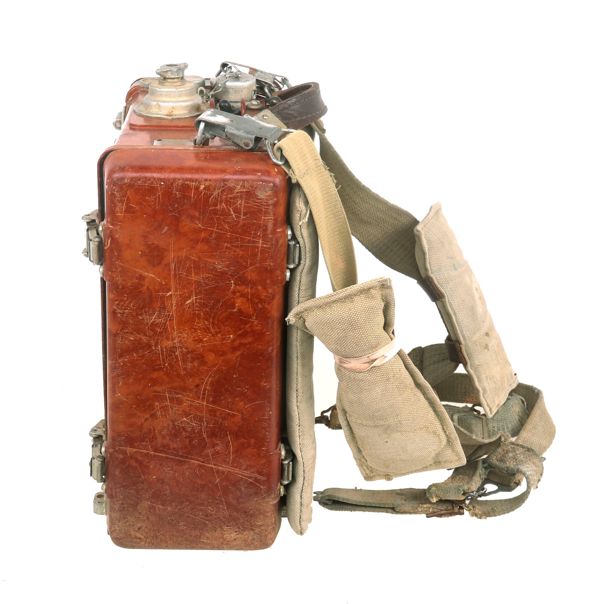 This example was utilized by Iraqi forces and was captured by an American soldier in 1991 during the Gulf War. It still retains its straps and back padding, and also includes the headset with wire, a second wire appears to be broken off from the radio itself, but will work well for display. There are some very faded markings on the side. The leather carrying strap is retained but it is likely weak, so please do not try to lift it by the strap.