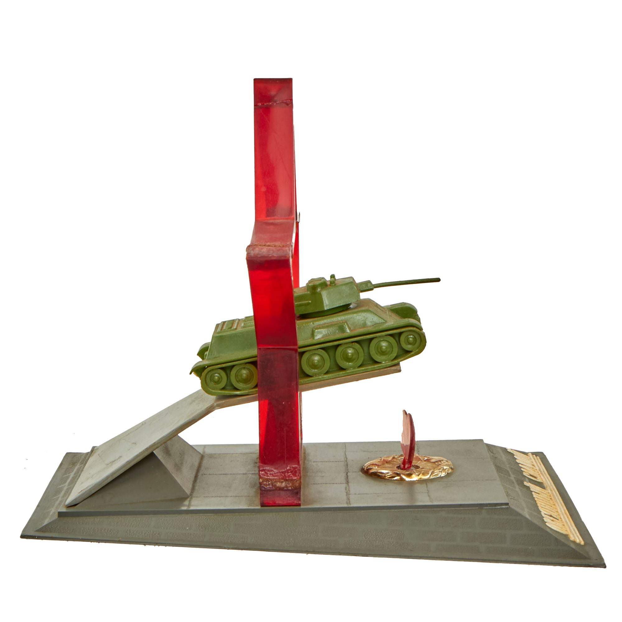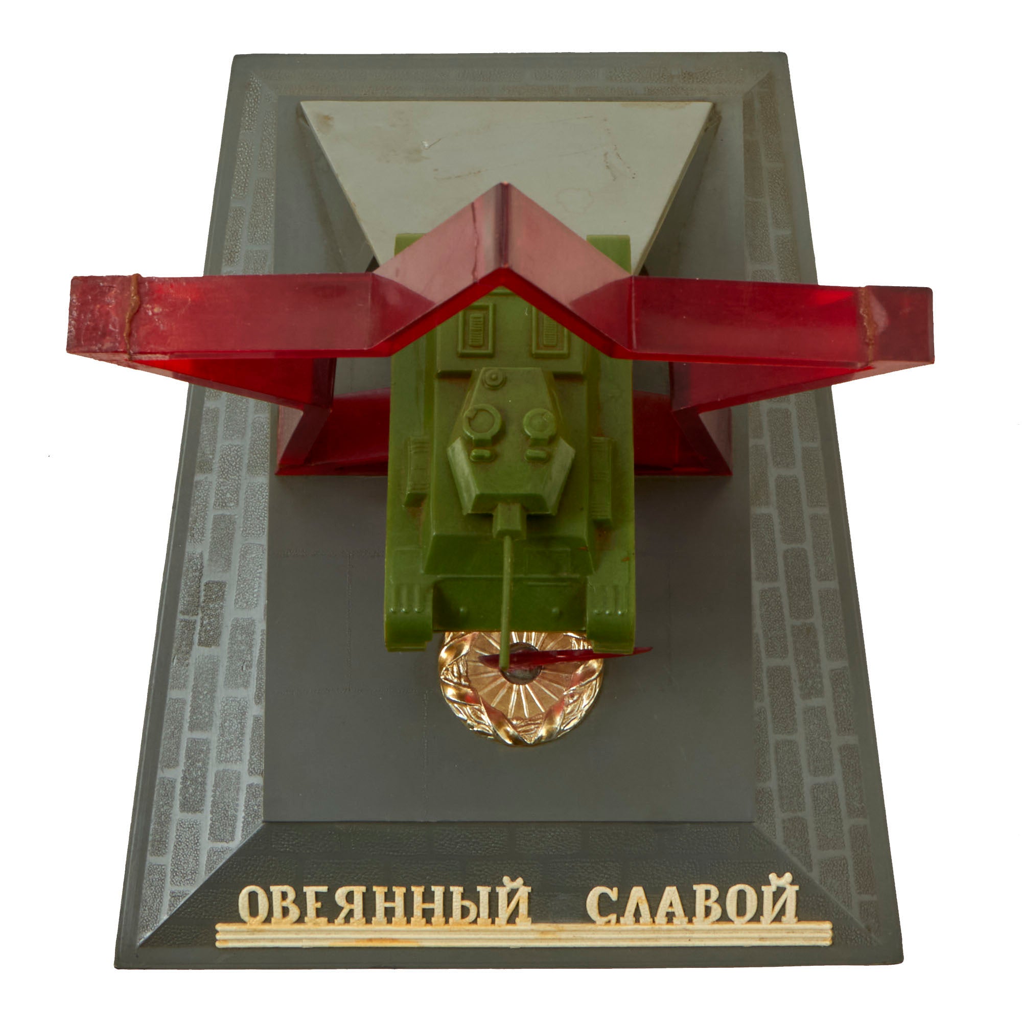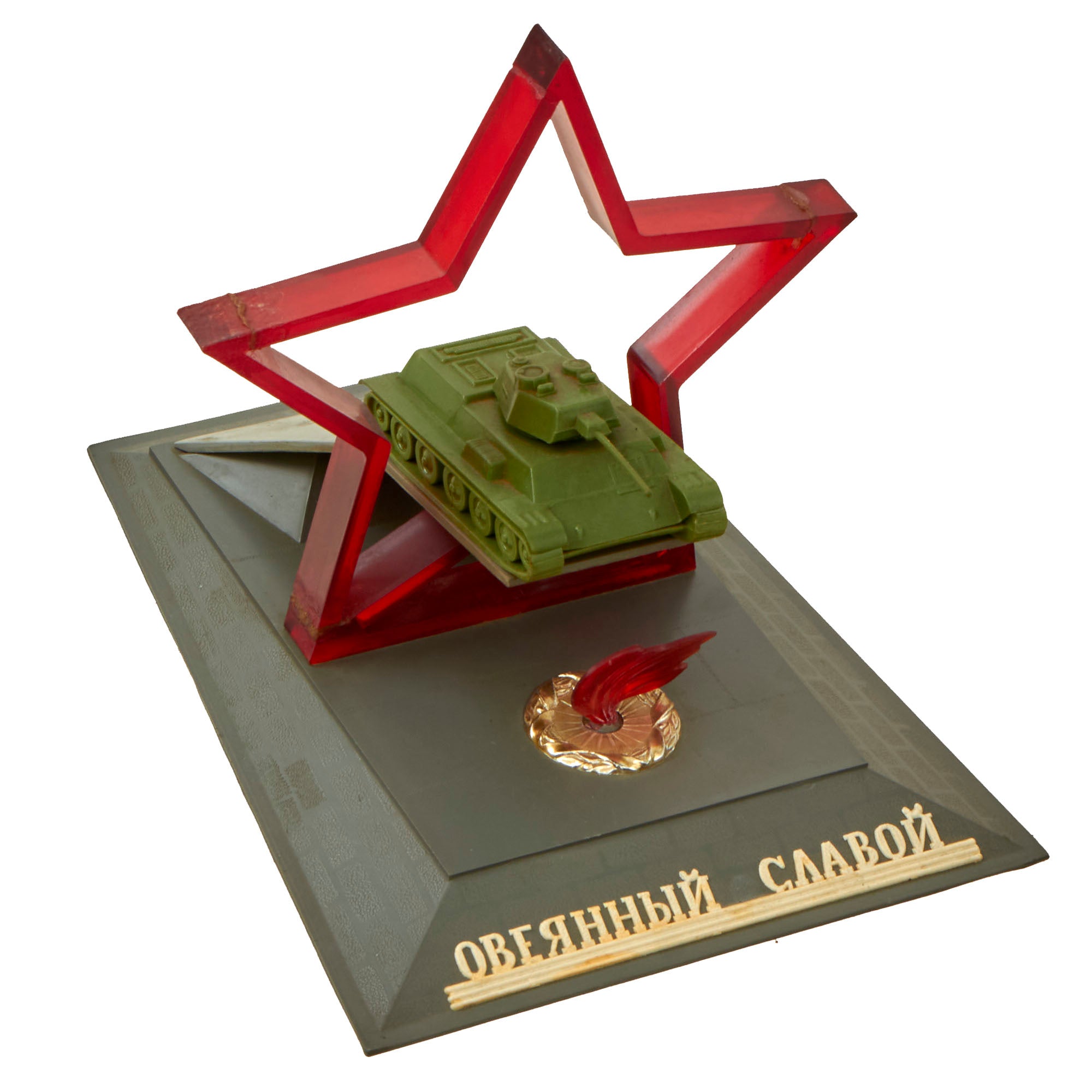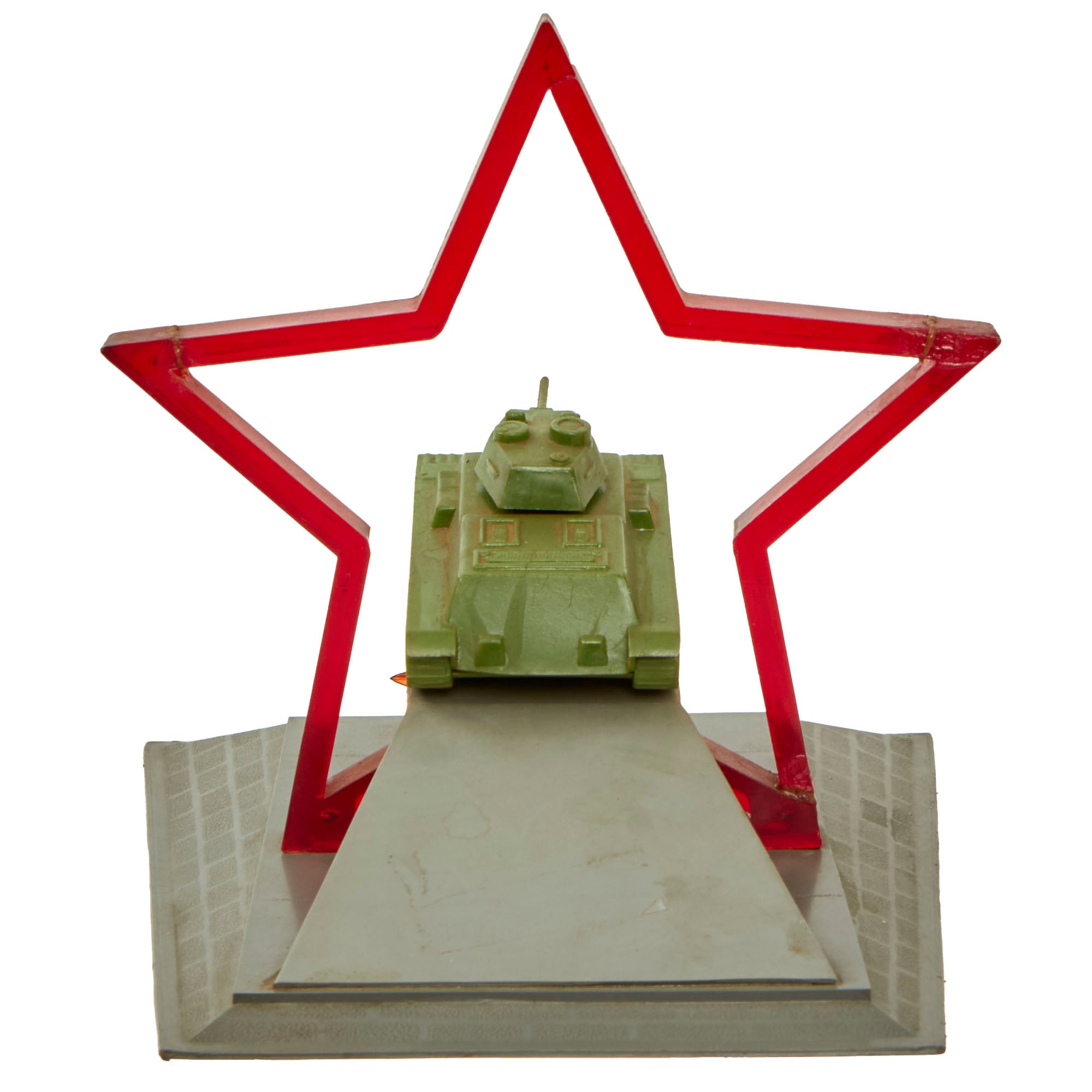Original Item: Only One available. This is a wonderful example of a T34 Tank desk model. The display is in fantastic condition and is made from plastic and depicts a T-34 driving through a Red Soviet star above a flame, the caption at the bottom translating to SHROUDED WITH GLORY.