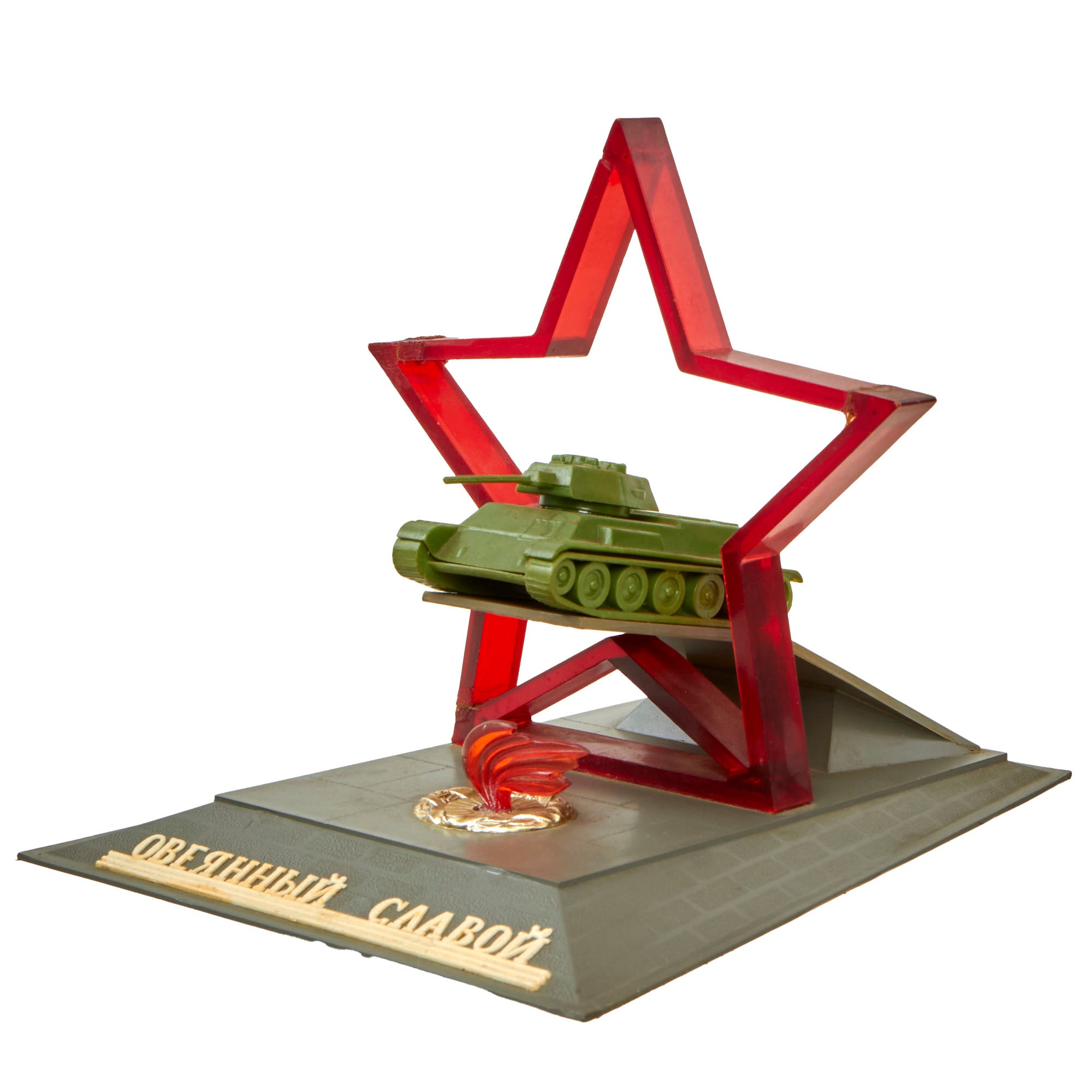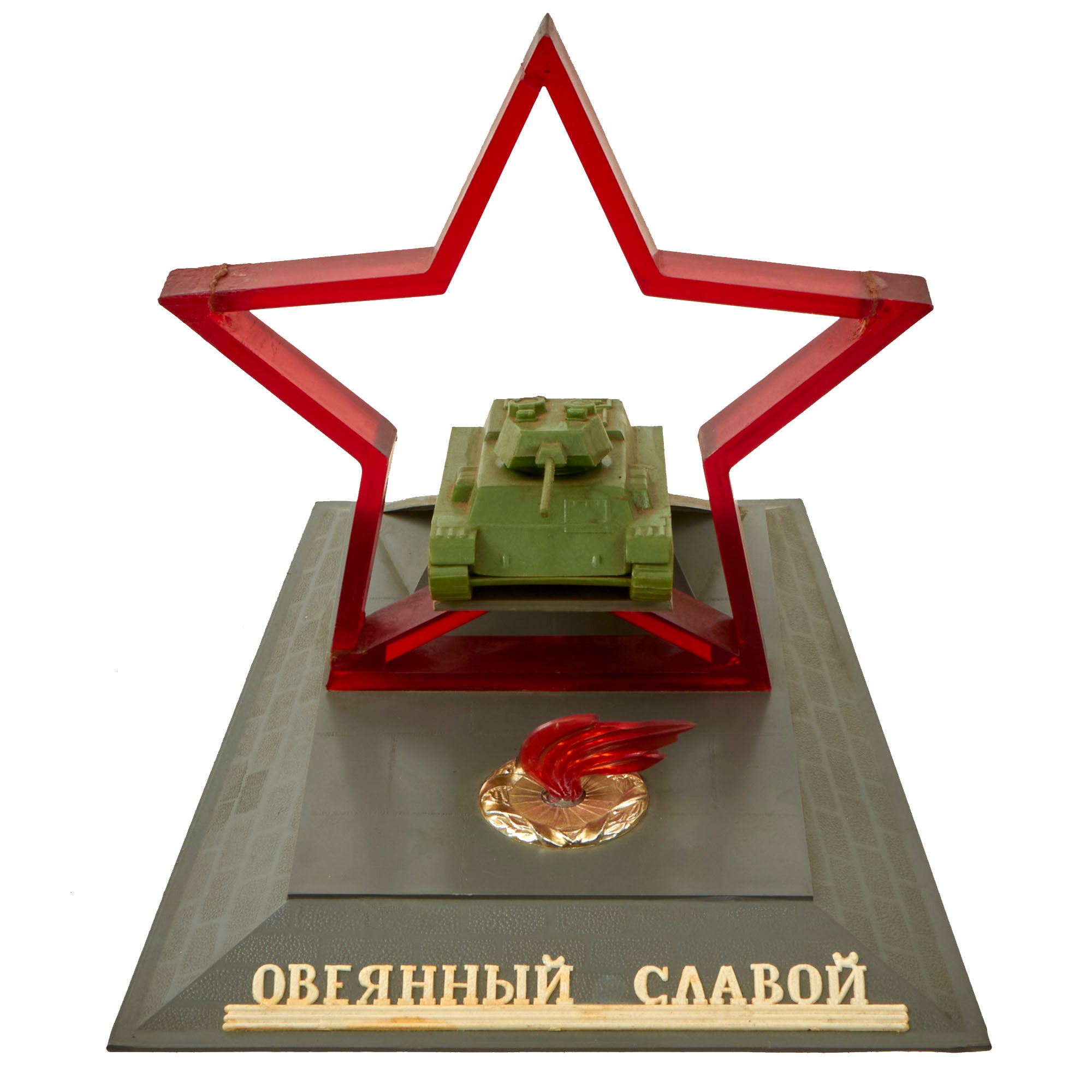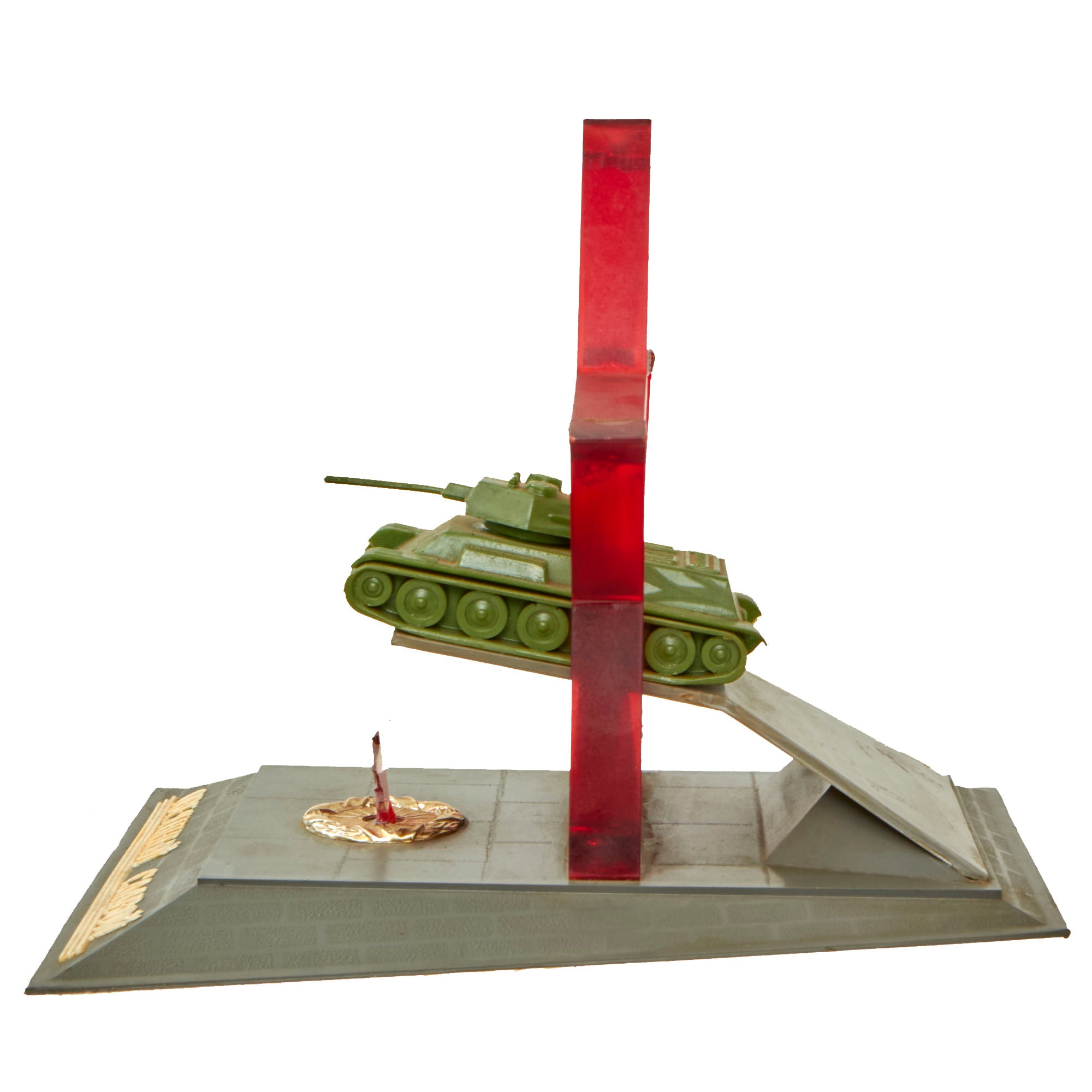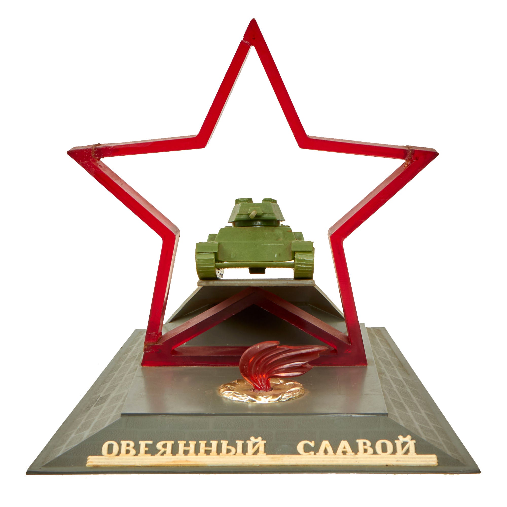 Original Item: Only One available. This is a wonderful example of a T34 Tank desk model. The display is in fantastic condition and is made from plastic and depicts a T-34 driving through a Red Soviet star above a flame, the caption at the bottom translating to SHROUDED WITH GLORY.