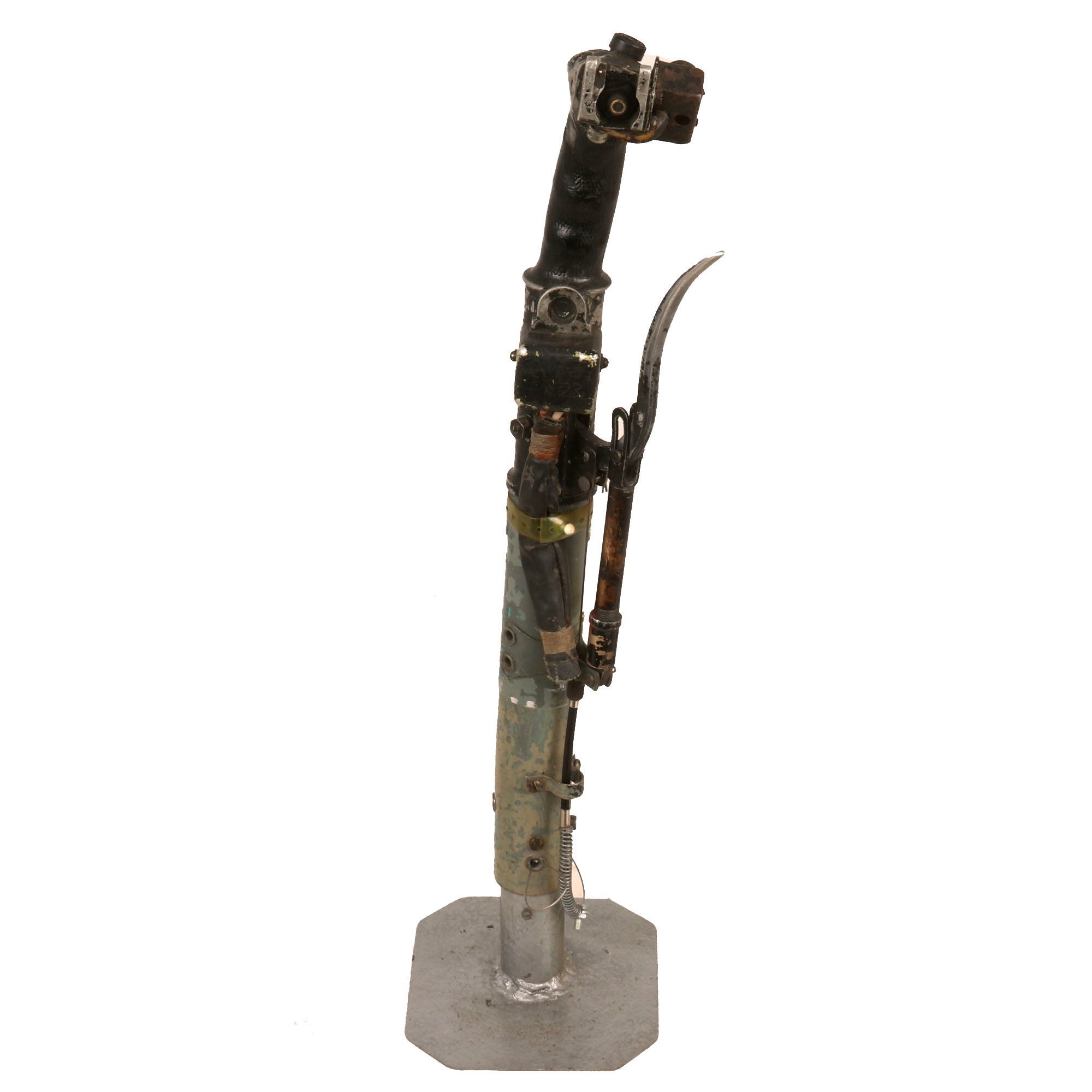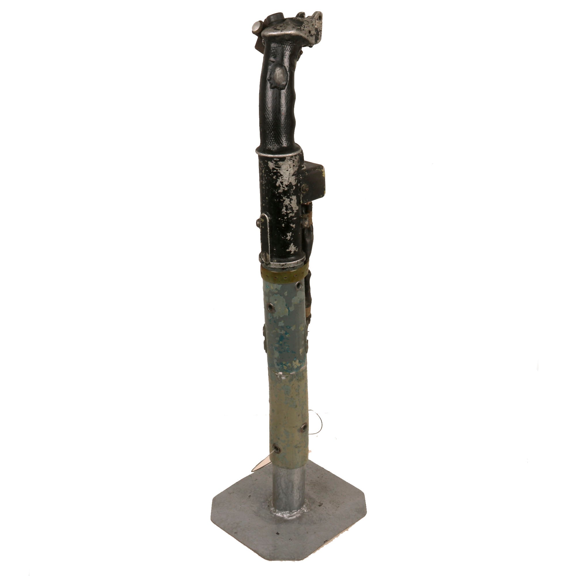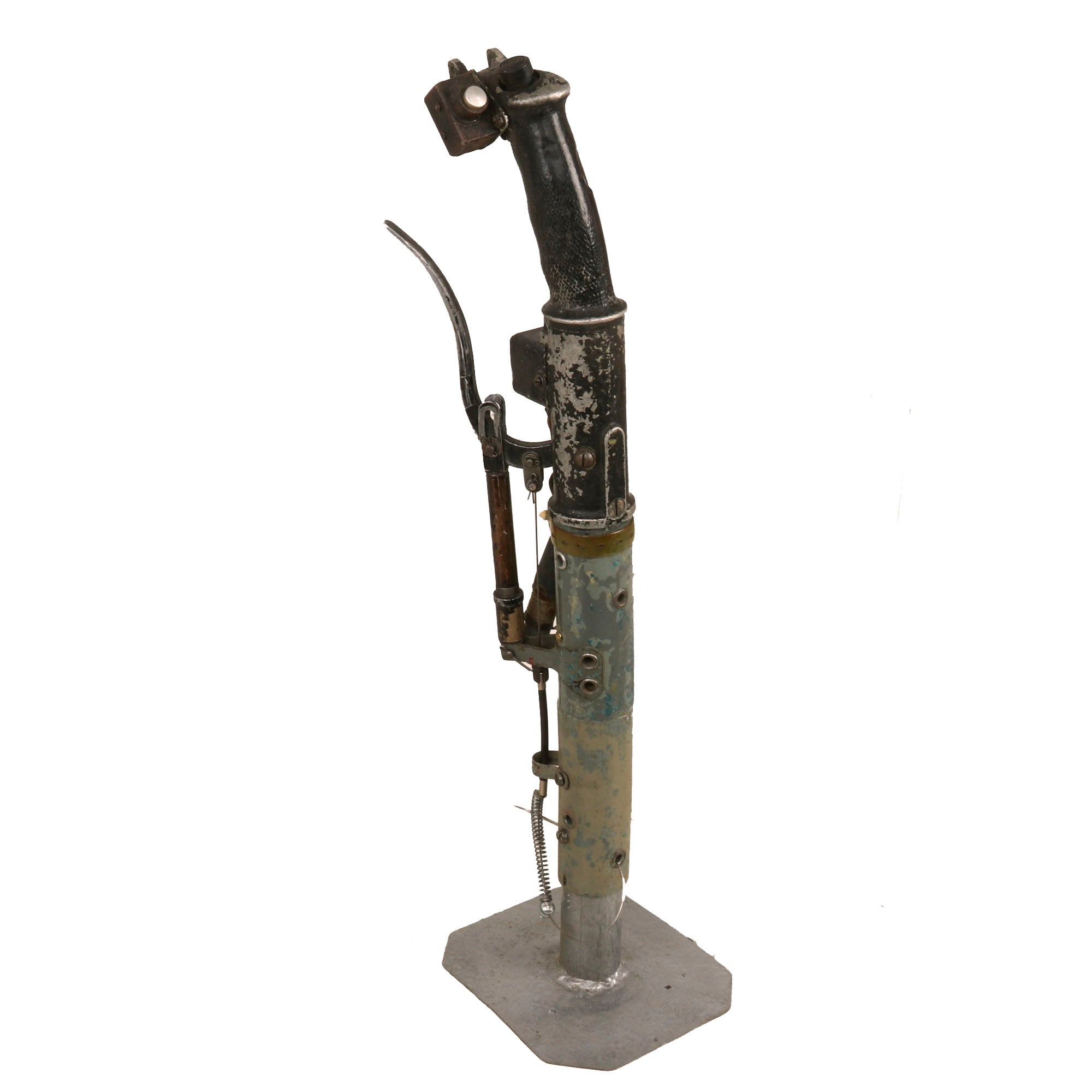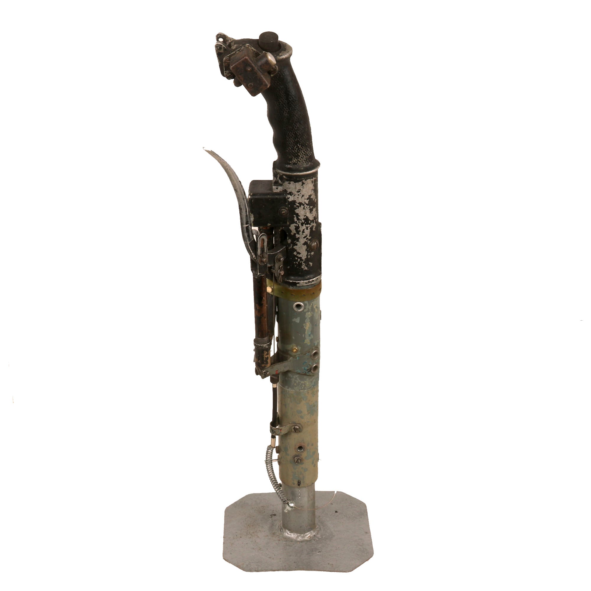 Original Item. Only One Available. The Mikoyan-Gurevich MiG-15 (NATO reporting name: Fagot) is a jet fighter aircraft developed by Mikoyan-Gurevich for the Soviet Union. The MiG-15 was one of the first successful jet fighters to incorporate swept wings to achieve high transonic speeds. In aerial combat during the Korean War, it outclassed straight-winged jet day fighters, which were largely relegated to ground-attack roles. In response to the MiG-15's appearance and in order to counter it, the United States Air Force rushed the North American F-86 Sabre to Korea.When refined into the more advanced MiG-17, the basic design would again surprise the West when it proved effective against supersonic fighters such as the Republic F-105 Thunderchief and McDonnell Douglas F-4 Phantom II in the Vietnam War of the 1960s.The MiG-15 is believed to have been one of the most produced jet aircraft with more than 13,000 manufactured. The MiG-15 remains in service with the Korean People's Army Air Force as an advanced trainer.This is a tremendous display piece, the control stick assembly of a Soviet MiG-15, which is in rough condition and missing the flip-down machine gun trigger. The stick shows heavy service use, and retains the Wheelbrake which has been set up with the display stand to actually function. The control stick for the MiG-15 was loosely copied from the German BF-109 control stick, and their similarities are clear.The stick retains the primary button and the side button attached with a small box. There is very little reference to the control stick of the MiG-15 as it was but a stepping stone in the MiG jet development. The stick on its display base measures roughly 22½” tall, and the base is roughly 6 x 7”. The stick retains some of its original paint but there is some heavy loss as shown. There is also some material loss on one side of the grip.This is an extraordinarily scarce piece in great service-used condition. Comes ready for further research and display!The first turbojet fighter developed by Mikoyan-Gurevich OKB was the Mikoyan-Gurevich MiG-9, which appeared in the years immediately after World War II. It used a pair of reverse-engineered German BMW 003 engines. The MiG-9 was a troublesome design that suffered from weak, unreliable engines and control problems. Categorized as a first-generation jet fighter, it was designed with the straight-style wings common to piston-engined fighters.In 1946 Soviet engine technology was far behind the West's. The Germans had been unable to develop airworthy turbojets with thrust over 1,130 kilograms-force (11,100 N; 2,500 lbf) capable of running for more than a few hours at the time of the surrender in May 1945, which limited the performance of immediate Soviet postwar jet aircraft designs. The Soviet aviation minister Mikhail Khrunichev and aircraft designer A. S. Yakovlev suggested to Premier Joseph Stalin that the USSR buy the reliable, fully developed, Rolls-Royce Nene (having been alerted to the fact that the UK Labour government wanted to improve post-war UK-Russia foreign relations) for the purpose of copying them in a minimum of time. Stalin is said to have replied, "What fool will sell us his secrets?"However, he gave his consent to the proposal and Mikoyan, engine designer Vladimir Yakovlevich Klimov, and others travelled to the United Kingdom to request the engines. To Stalin's amazement, the British Labour government and its Minister of Trade, Sir Stafford Cripps, were perfectly willing to provide technical information and a license to manufacture the Rolls-Royce Nene. Sample engines were purchased and delivered with blueprints. Following evaluation and adaptation to Russian conditions, the windfall technology was tooled for mass-production as the Klimov RD-45 to be incorporated into the MiG-15.