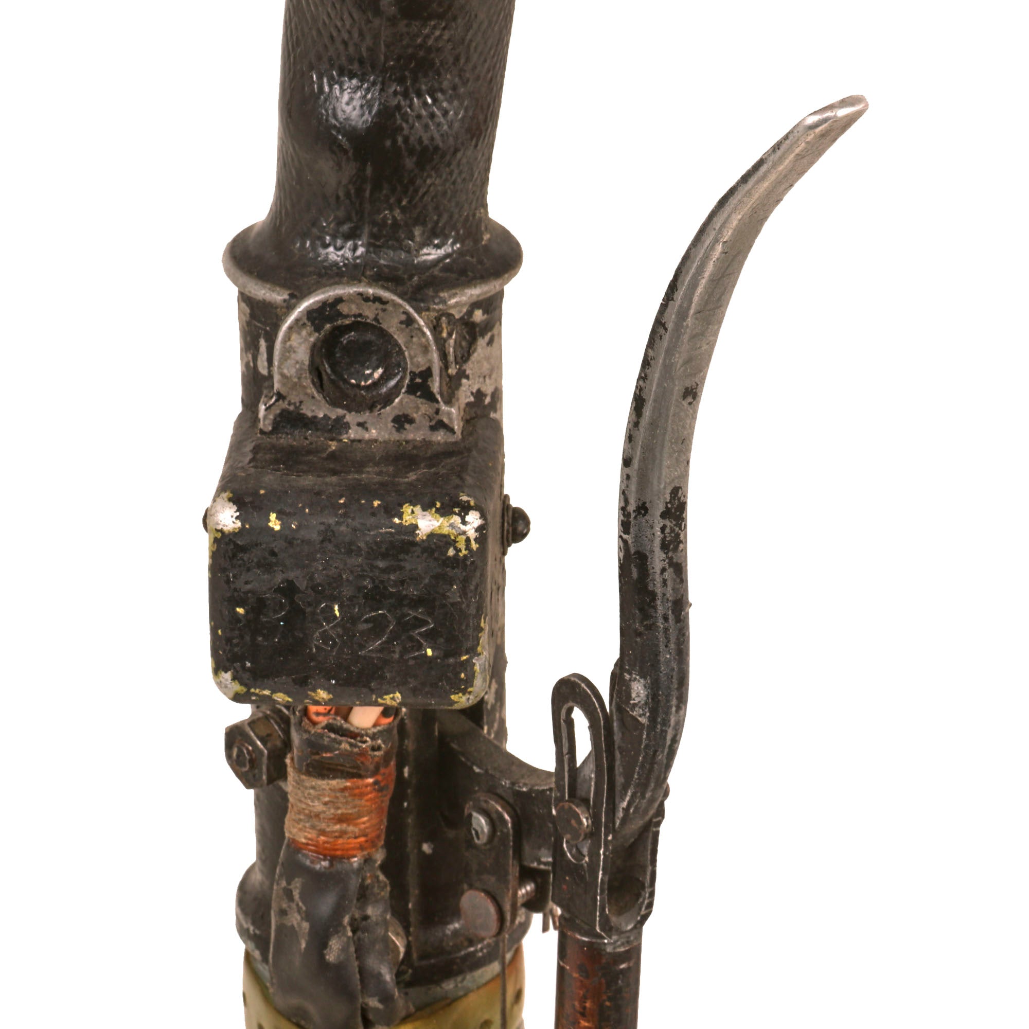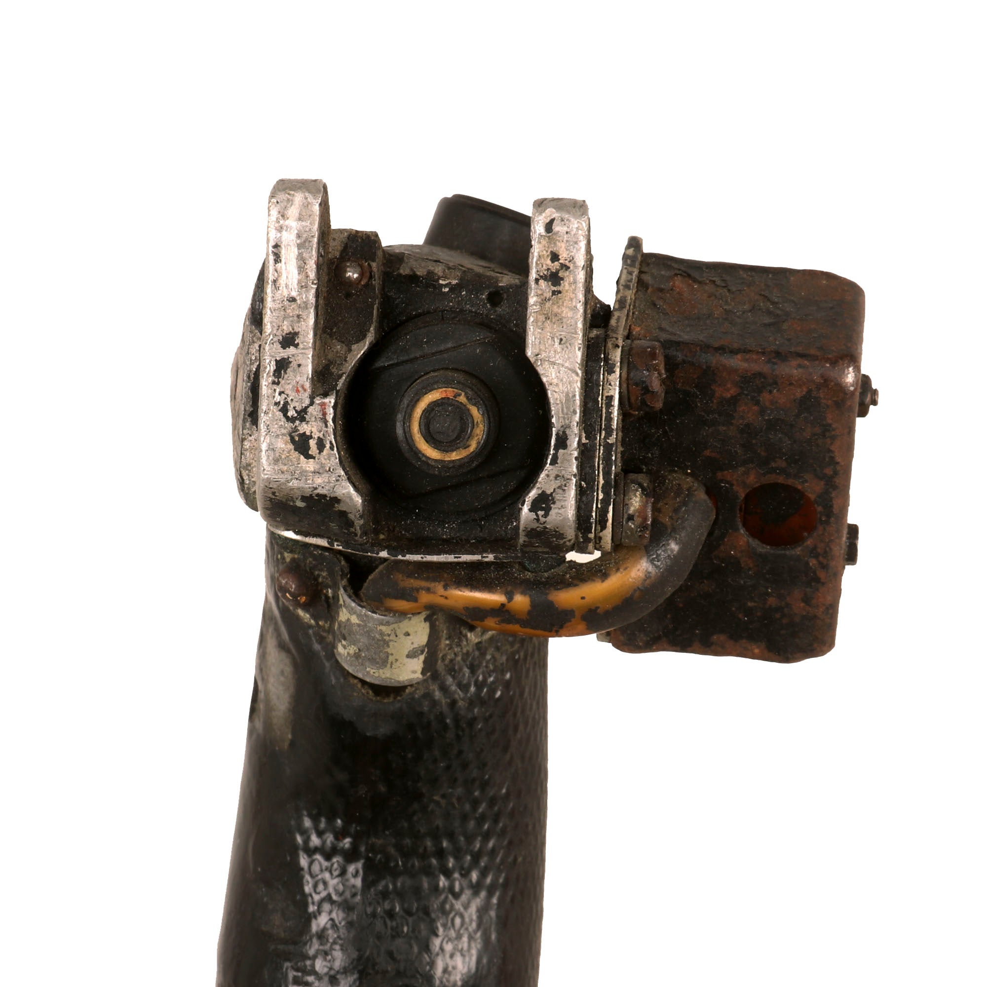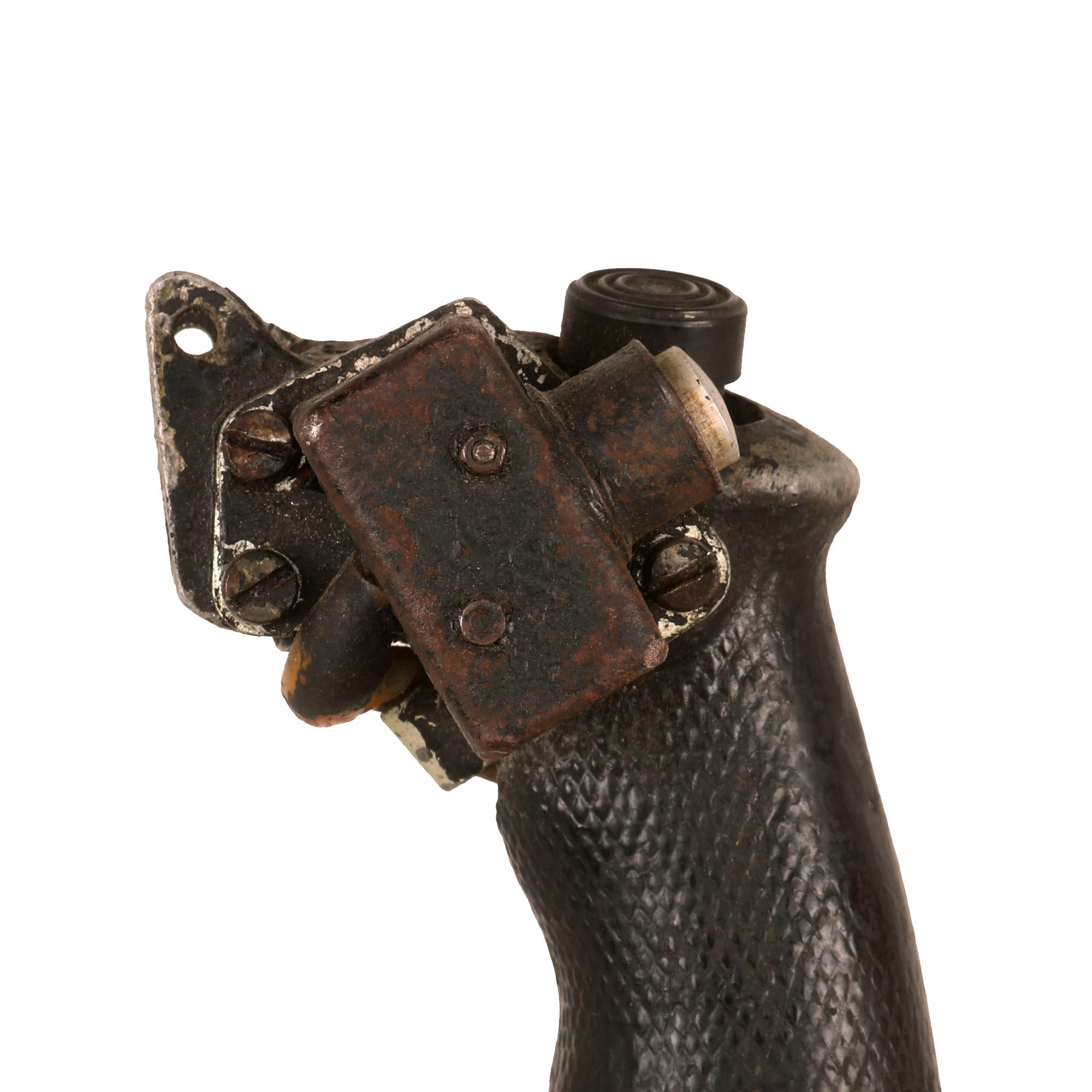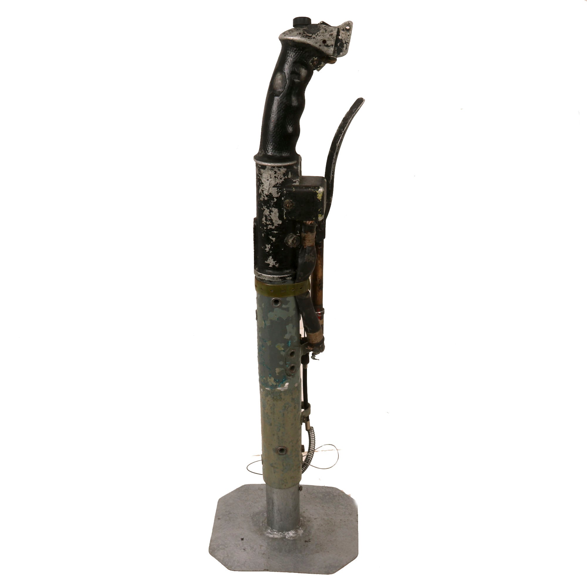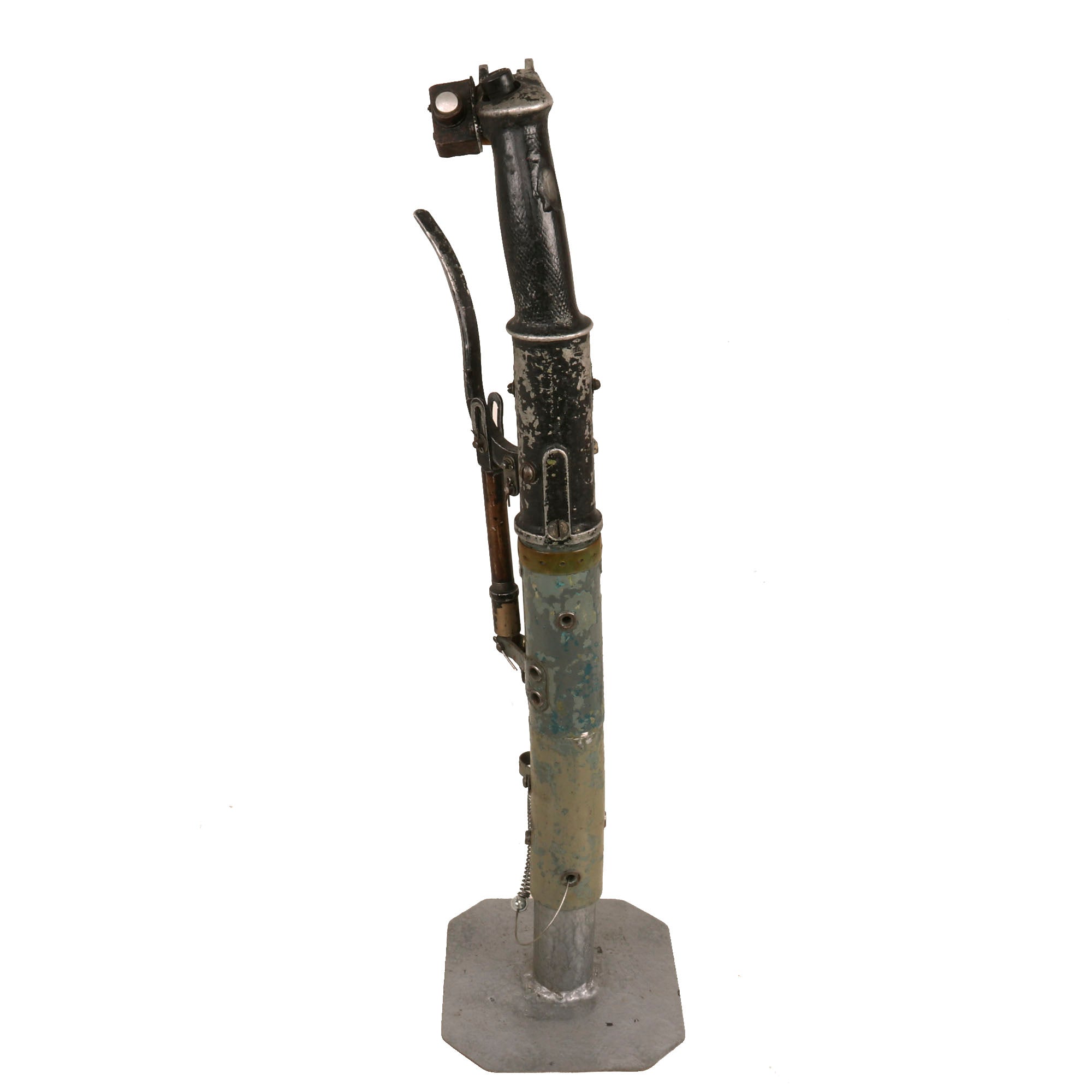 Original Item. Only One Available. The Mikoyan-Gurevich MiG-15 (NATO reporting name: Fagot) is a jet fighter aircraft developed by Mikoyan-Gurevich for the Soviet Union. The MiG-15 was one of the first successful jet fighters to incorporate swept wings to achieve high transonic speeds. In aerial combat during the Korean War, it outclassed straight-winged jet day fighters, which were largely relegated to ground-attack roles. In response to the MiG-15's appearance and in order to counter it, the United States Air Force rushed the North American F-86 Sabre to Korea.When refined into the more advanced MiG-17, the basic design would again surprise the West when it proved effective against supersonic fighters such as the Republic F-105 Thunderchief and McDonnell Douglas F-4 Phantom II in the Vietnam War of the 1960s.The MiG-15 is believed to have been one of the most produced jet aircraft with more than 13,000 manufactured. The MiG-15 remains in service with the Korean People's Army Air Force as an advanced trainer.This is a tremendous display piece, the control stick assembly of a Soviet MiG-15, which is in rough condition and missing the flip-down machine gun trigger. The stick shows heavy service use, and retains the Wheelbrake which has been set up with the display stand to actually function. The control stick for the MiG-15 was loosely copied from the German BF-109 control stick, and their similarities are clear.The stick retains the primary button and the side button attached with a small box. There is very little reference to the control stick of the MiG-15 as it was but a stepping stone in the MiG jet development. The stick on its display base measures roughly 22½” tall, and the base is roughly 6 x 7”. The stick retains some of its original paint but there is some heavy loss as shown. There is also some material loss on one side of the grip.This is an extraordinarily scarce piece in great service-used condition. Comes ready for further research and display!The first turbojet fighter developed by Mikoyan-Gurevich OKB was the Mikoyan-Gurevich MiG-9, which appeared in the years immediately after World War II. It used a pair of reverse-engineered German BMW 003 engines. The MiG-9 was a troublesome design that suffered from weak, unreliable engines and control problems. Categorized as a first-generation jet fighter, it was designed with the straight-style wings common to piston-engined fighters.In 1946 Soviet engine technology was far behind the West's. The Germans had been unable to develop airworthy turbojets with thrust over 1,130 kilograms-force (11,100 N; 2,500 lbf) capable of running for more than a few hours at the time of the surrender in May 1945, which limited the performance of immediate Soviet postwar jet aircraft designs. The Soviet aviation minister Mikhail Khrunichev and aircraft designer A. S. Yakovlev suggested to Premier Joseph Stalin that the USSR buy the reliable, fully developed, Rolls-Royce Nene (having been alerted to the fact that the UK Labour government wanted to improve post-war UK-Russia foreign relations) for the purpose of copying them in a minimum of time. Stalin is said to have replied, "What fool will sell us his secrets?"However, he gave his consent to the proposal and Mikoyan, engine designer Vladimir Yakovlevich Klimov, and others travelled to the United Kingdom to request the engines. To Stalin's amazement, the British Labour government and its Minister of Trade, Sir Stafford Cripps, were perfectly willing to provide technical information and a license to manufacture the Rolls-Royce Nene. Sample engines were purchased and delivered with blueprints. Following evaluation and adaptation to Russian conditions, the windfall technology was tooled for mass-production as the Klimov RD-45 to be incorporated into the MiG-15.