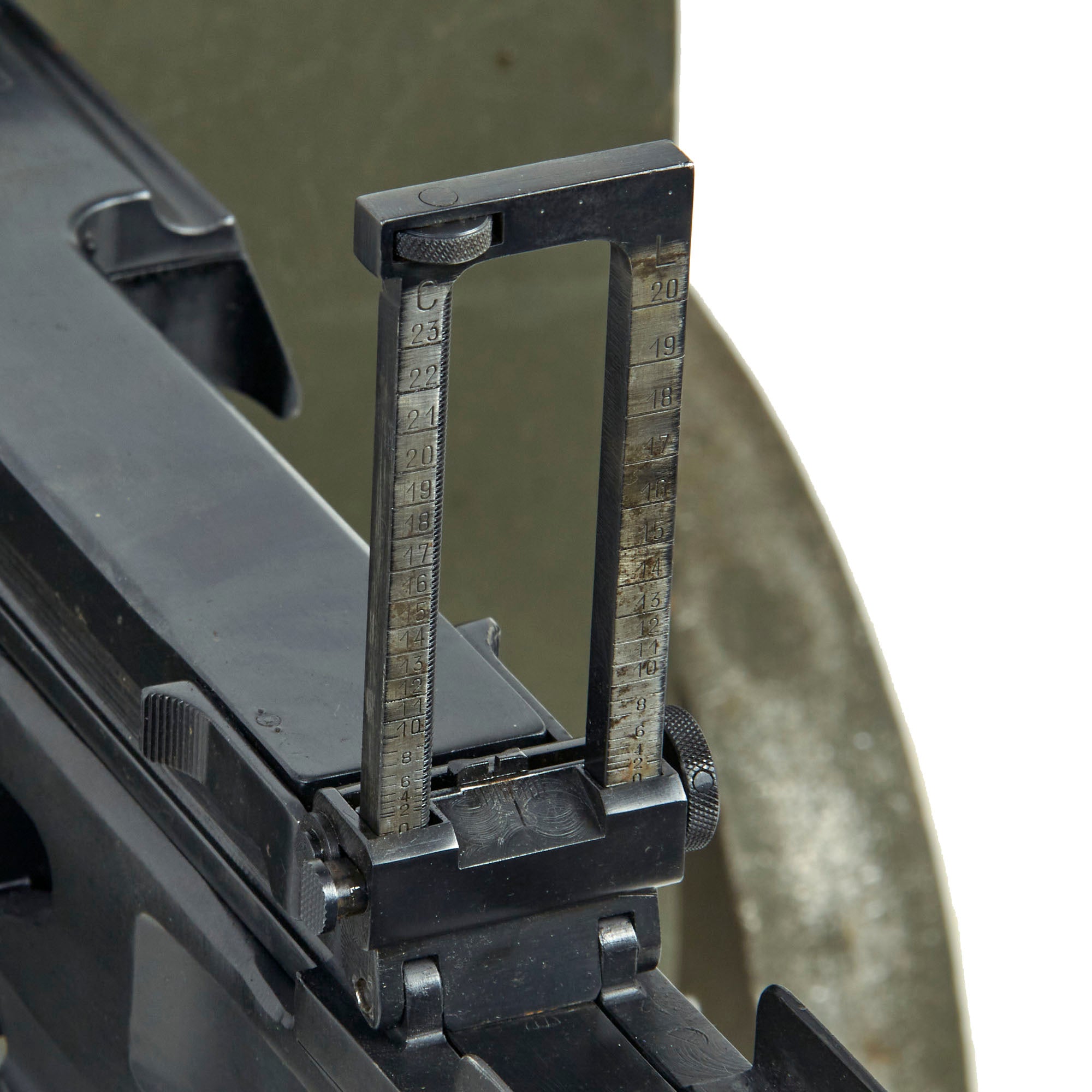 This SGM wz.43 display machine gun is really in great shape, and looks fantastic, with the original heavy blued finish very well retained. The grips are in great shape, and the carry handle on the barrel is great as well. The front and rear sights are both present and functional, and the mount has the original shield and the elevation controls still work.