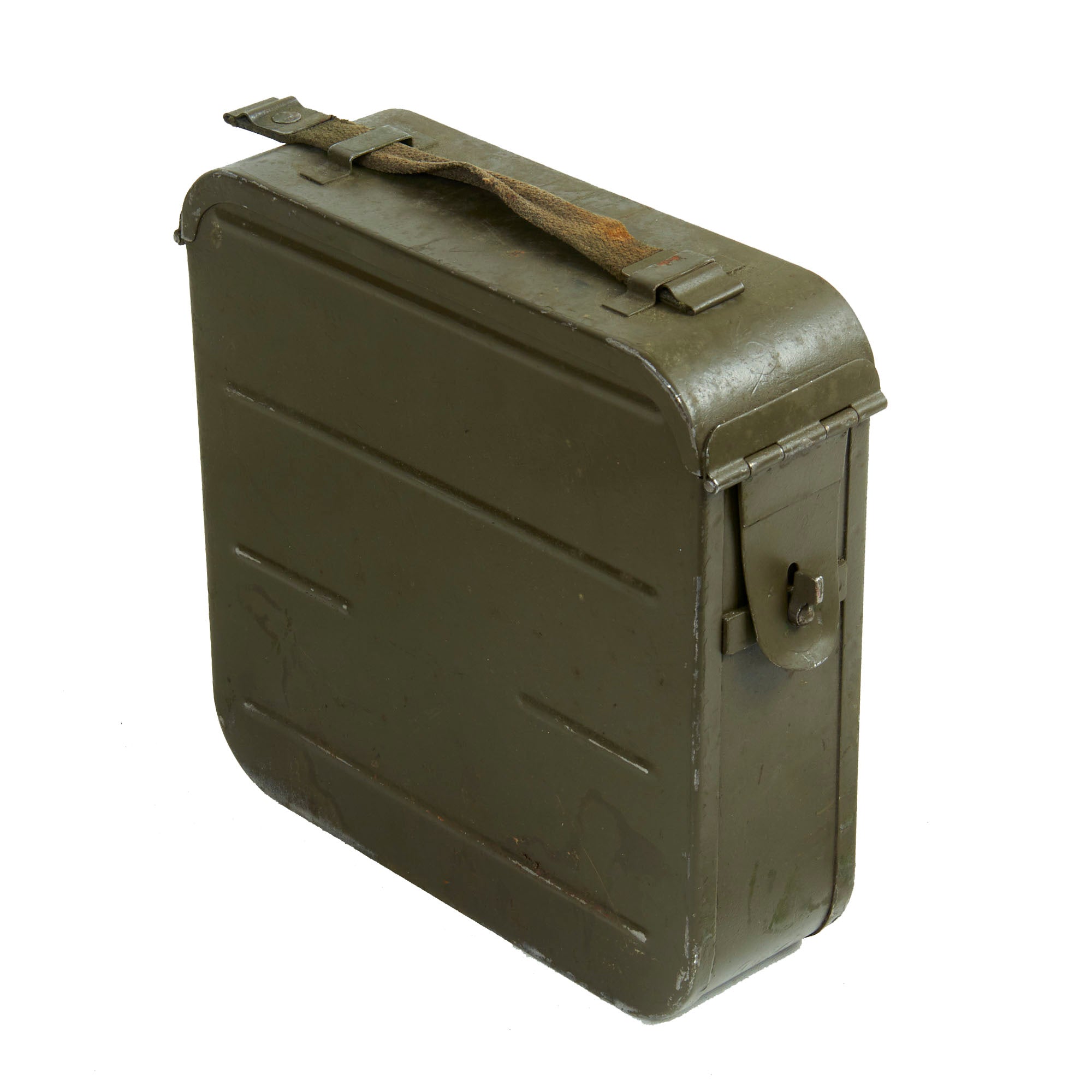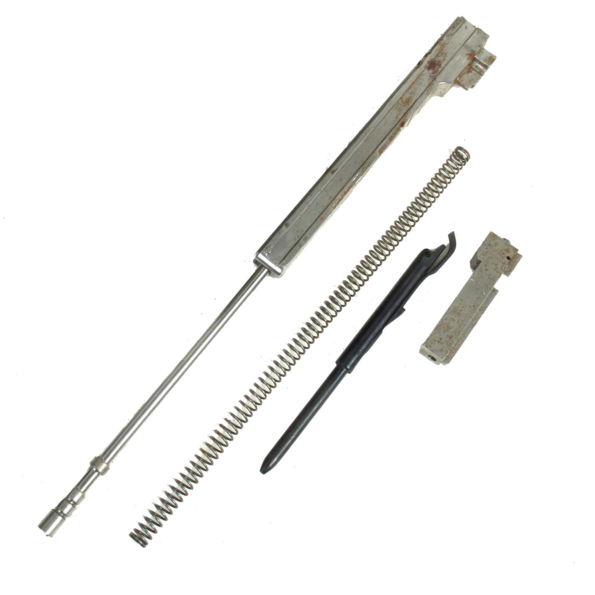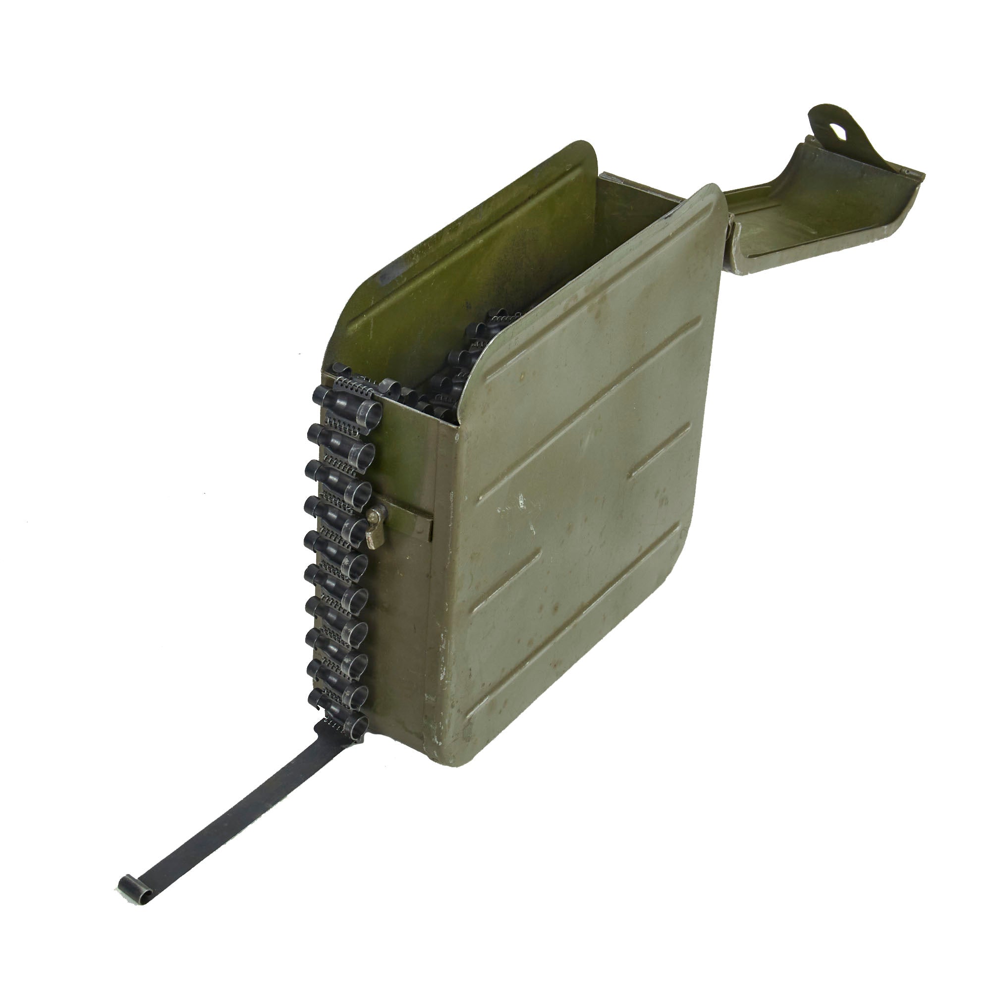 Included is an original steel belt inside a chest, which looks to be the standard PKM / SGM style used by Soviet forces during WWII in all of their belt fed machine guns. Also included are internal components not used during construction of the display gun, which look to be the gas piston, bolt, recoil spring, and recoil spring guide.
