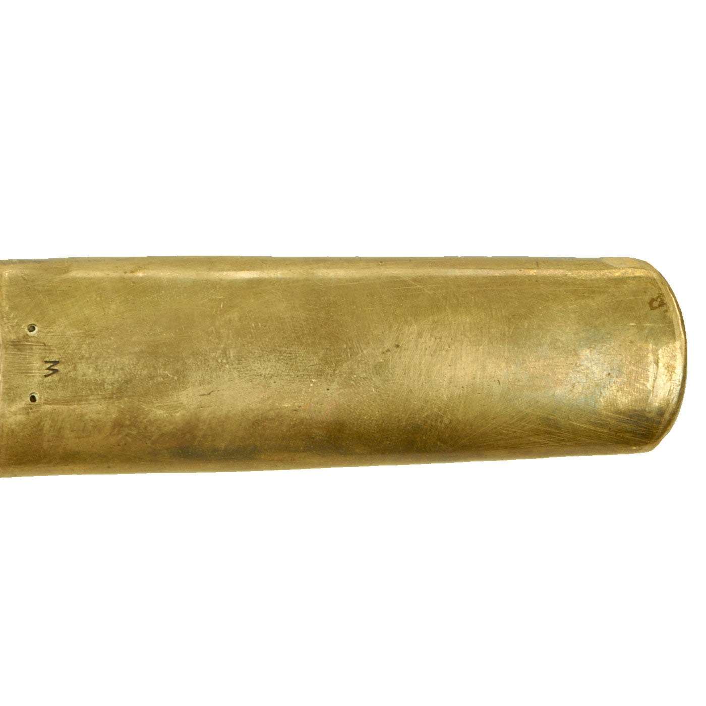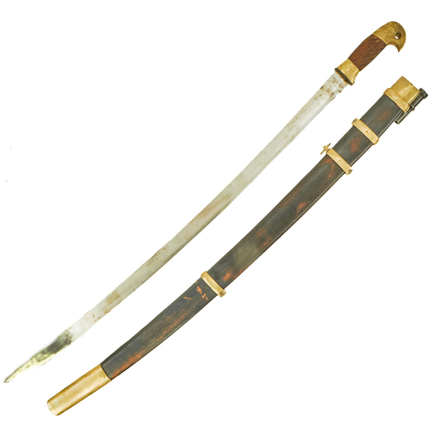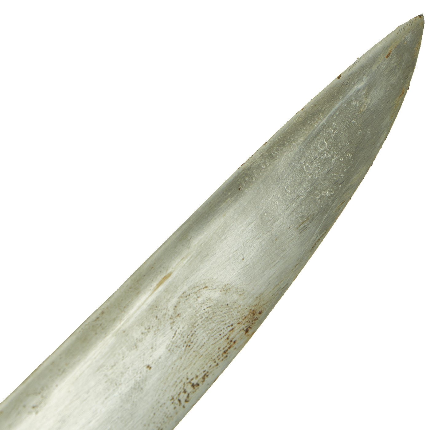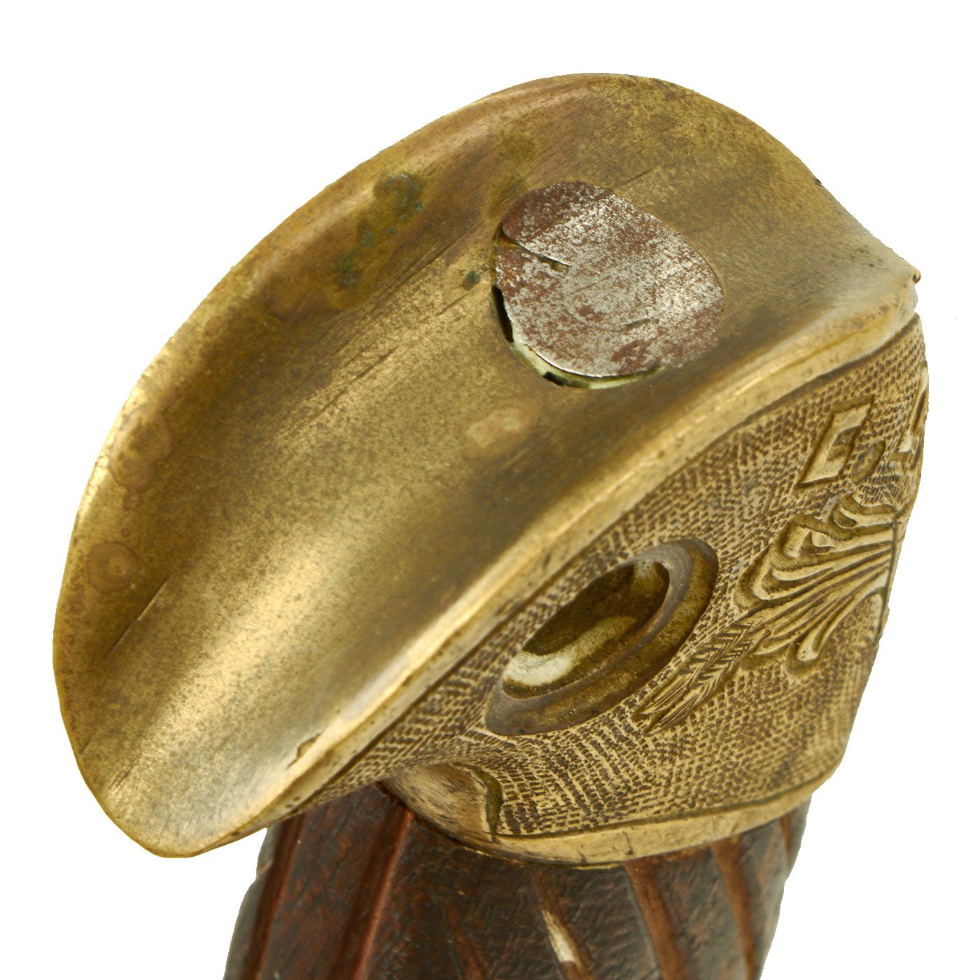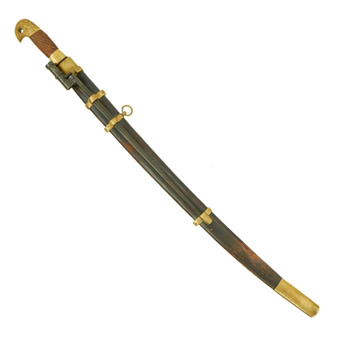 Condition is very good, with just a bit of oxidation staining and speckling on the blade, and a lovely patina on the brass hilt. The wood is in great shape, and the hilt is still tight on the tang, with no wobble.