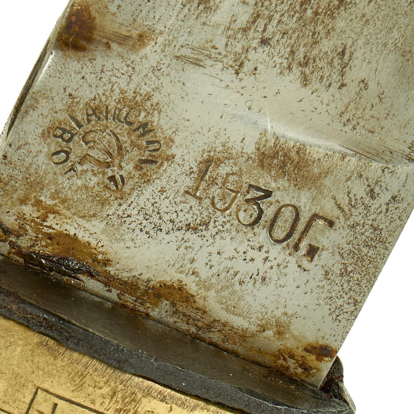 This is a classic Soviet Cossack cavalry Shashka (Shashqua) saber that bears a "Hammer & Sickle" Soviet insignia over an Eagle and has C.C.C.P. cast into the brass hilt pommel. This model of Shashka saber was never fitted with any hilt cross guard. The 32" blade which is still highly polished has Soviet armorer markings and is dated 1930г. (г is short for год - "god", the Russian word for year). There are maker markings on the blade and the handle, and there also appear to be Russian regimental markings stamped into one side, which we are not able to identify.