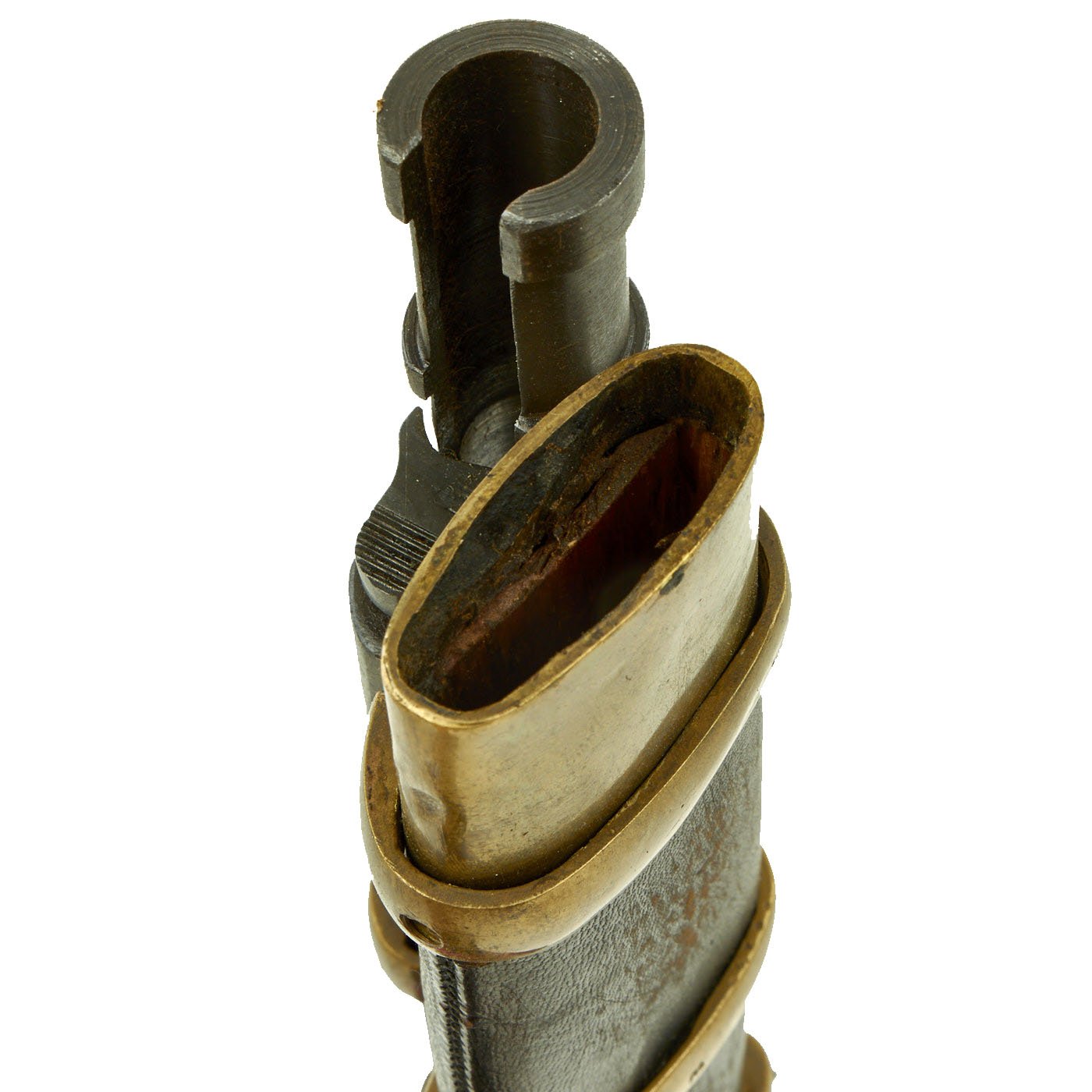 The traditional Shashqua scabbard is constructed of a leather covered wood body which is coated in a hard black wax like material supported by brass mounts. The scabbard also bears brass mounts to accommodate the included Mosin-Nagant 1891/30 socket bayonet, which is in very good condition. Cossack cavalryman traditionally wore this slung across his back while mounted on horseback. It could also be hung at the side, and was worn edge up for a quick draw.