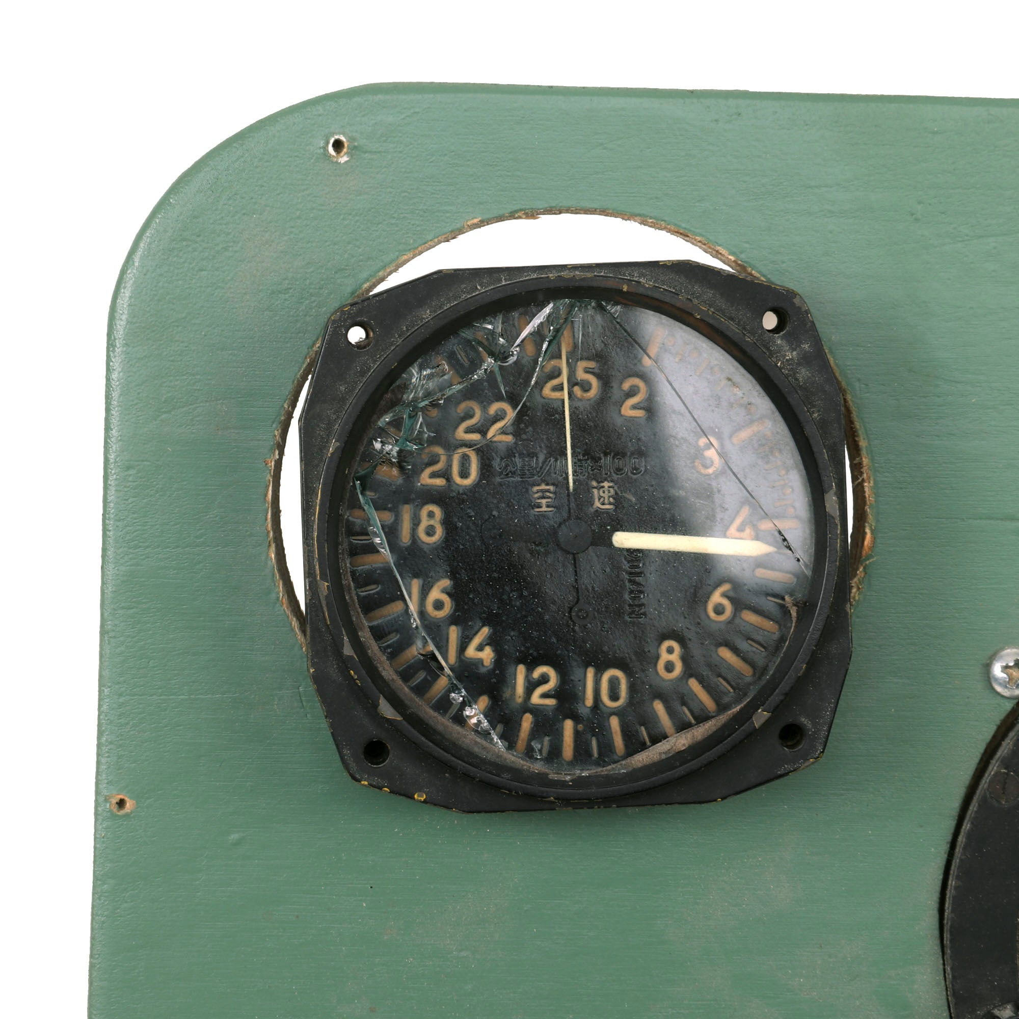 The Chinese gauge is marked with a tag A.S. INDIC. CHINESE A.F. MIG-21, indicating this came off of a Mikoyan-Gurevich MiG-21 supersonic jet fighter, dating it to the 1950s/1960s. The gauge reads AIR SPEED in chinese. The glass on this gauge is cracked as shown.
