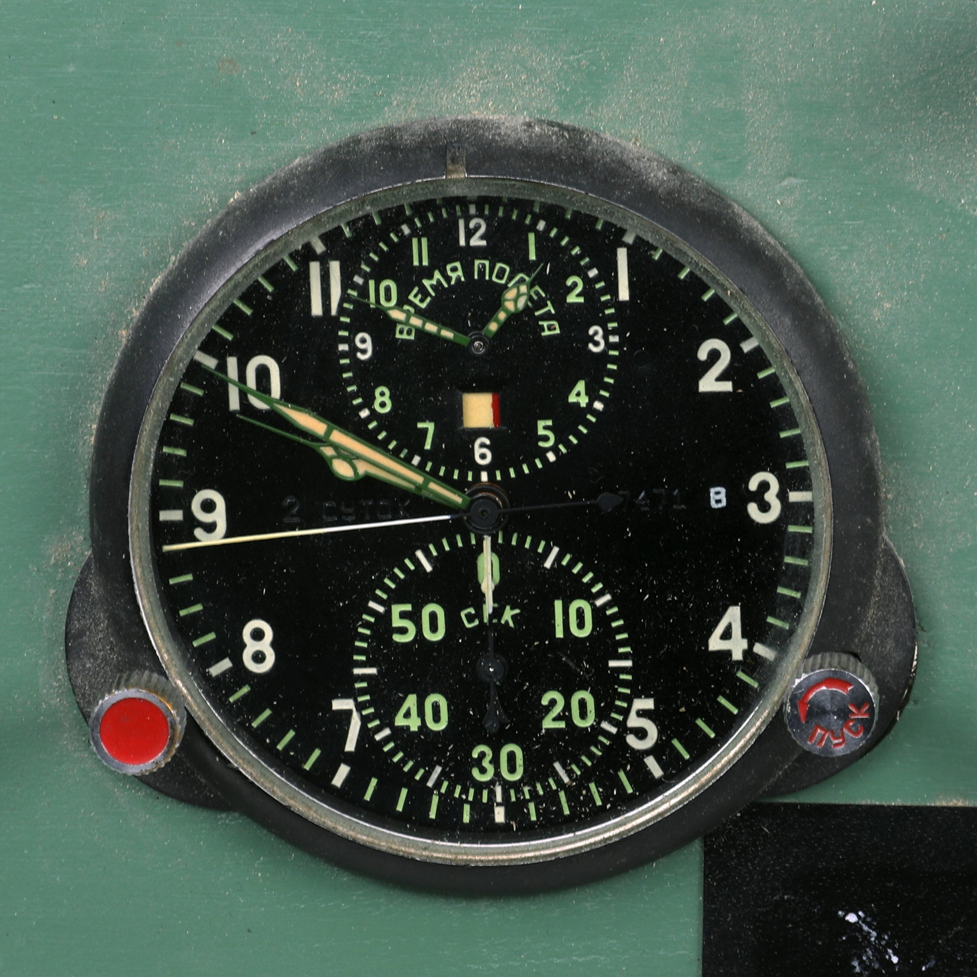 The top right Russian gauge is marked KM HEIGHT which indicates it measures altitude. The lower left gauge is a clock that still winds and functions, with the right knob turning it on and off. The lower right gauge measures speed in km. The middle gauge is a gyro gauge which is definitely the coolest of the set.