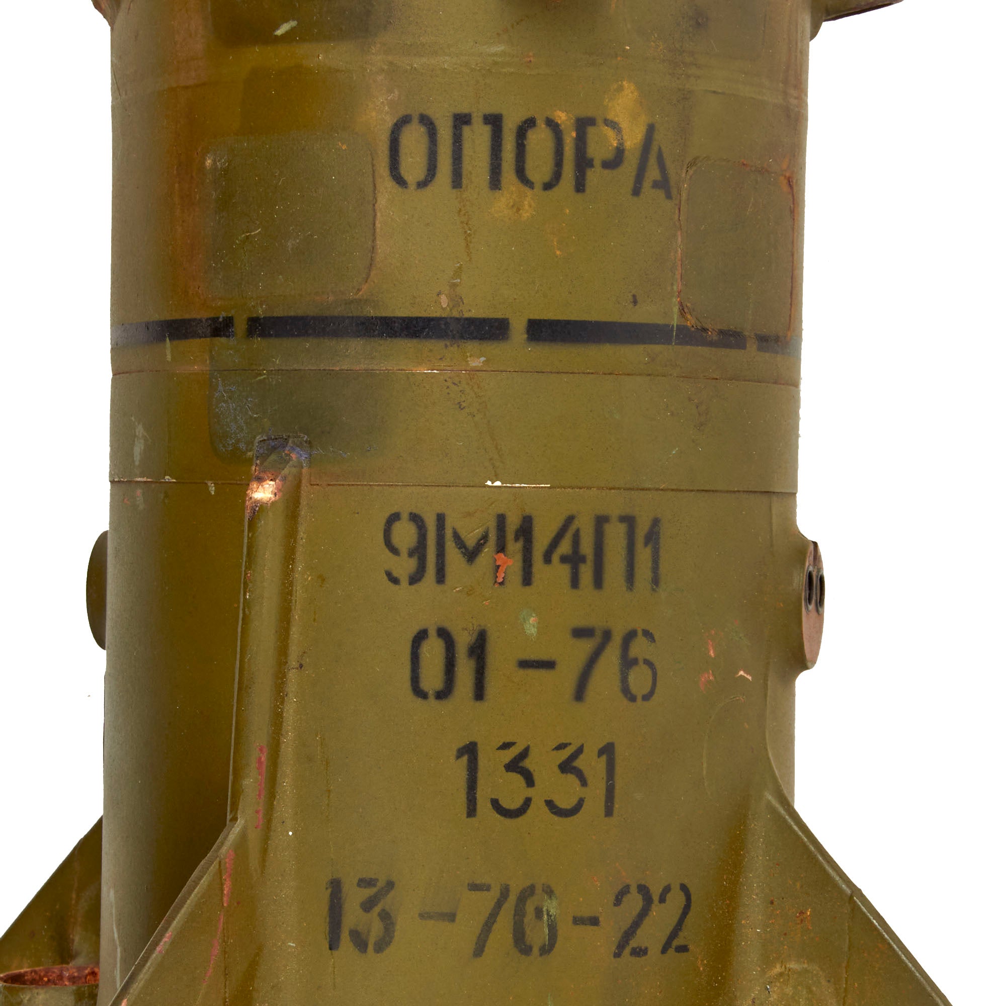 This example is a training missile, intended for assembly and loading drills. It is not functional, and can never be converted into any type of functional weapon. It appears to have a date of January 1976. It’s roughly 35” long. There is heavy wear and oxidation to the paint.