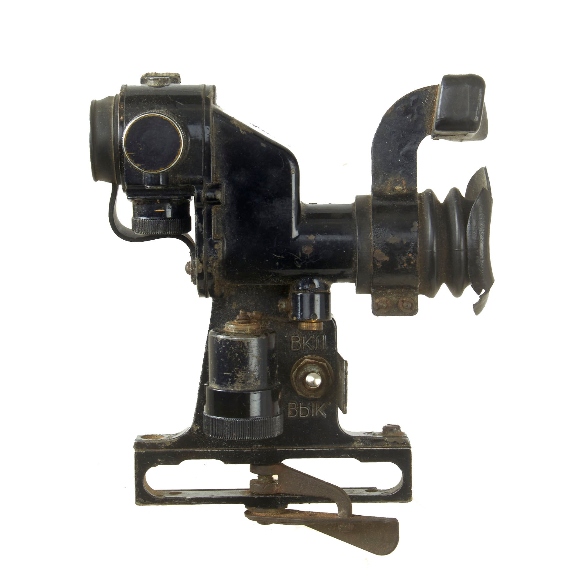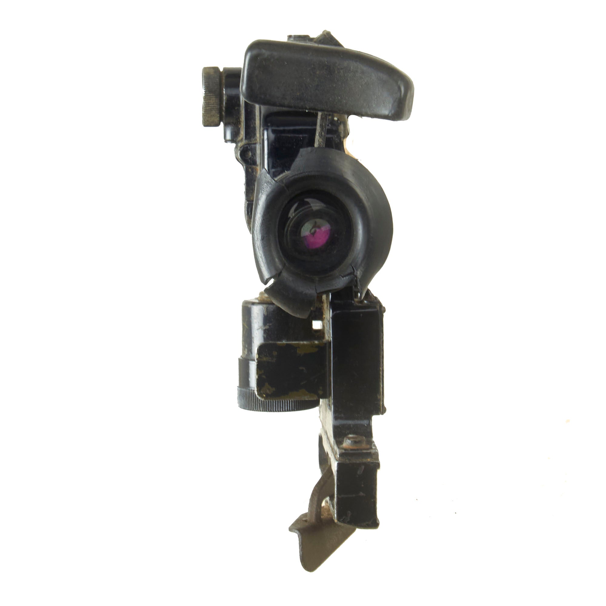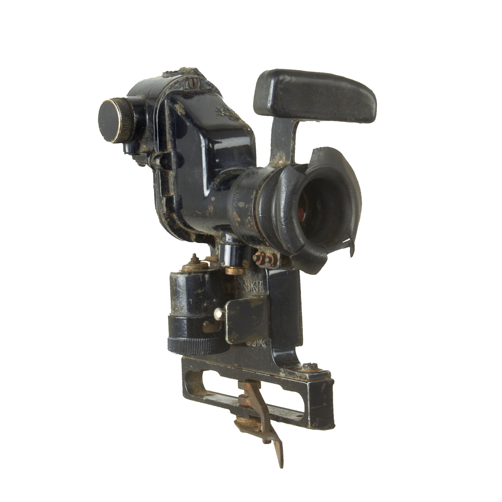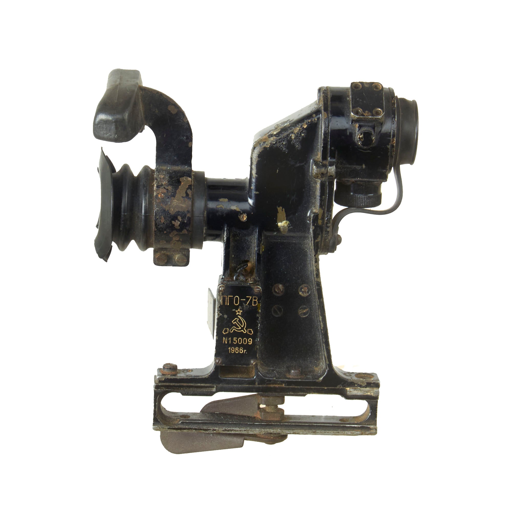 This PGO-7 is of original Soviet manufacture as is identifiable by the Hammer & Sickle insignia. It retains the switch on the side, and both the rubber eye cup and lens cover and intact, but the eye-cup rubber is cracking. The data plate is marked with serial number N15009 over 1966r, for a date of 1966.