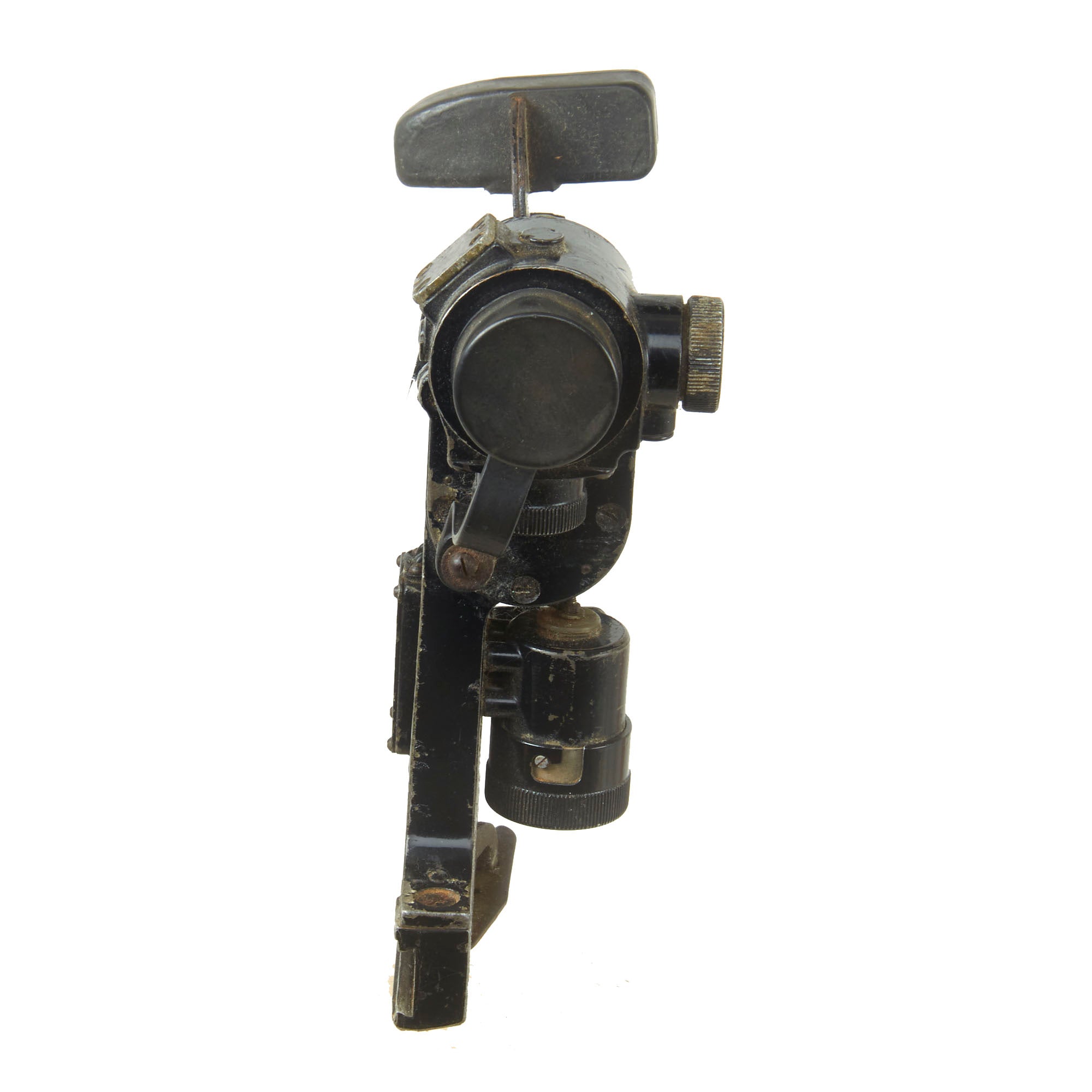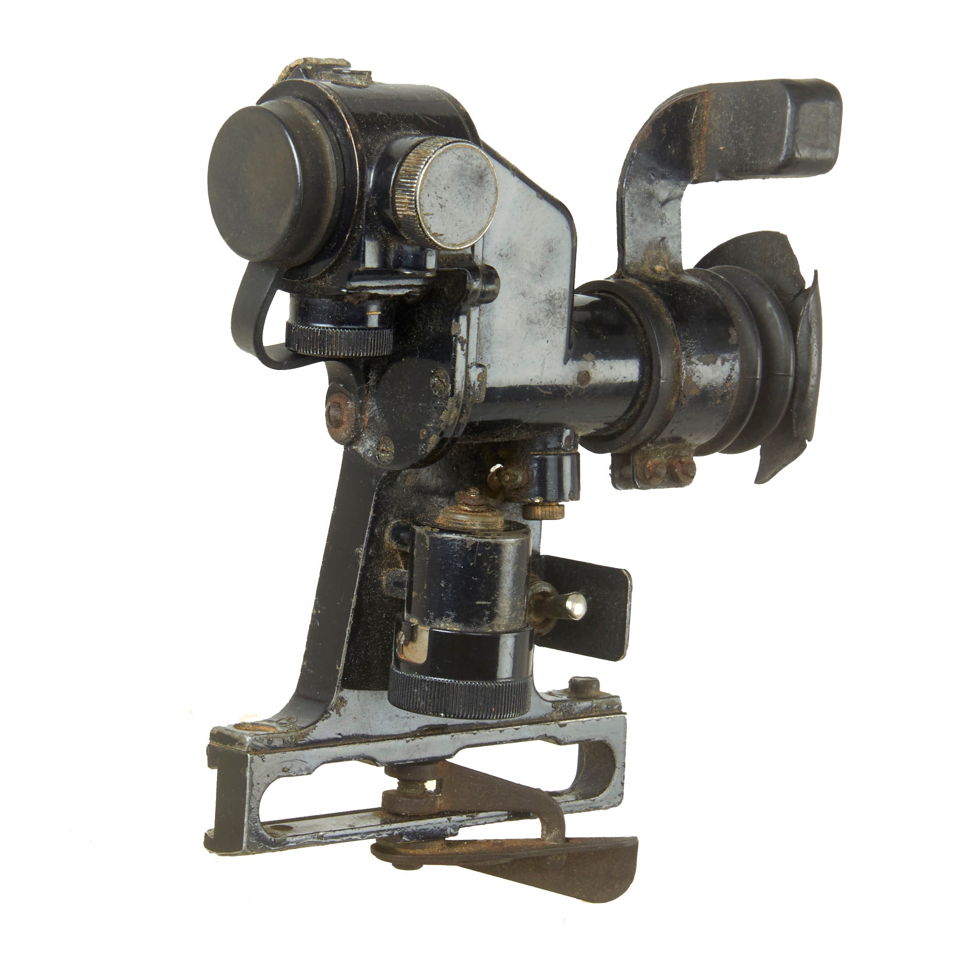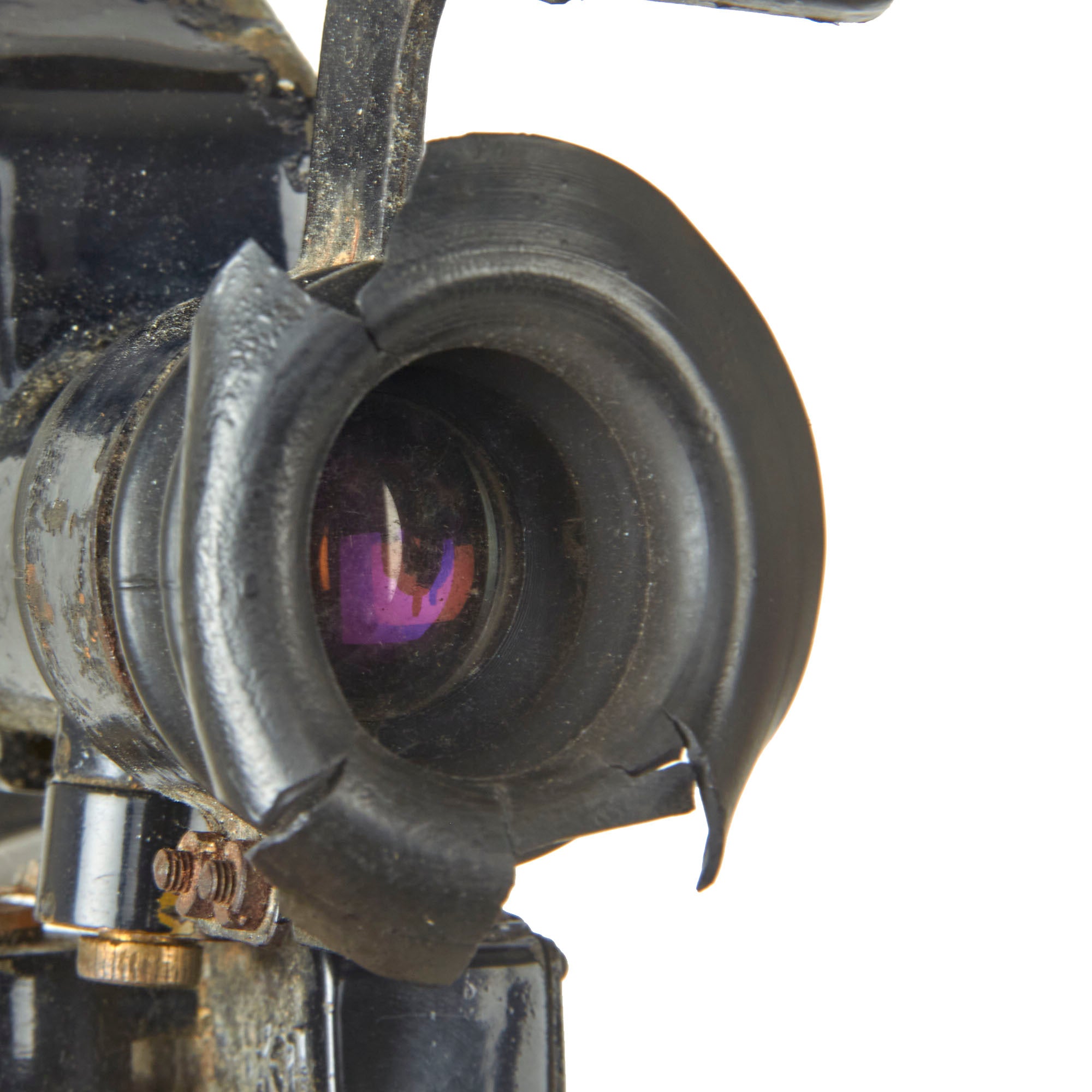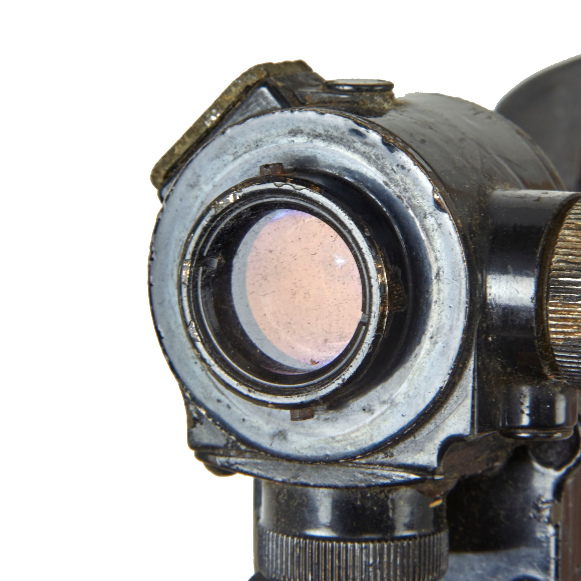 This PGO-7 is of original Soviet manufacture as is identifiable by the Hammer & Sickle insignia. It retains the switch on the side, and both the rubber eye cup and lens cover and intact, but the eye-cup rubber is cracking. The data plate is marked with serial number N15009 over 1966r, for a date of 1966.