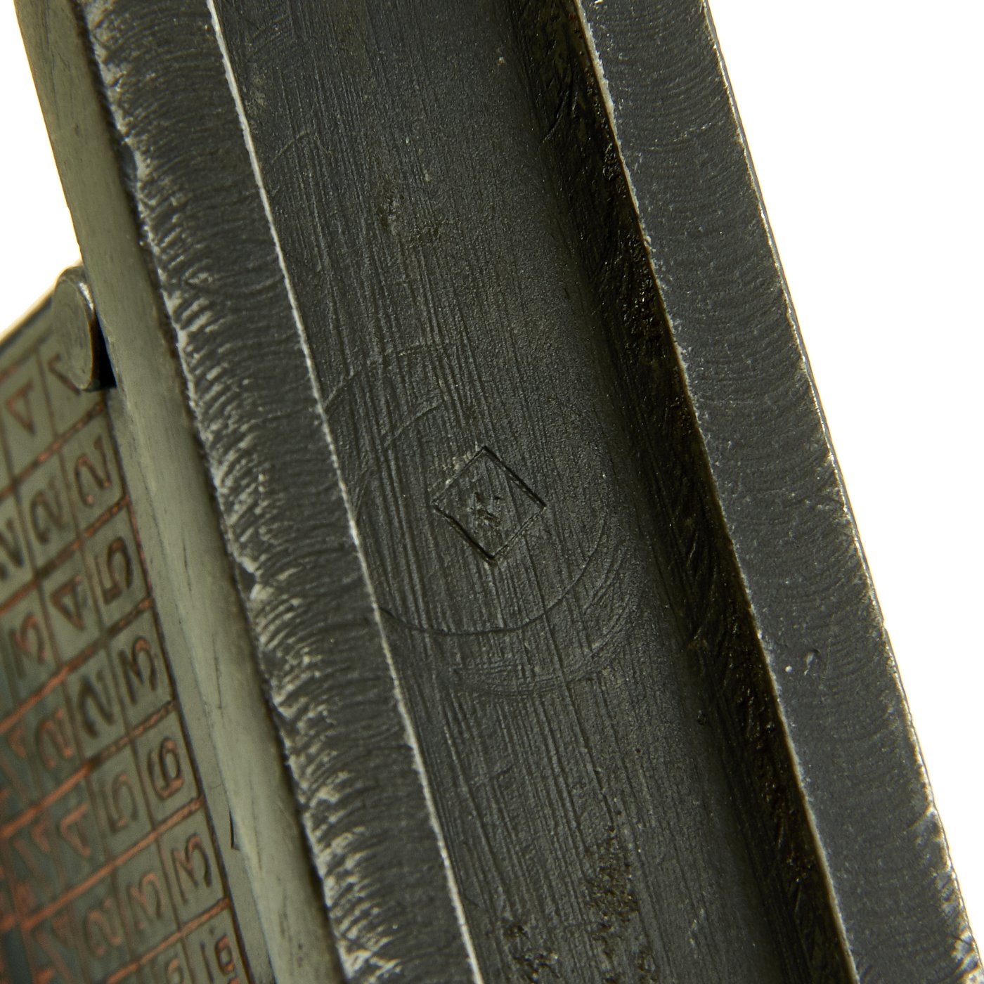 The rear sight is covered in a host of markings and scales and is dated 1953. Below this is the serial number КУ934, and above this is an arrow in a triangle for the Izhevsk Mechanical Plant (Russian: Ижевский Механический Завод, Izhevsky Mekhancheskiy Zavod). This plant was founded in 1942 to manufacture small arms.