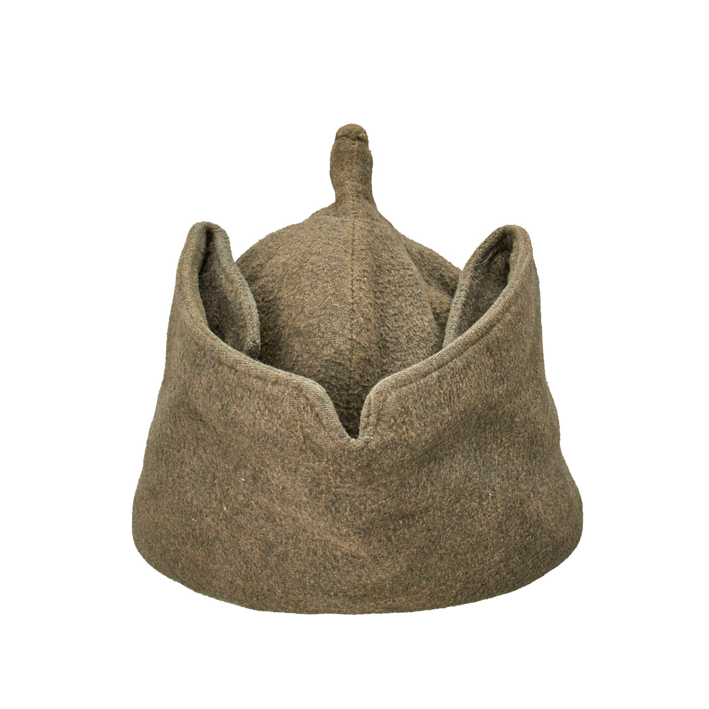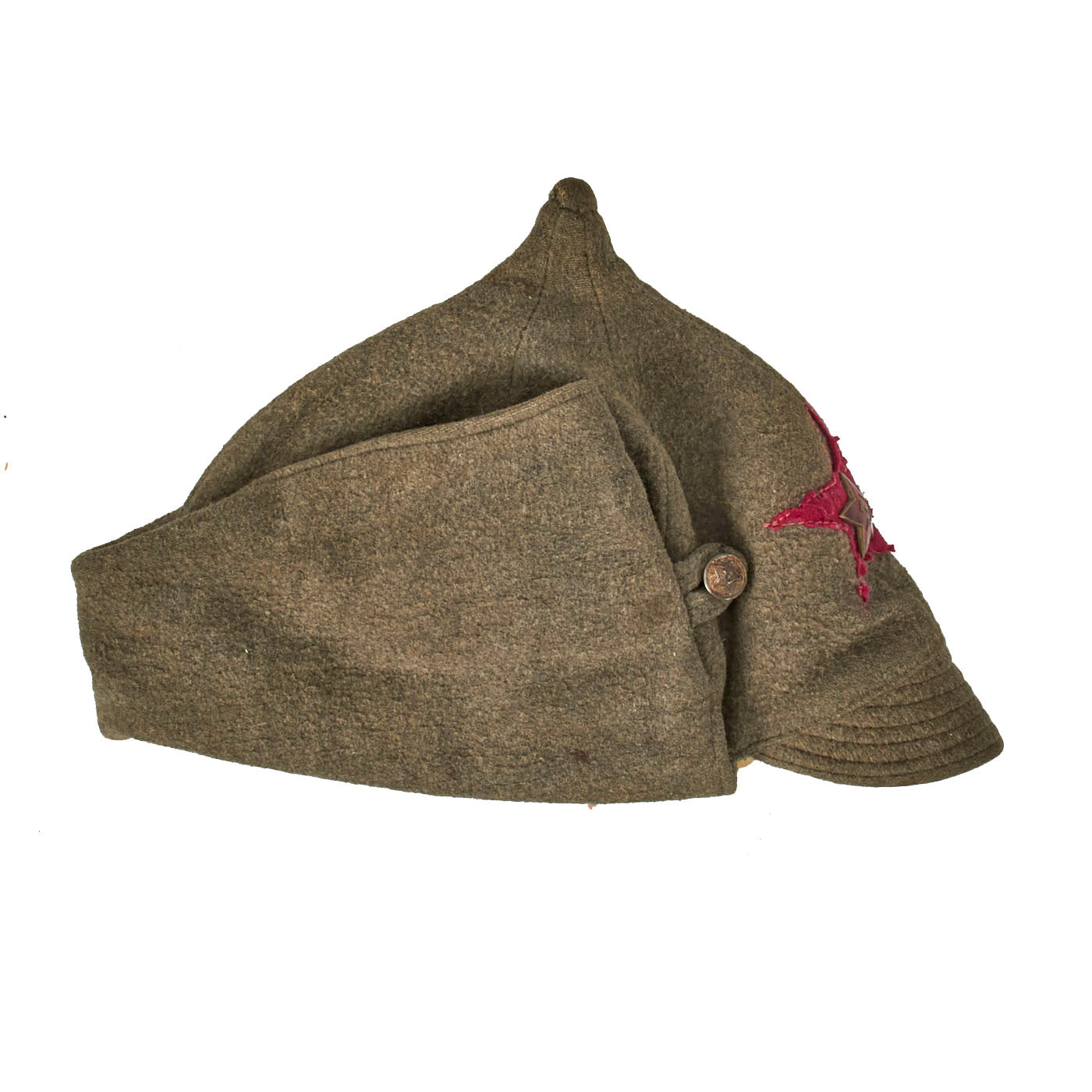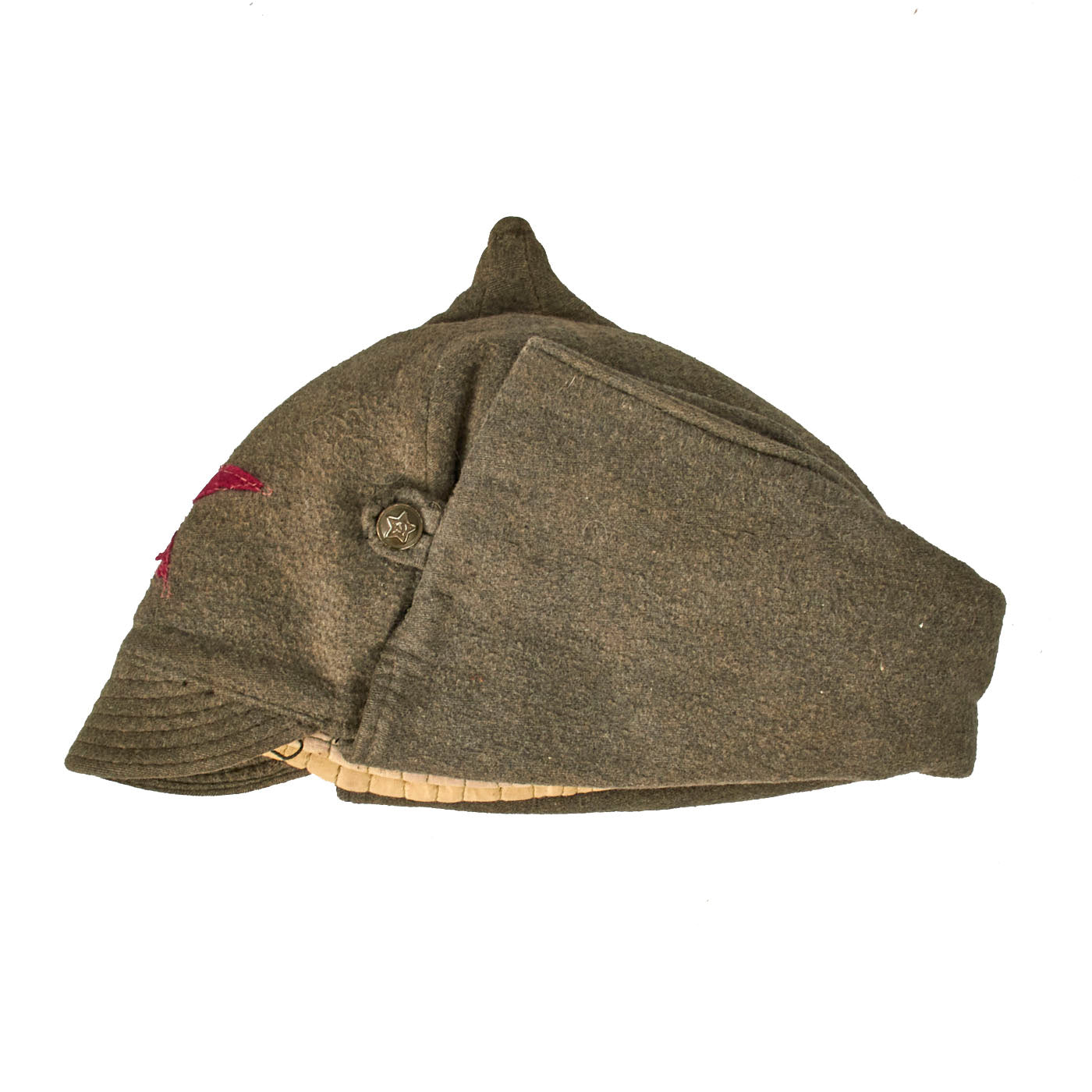 Original Item: Only One Available. A budenovka (Russian: будёновка, tr. budyonovka) is a distinctive type of hat, an archetypal part of the Communist military uniforms of the Russian Civil War (1917-1922) and later conflicts. Its official name was the "broadcloth helmet" (шлем суконный). Named after Red cavalry commander Semyon Budyonny, it was also known as the "frunzenka" after the Commissar Mikhail Frunze. It is a soft, woolen hat that covers the ears and neck. The cap features a peak and folded ear flaps that can be buttoned under the chin.
