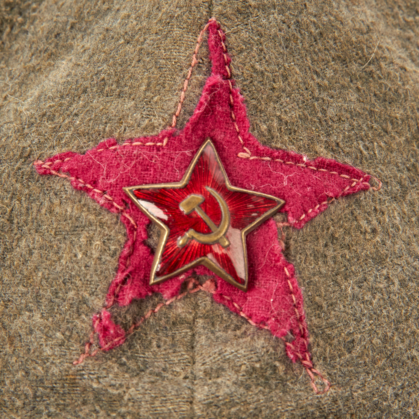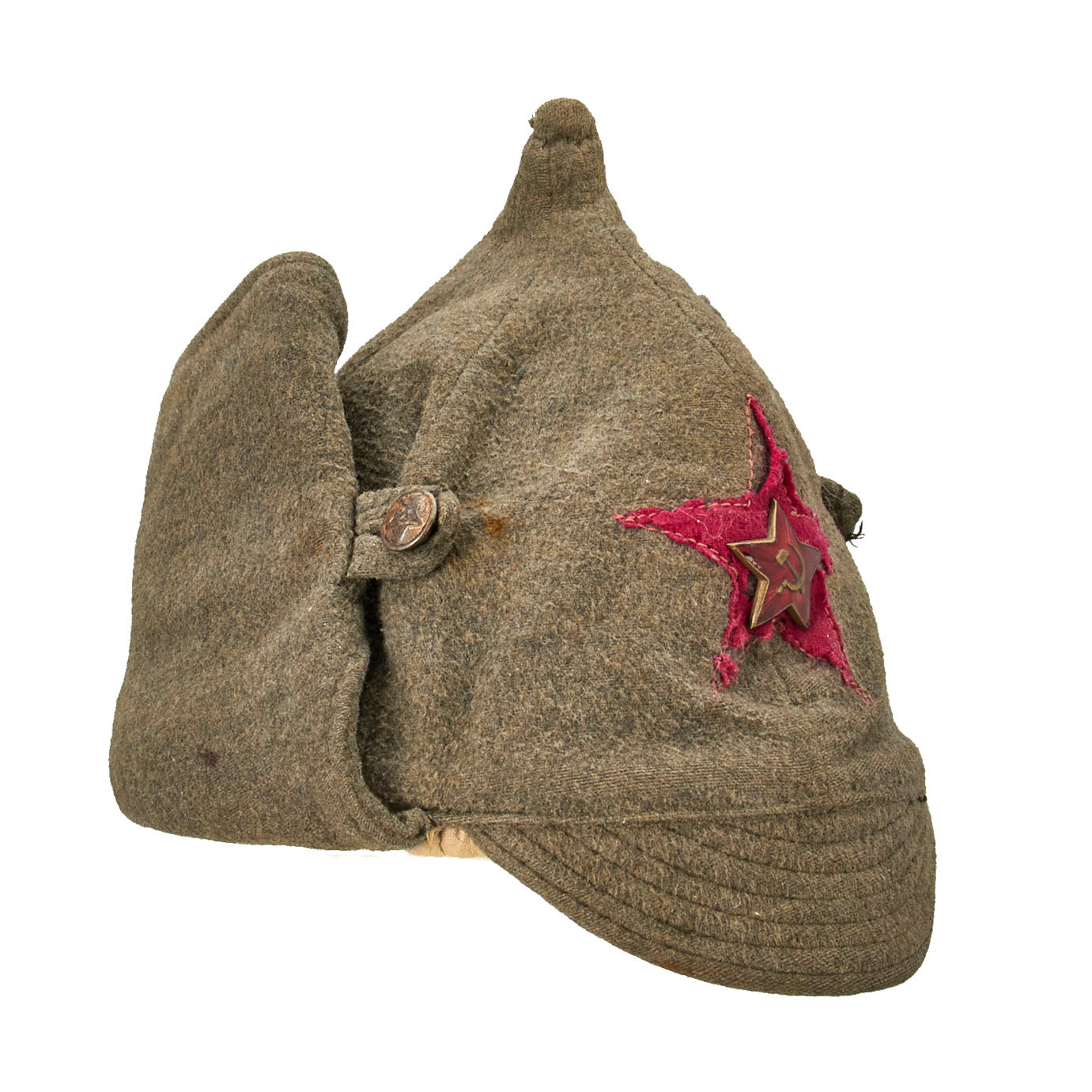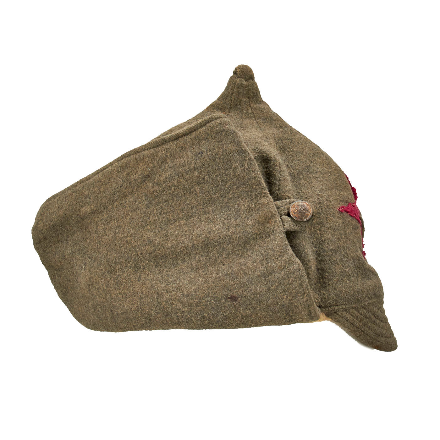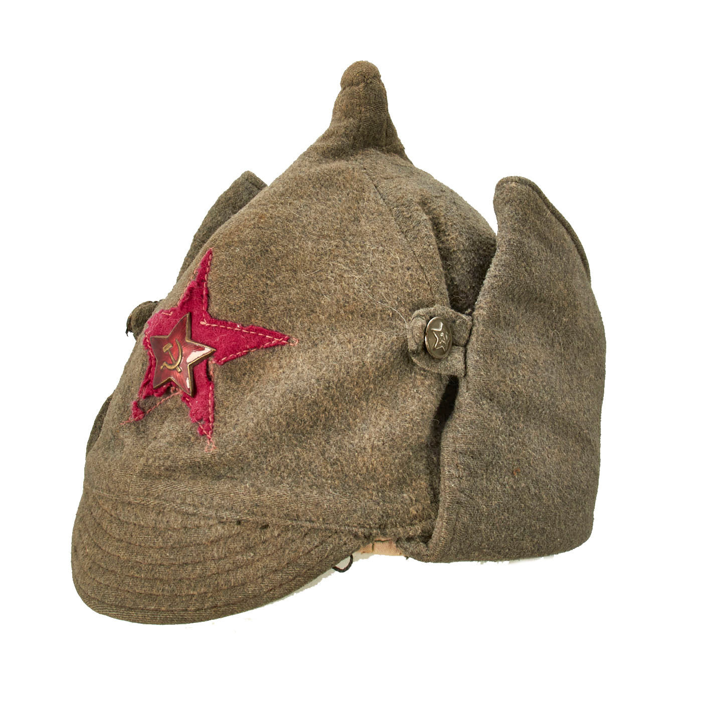 Original Item: Only One Available. A budenovka (Russian: будёновка, tr. budyonovka) is a distinctive type of hat, an archetypal part of the Communist military uniforms of the Russian Civil War (1917-1922) and later conflicts. Its official name was the "broadcloth helmet" (шлем суконный). Named after Red cavalry commander Semyon Budyonny, it was also known as the "frunzenka" after the Commissar Mikhail Frunze. It is a soft, woolen hat that covers the ears and neck. The cap features a peak and folded ear flaps that can be buttoned under the chin.