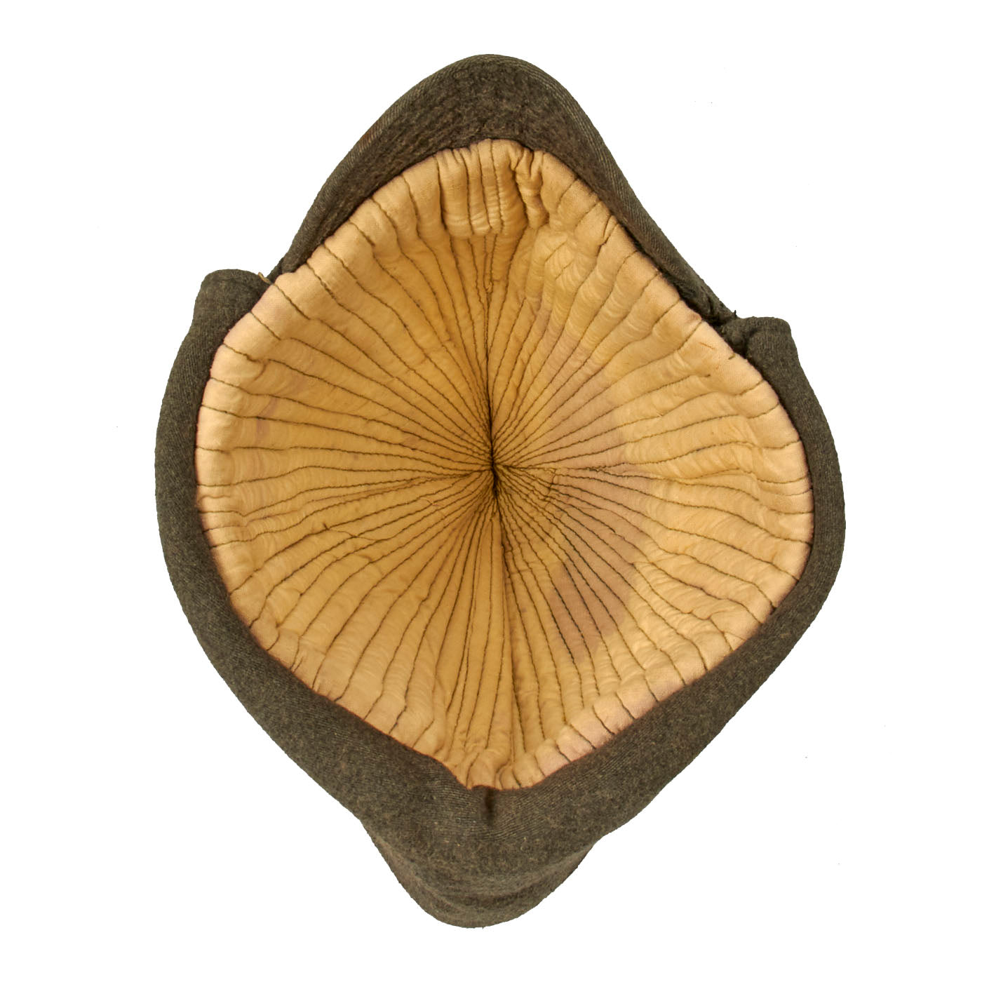 This is a very nice example of a Pre WWII Issue Model 27 Budenovka Winter Cap, which is in very nice gently used condition. The exterior is made from dark gray wool, and it has a small fabric visor on the front. It has a raspberry colored star sewn on the front, which has a Soviet Red Star pinned in place. The star shows mostly intact enamel and is made of non-ferrous metal. Unfortunately the wool star has quite a bit of moth nips on it.