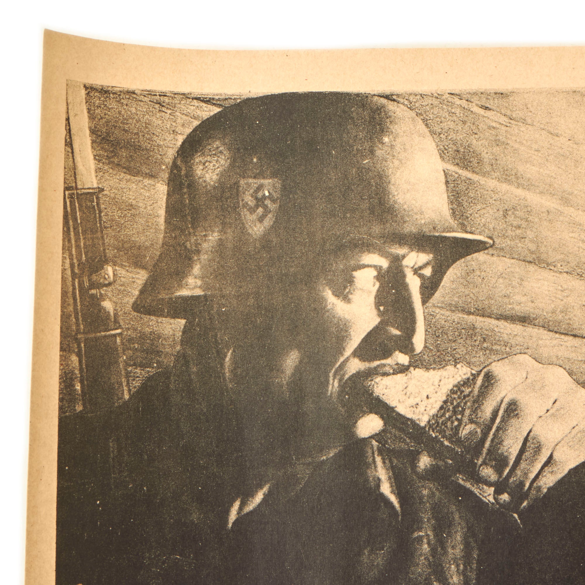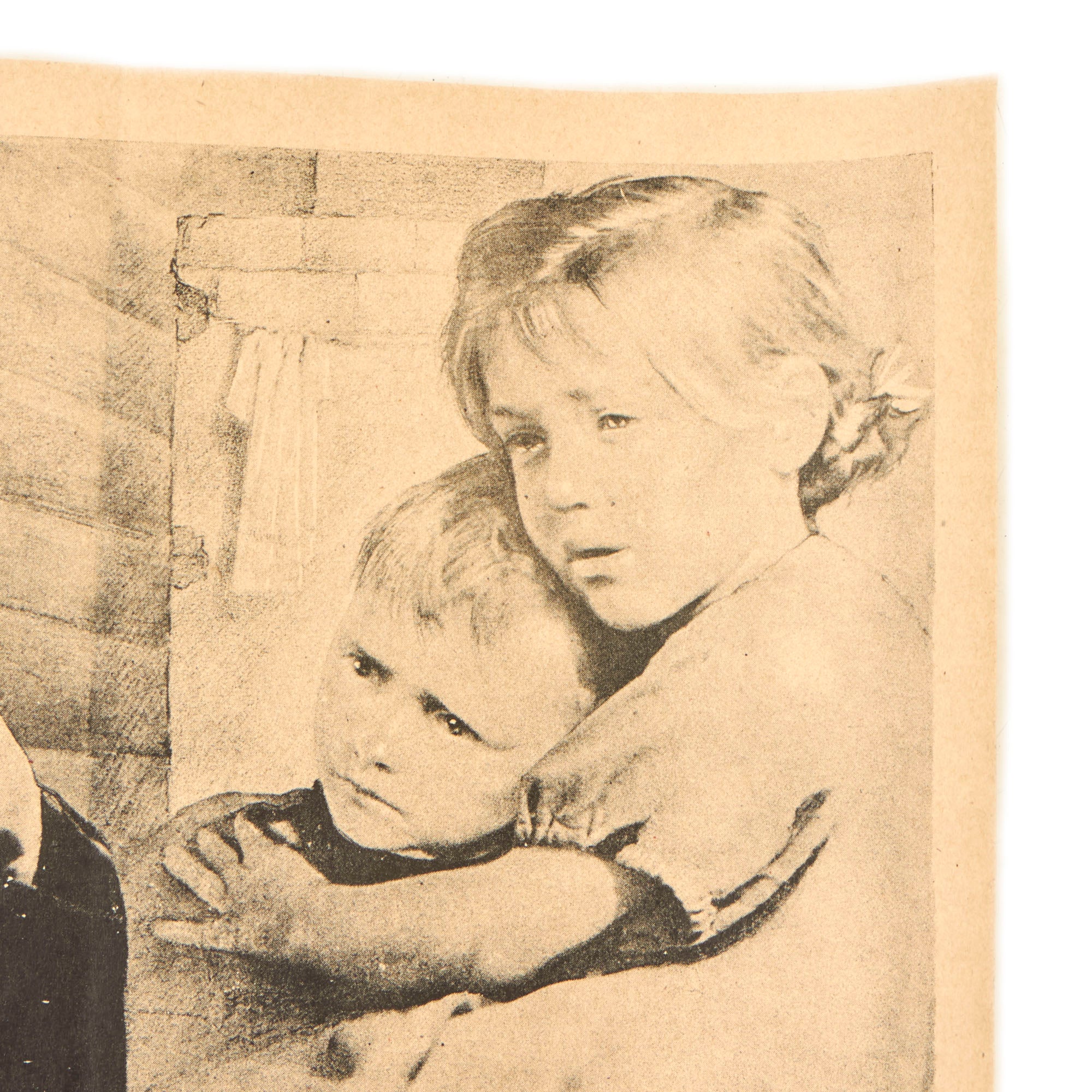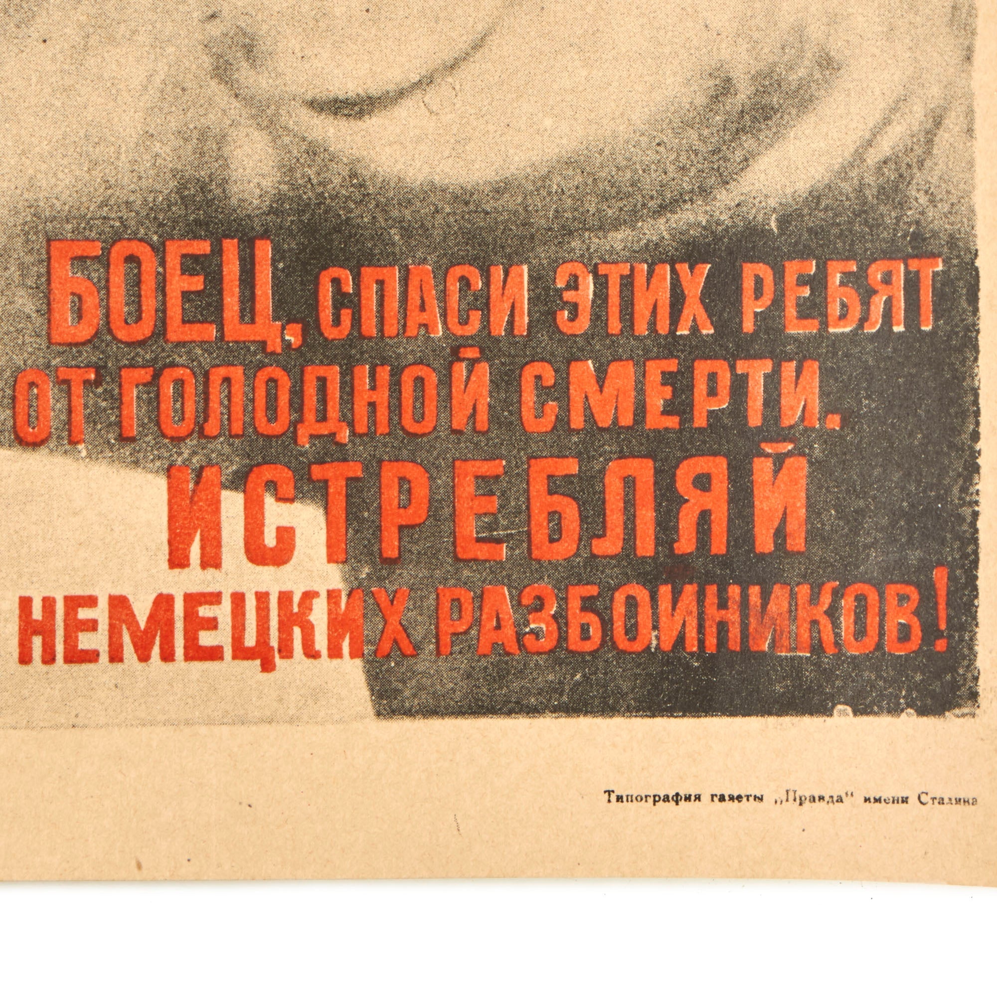 Original Item. Only One Available. This is a fantastic & scarce Soviet poster dated 1943 from the “Great Patriotic War”, World War II. The poster depicts a German soldier eating bread in front of two starving children. The caption translates to