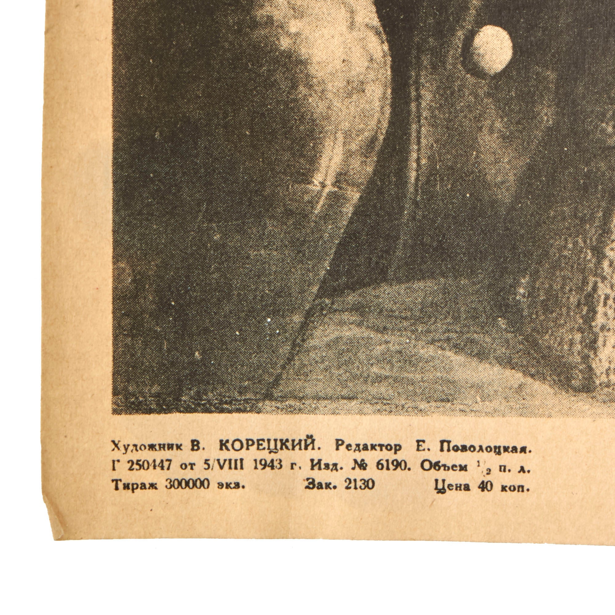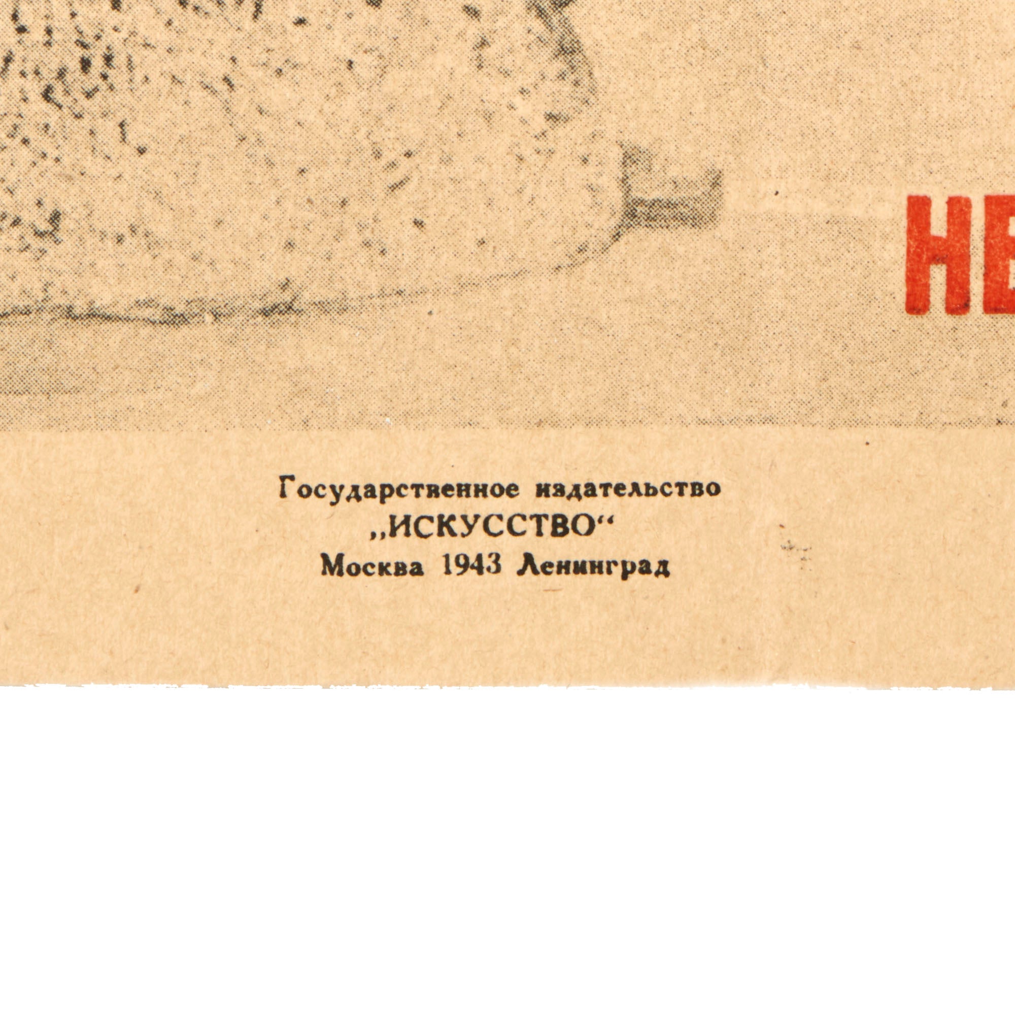 The poster measures roughly 11¼ x 13½”, and is dated 1943. It was designed by Viktor Koretsky and printed by Iskysstvo Moscow. The poster doesn’t appear to have any serious folding and is in fantastic shape overall. A very iconic WWII poster, the first of this example we have offered. Comes ready for further research and display