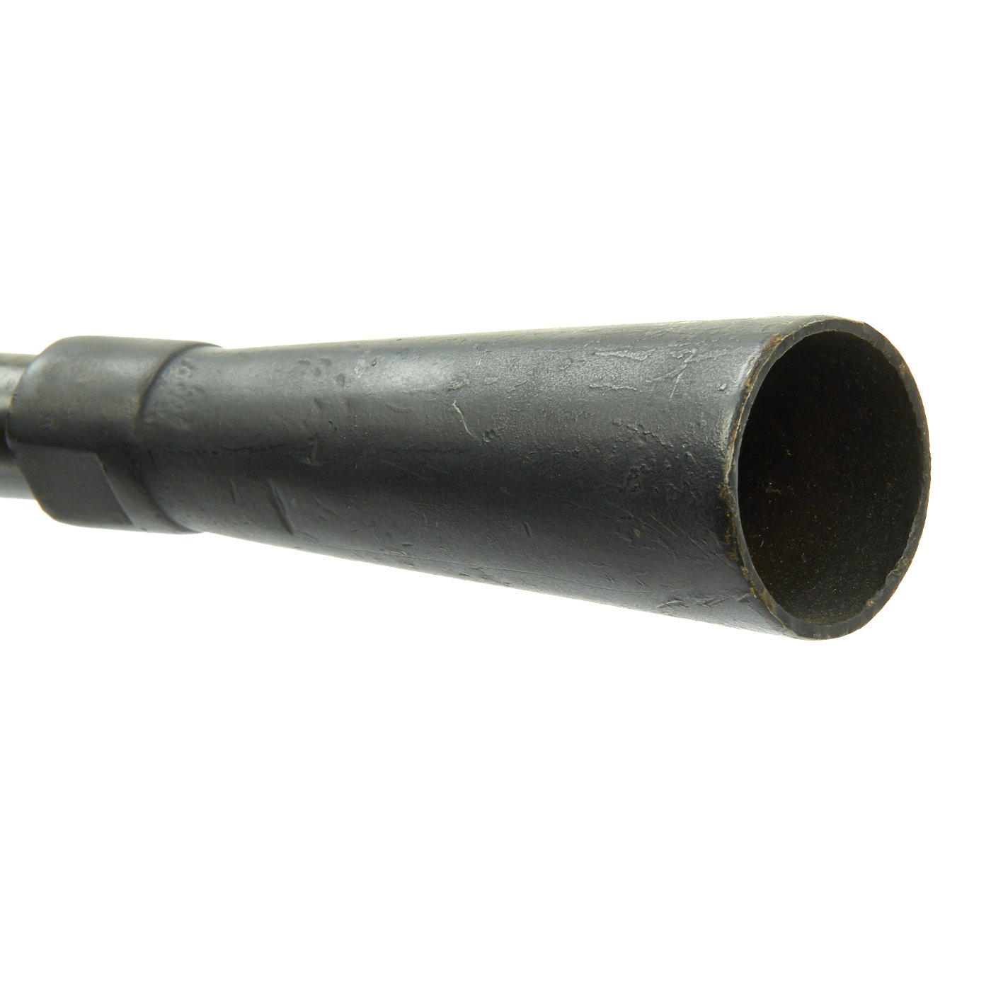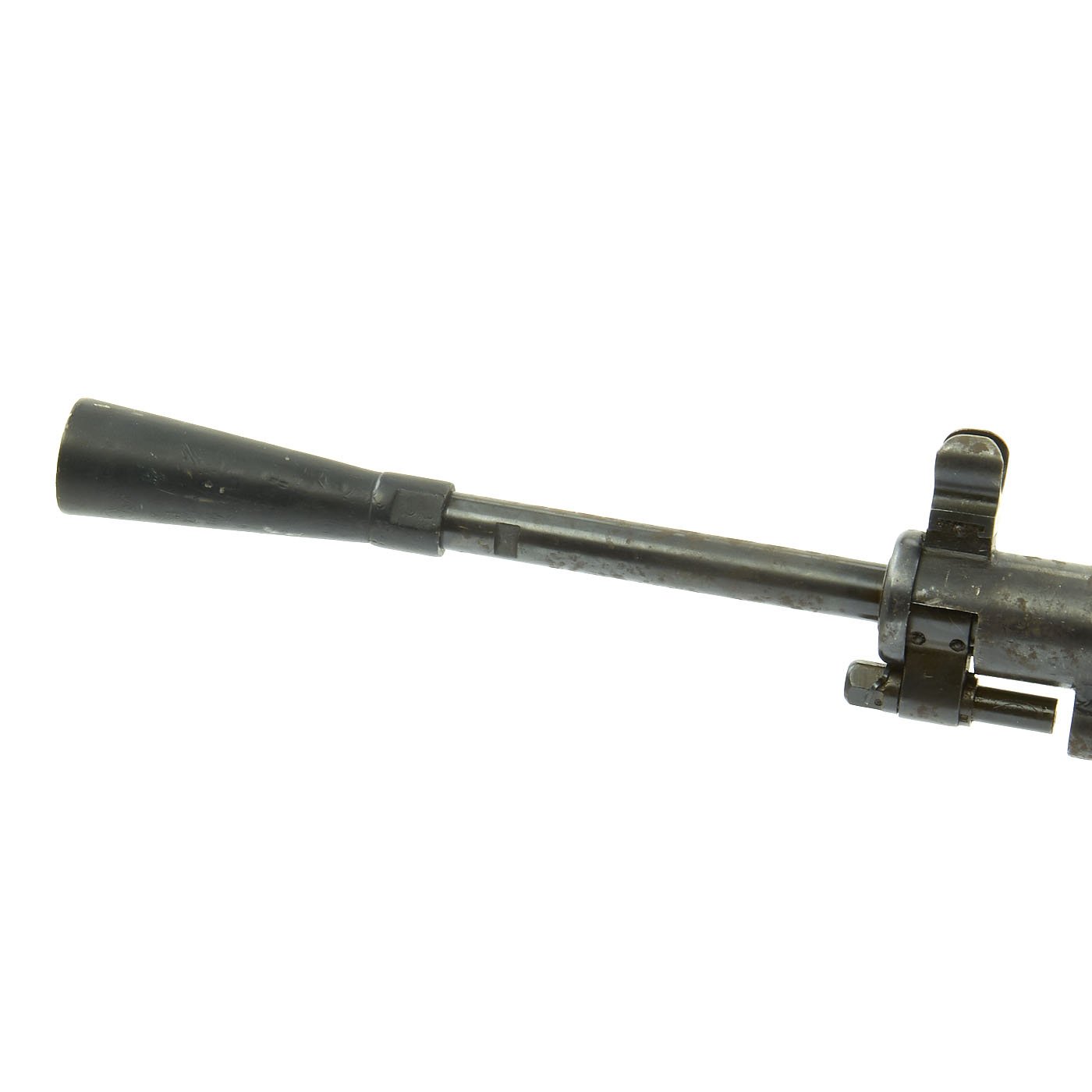 This display gun is constructed of all original parts on a totally inert solid aluminum dummy reciever. It is fully approved by the BATF and can be purchased without a license. Condition is very nice, with a very good condition Buttstock, which still has the original oil bottle with brush installed. The pistol grip is in equally excellent condition, with little wear and great ribbing. The Metal finish is good, making this a choice example. There is also a very interesting sticker in Russian applied to the pan magazine.