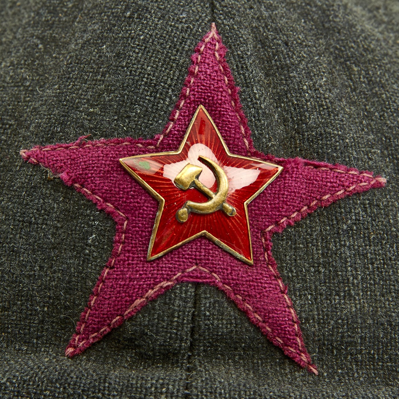 This is a very nice example of a WWII Issue Model 36 Budenovka Winter Cap, which is in very nice gently used condition. The exterior is made from dark gray wool, and it has a small fabric visor on the front. It has a raspberry colored star sewn on the front, which has a Soviet Red Star pinned in place. The star shows mostly intact enamel and is made of non-ferrous metal.