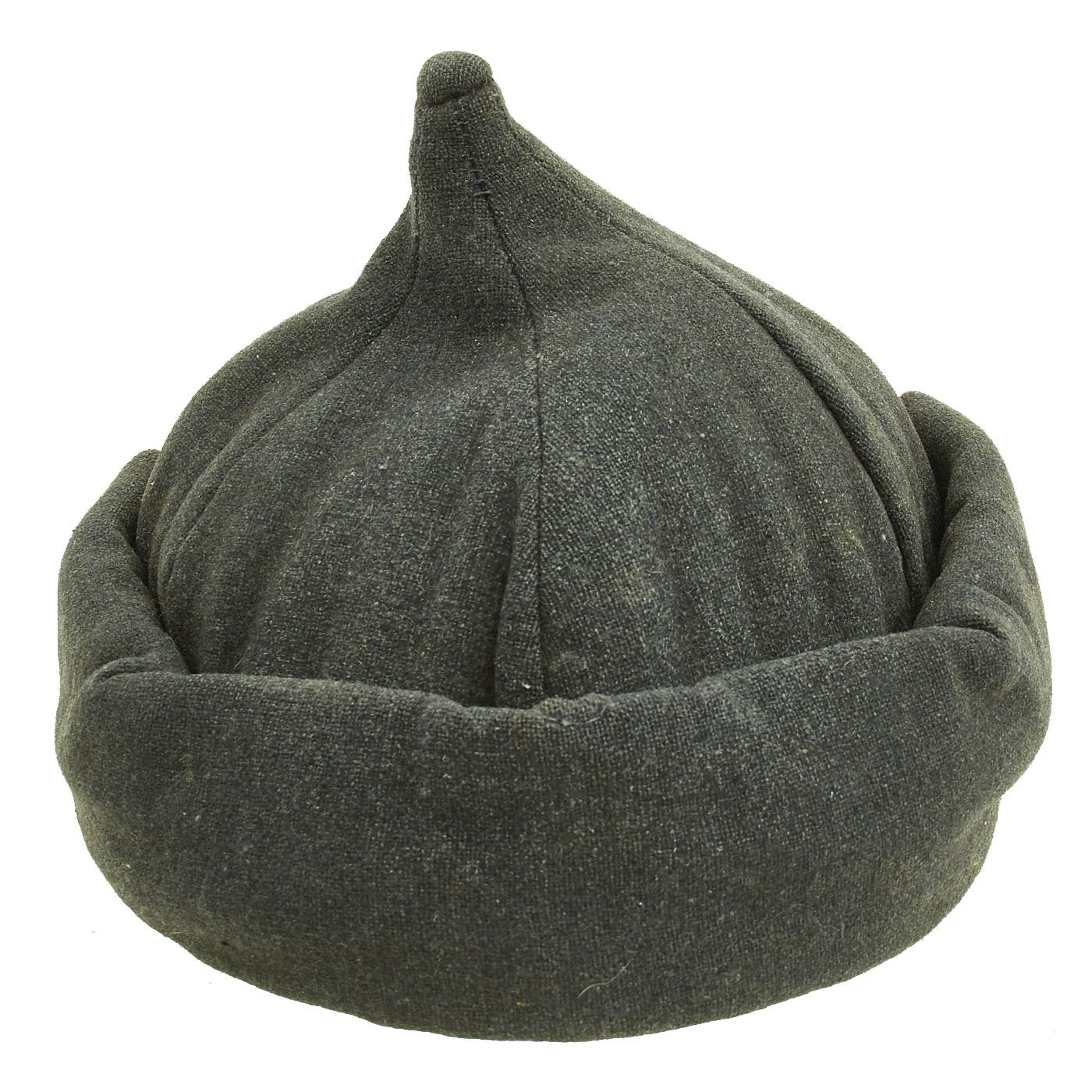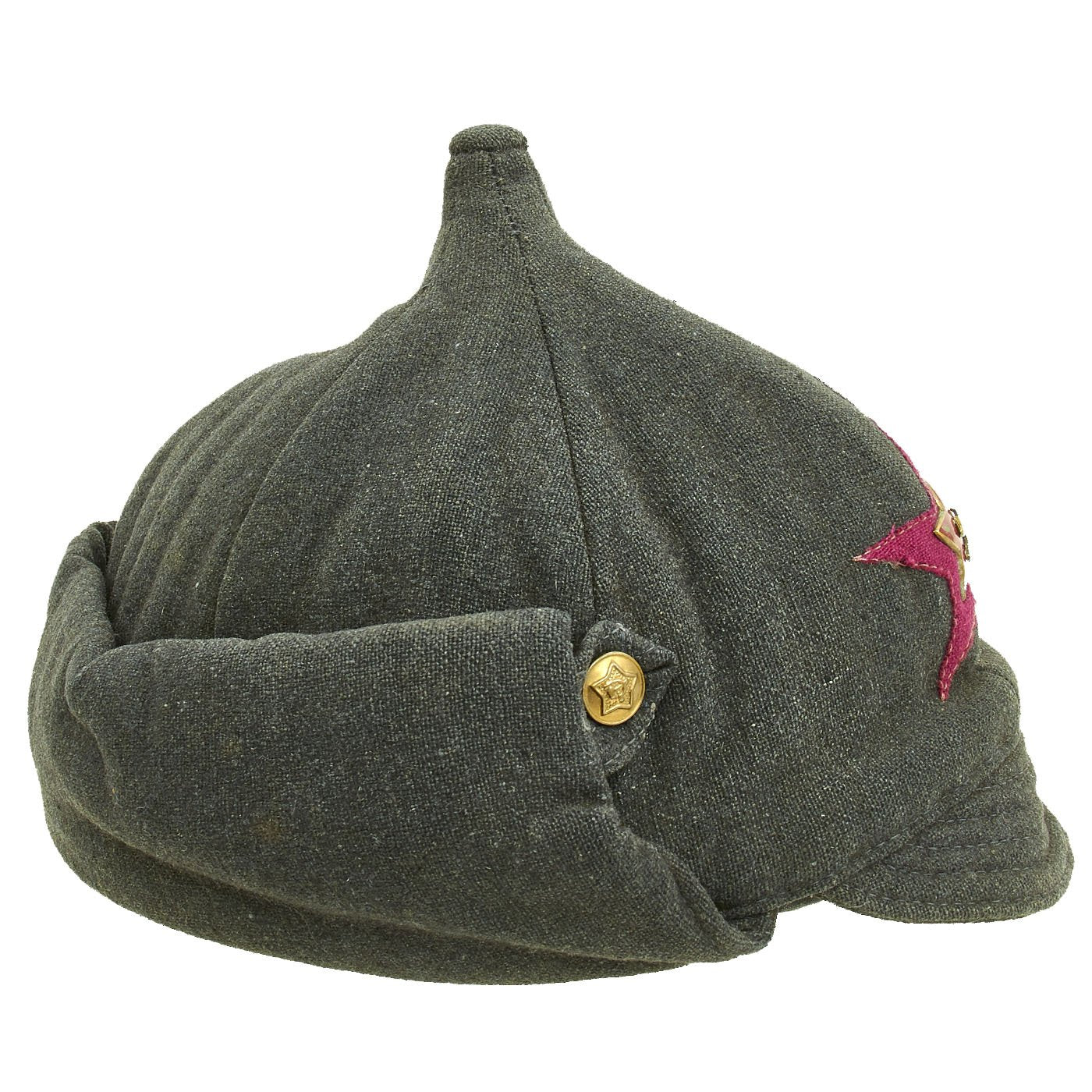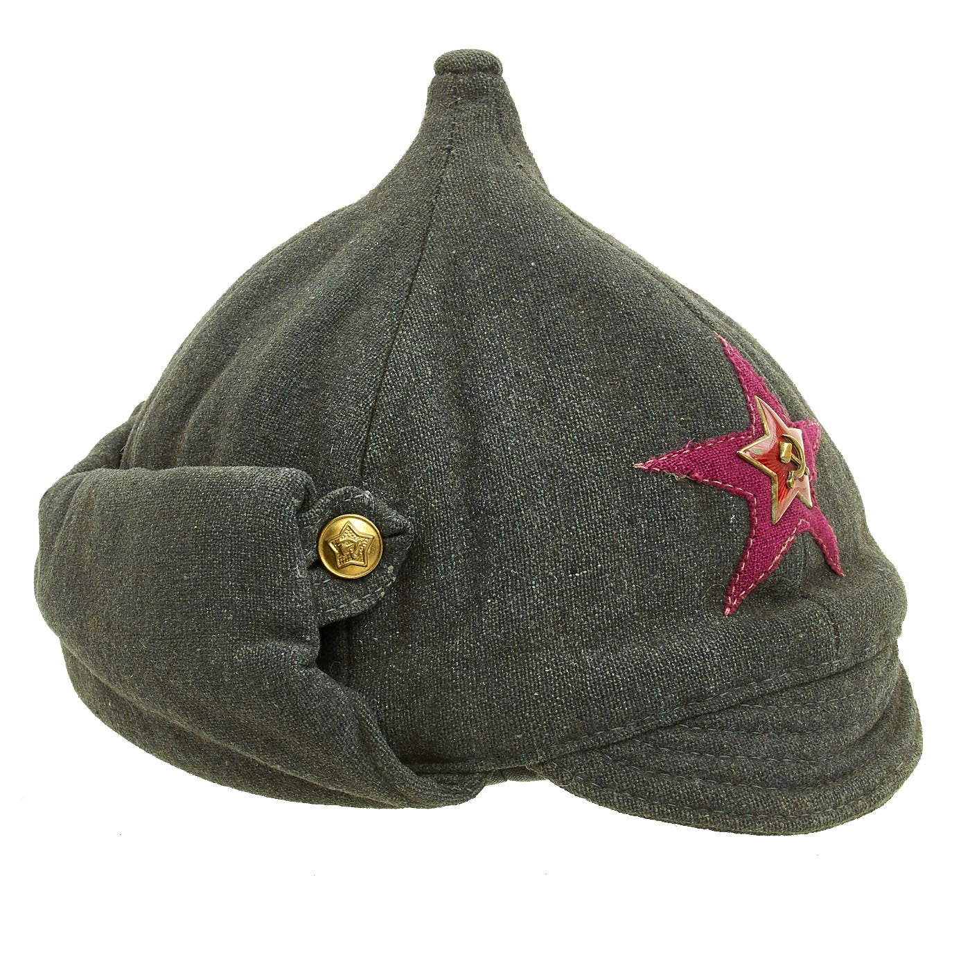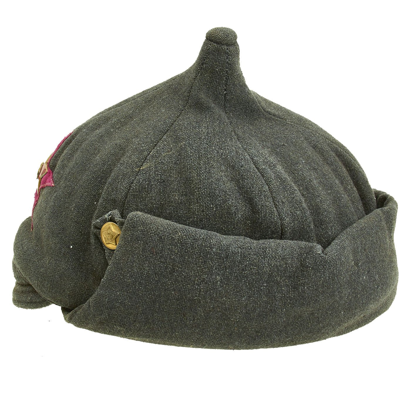 Original Item: Only One Available. A budenovka (Russian: будёновка, tr. budyonovka) is a distinctive type of hat, an archetypal part of the Communist military uniforms of the Russian Civil War (1917-1922) and later conflicts. Its official name was the "broadcloth helmet" (шлем суконный). Named after Red cavalry commander Semyon Budyonny, it was also known as the "frunzenka" after the Commissar Mikhail Frunze. It is a soft, woolen hat that covers the ears and neck. The cap features a peak and folded earflaps that can be buttoned under the chin.