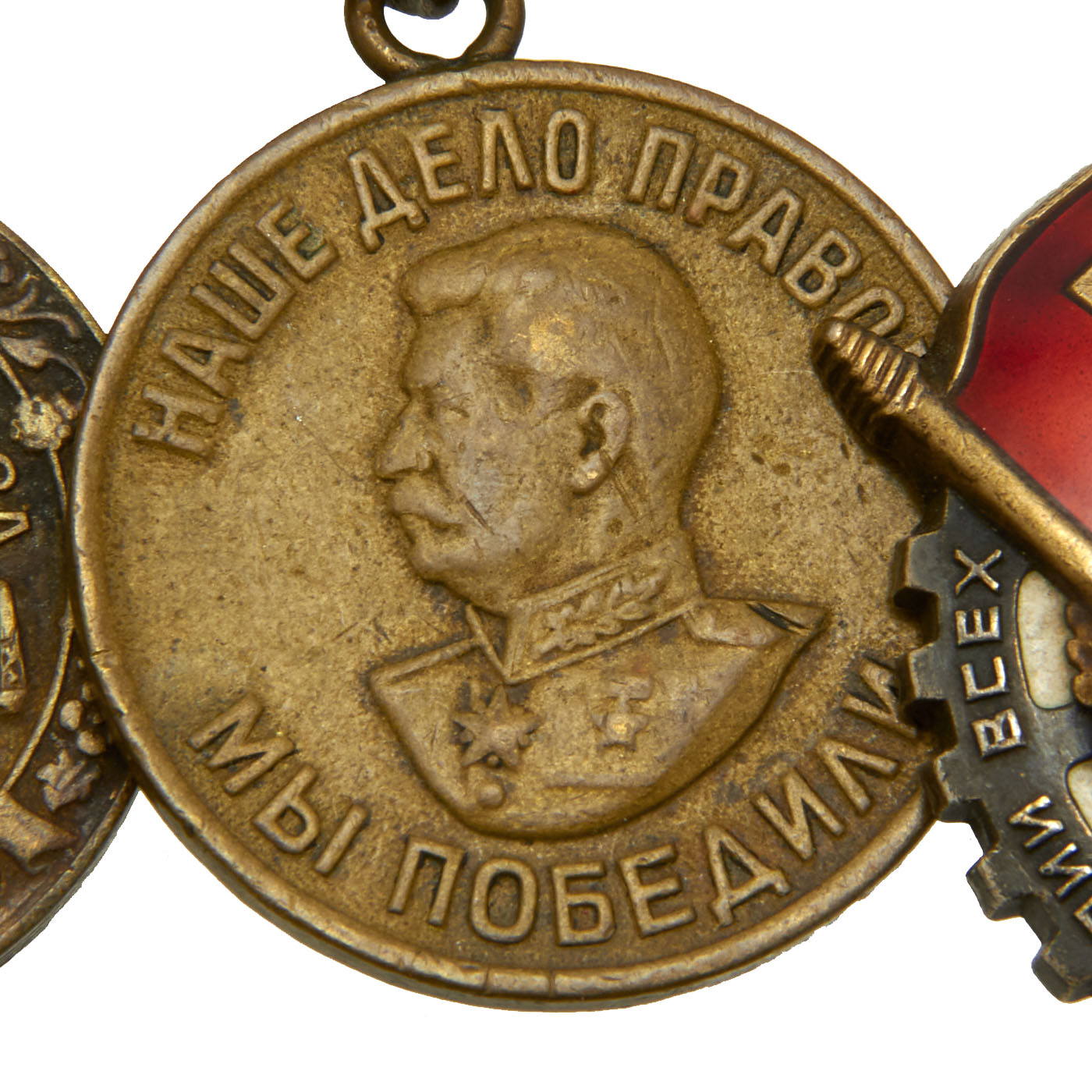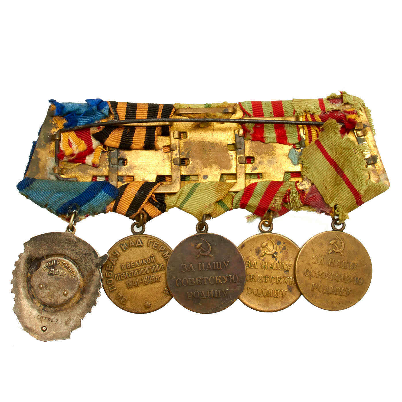 Original Items: Only One Set Available. This is a lovely ribbon bar set of 5 medals from the Soviet Union during WWII. Awards and decorations of the Soviet Union are decorations from the former Soviet Union that recognised achievements and personal accomplishments, both military and civilian. Some of the awards, decorations, and orders were discontinued after the dissolution of the Soviet Union, while others are still issued by the Russian Federation as of 2021. Many of the awards were simply reworked in the Russian Federation, such as the transition of Hero of the Soviet Union to Hero of the Russian Federation, and Hero of Socialist Labor to Hero of Labor of the Russian Federation. A wide range of Soviet awards and decorations cover the extensive and diverse period of history from 1917 to 1991.