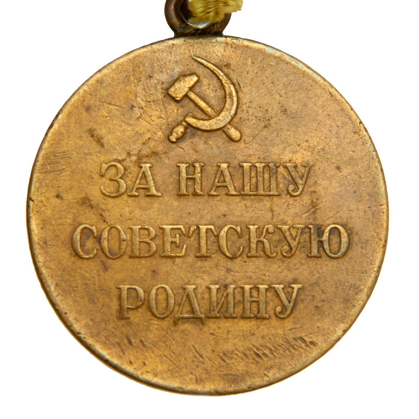 On the reverse near the top, the relief image of the hammer and sickle, below the image, the relief inscription in three rows «ЗА НАШУ СОВЕТСКУЮ РОДИНУ» (“FOR OUR SOVIET MOTHERLAND”).