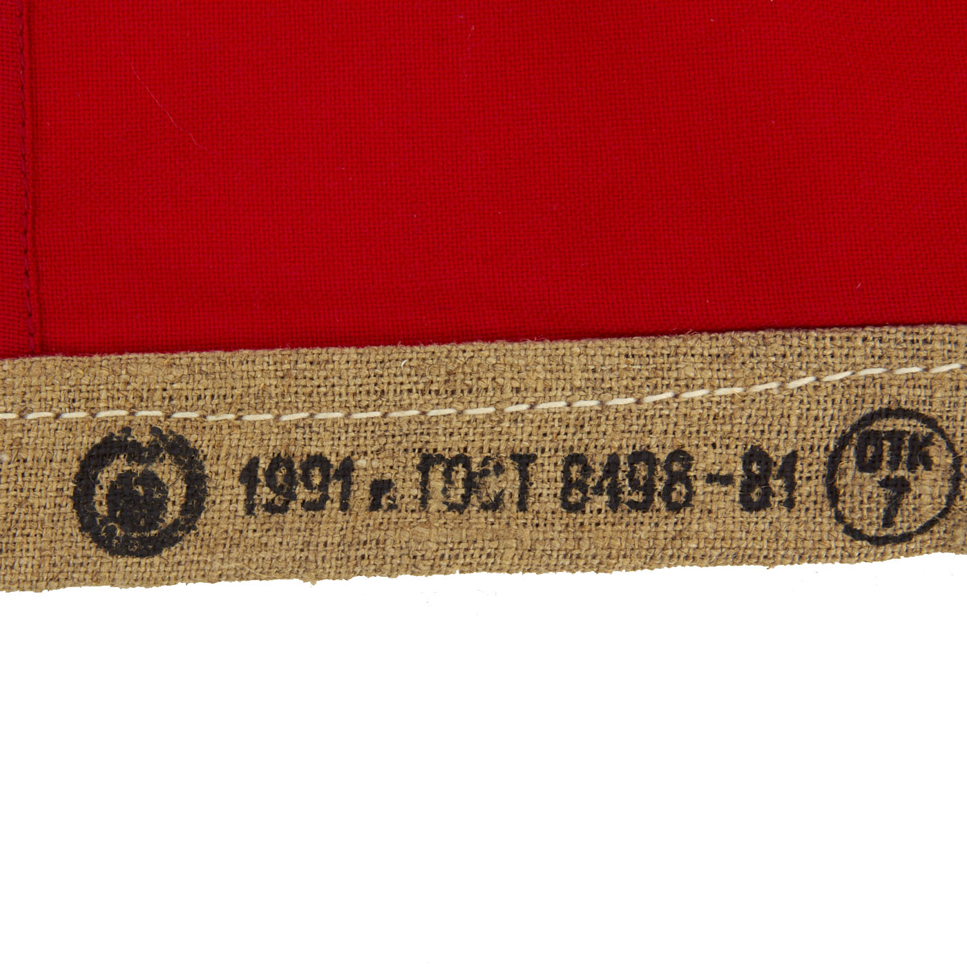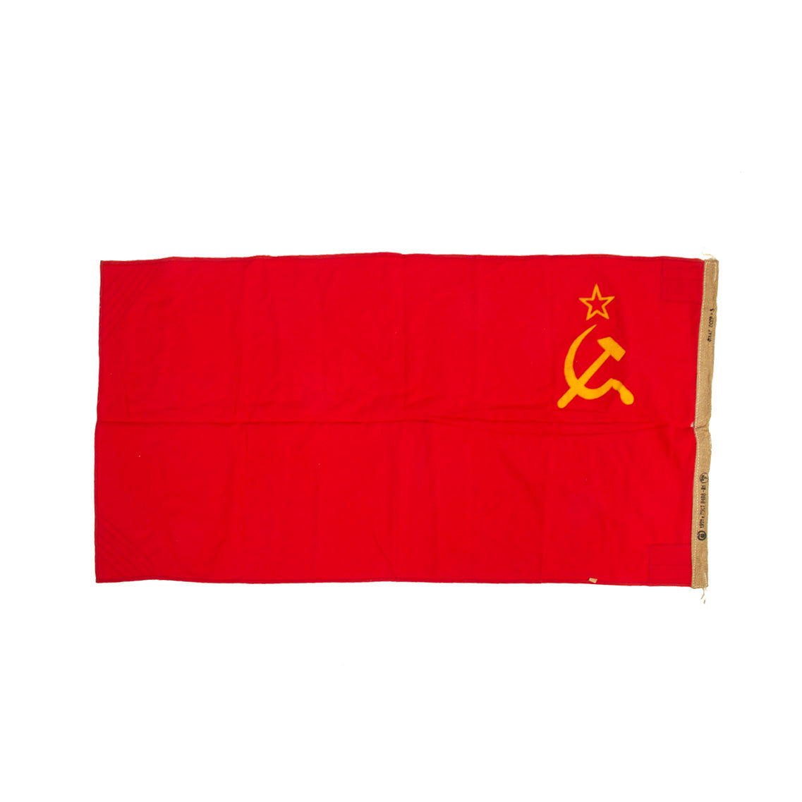 Both flags are in excellent condition with minor fading and moth nips. On the canvas reinforced hoist side on the larger of the two, there are the usual Soviet markings and the date stamp for October 1991.