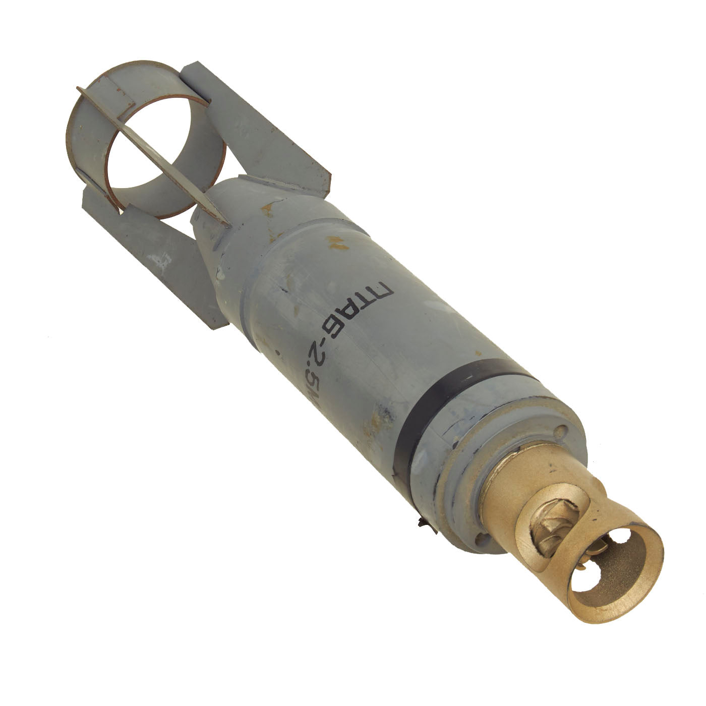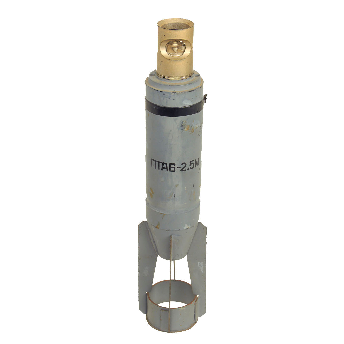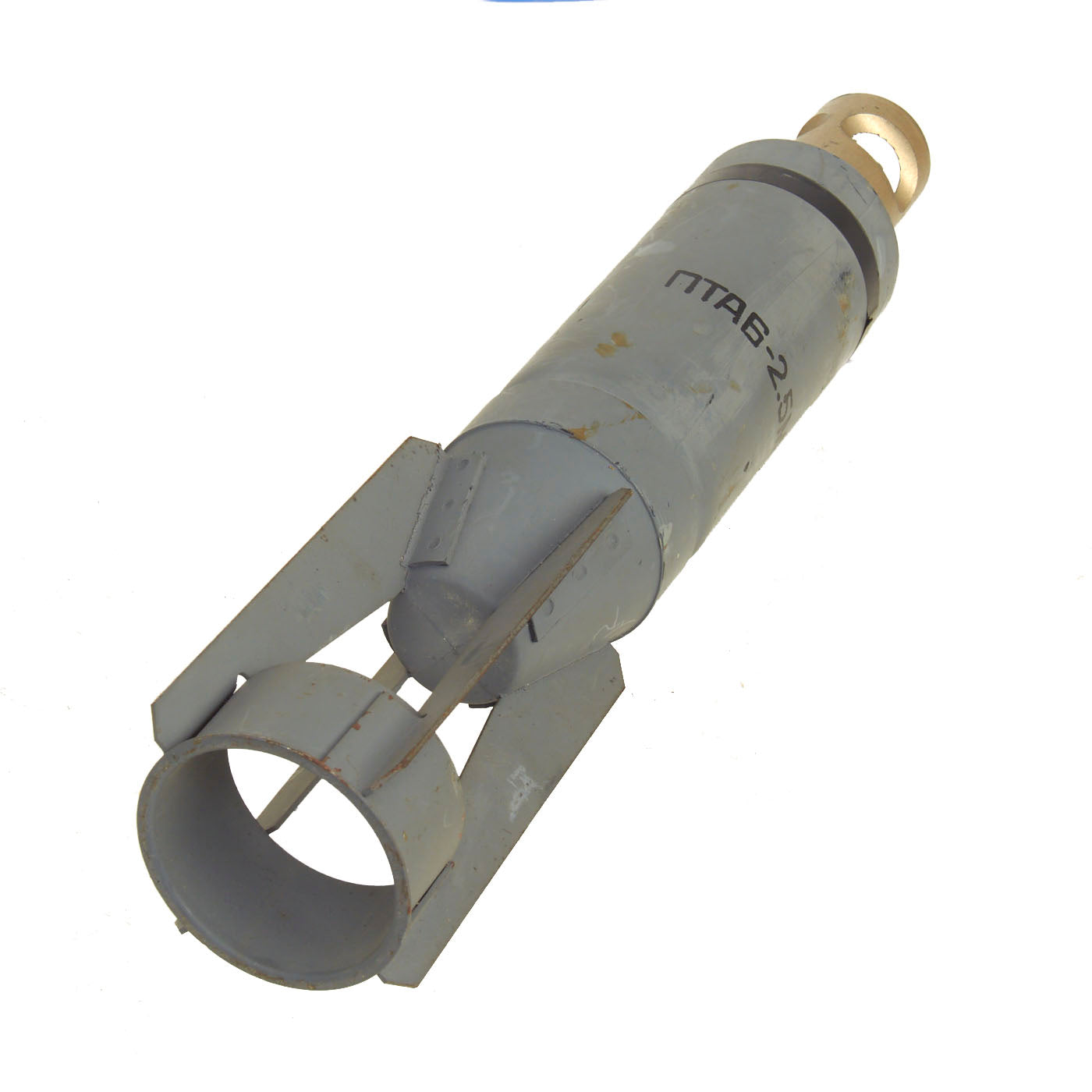 Original Item: Only One Available. PTAB (Russian ПТАБ, short for Противотанковая Авиабомба, "Antitank Aviation Bomb") was a Soviet World War II design of a shaped charge bomb. The bomb was designed within a case of 2.5 kg bomb with real weight of 1.5 kg and 0.62 kg of explosives. The Il-2 ground attack aircraft was capable of carrying 280 PTAB bombs immediately on the bomb-bay folds, or 4x48 in four cassettes. The PTAB 2.5 was capable of penetrating 60 to 70 millimeter tank armor, at the time sufficient for the top-armor of even heavy tanks.