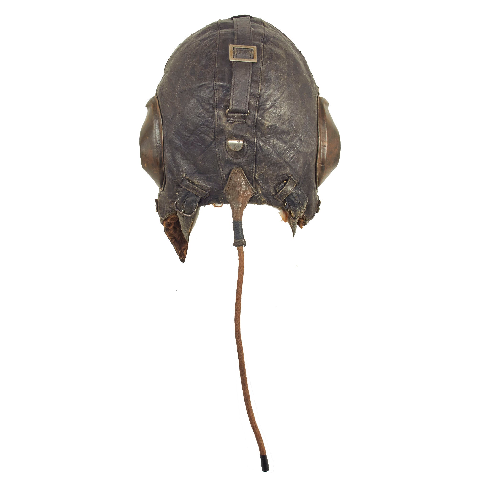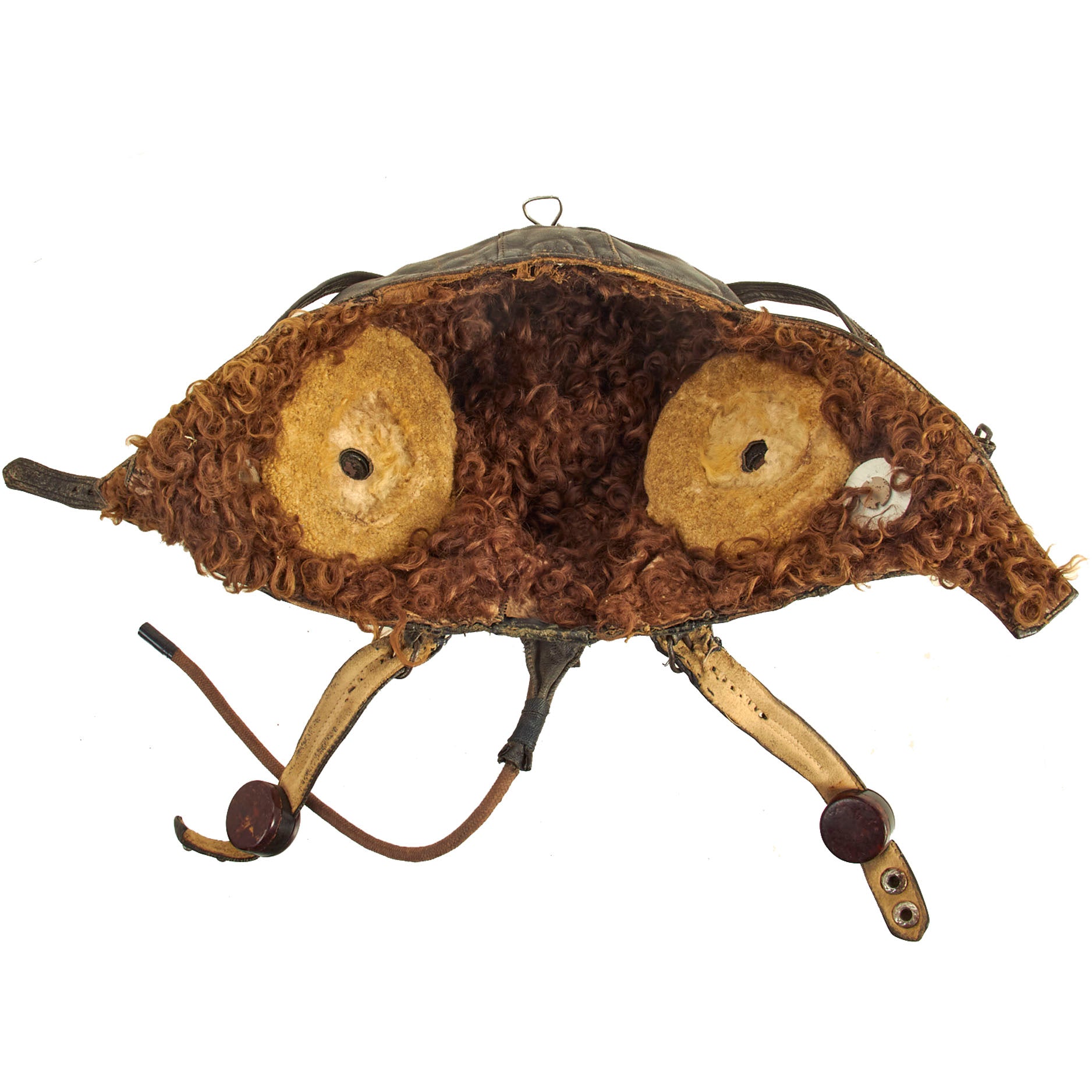 This is a very nice WWII Soviet Air Force Flight helmet, which looks to be a relatively early pattern, held over from the pre-war years. It has a brown fur liner, with what looks to be a shearling wool. It has a strap on either side to help give a tight fit around the head, with a chin strap to further secure it. The throat mic appears to be WWII German and was added by a previous owner, more than likely for display purposes.